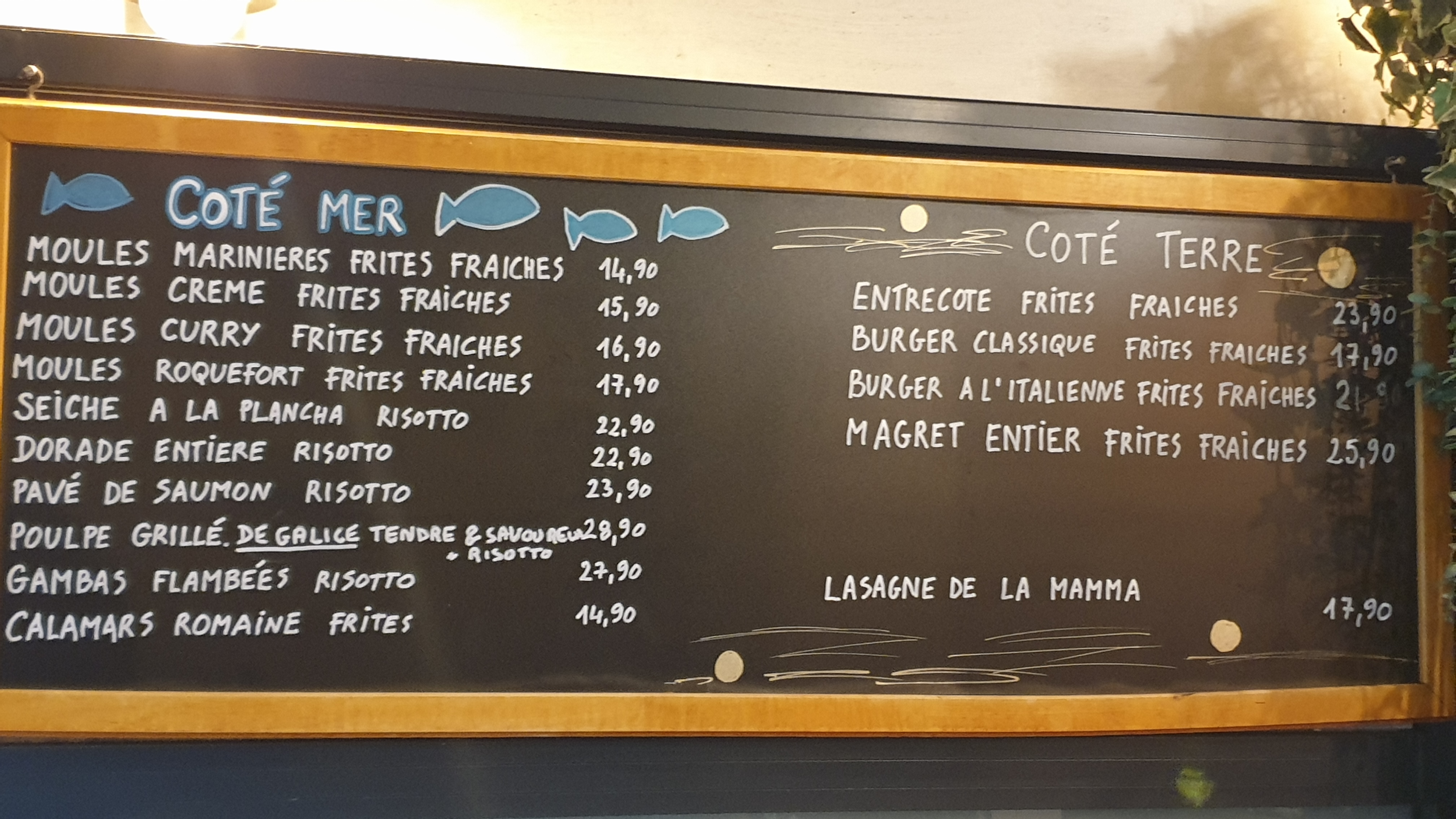 Le menu principal est fait de moules à toute les sauces. On y trouve des hamburgers , du loup de mer , du calamar. C est exquis.