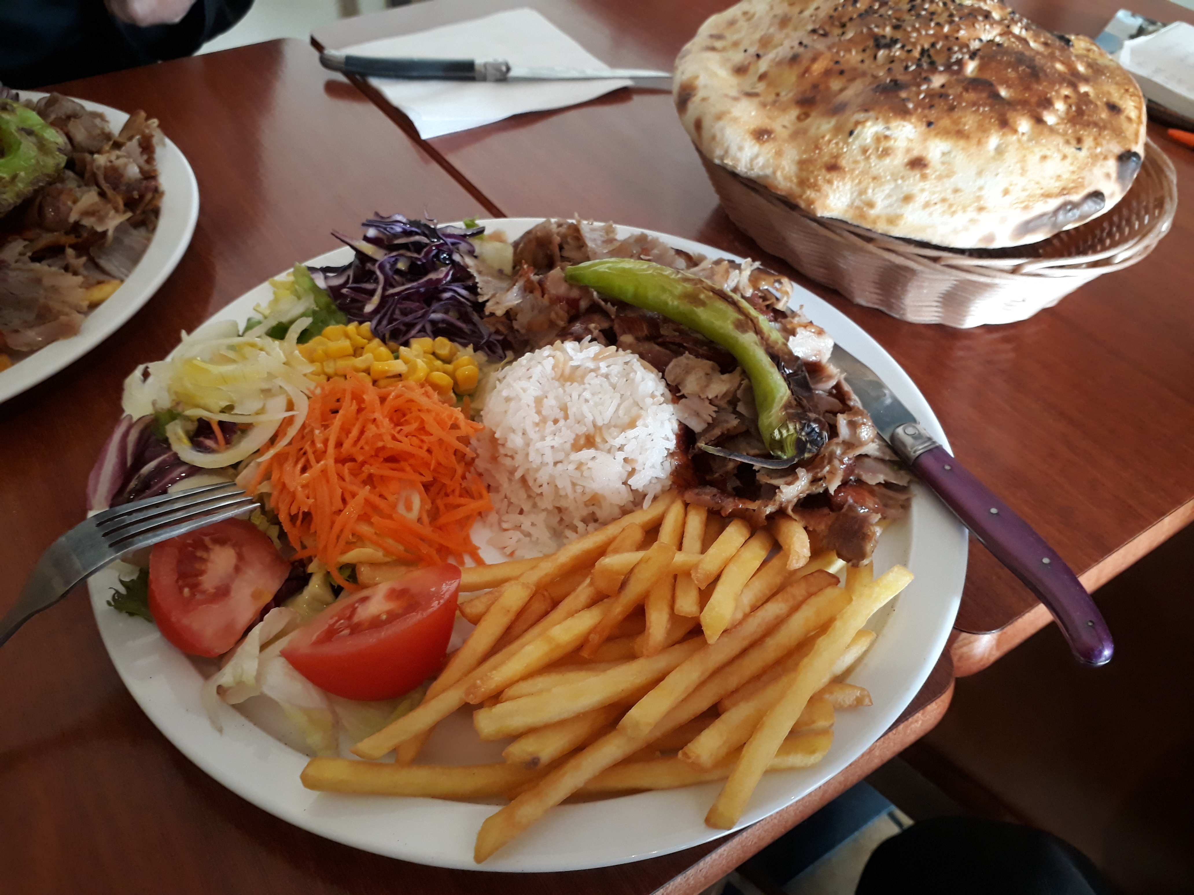 Bonne viande (du veau, broche faite maison) bien assaisonnée, portion généreuse et gérant très sympatique et une cuisinière au fourneau pour le pain et les pizzas. L'assiette Kebab est compléte : crudités variées, blé, viande et frites, avec du pain fait maison.