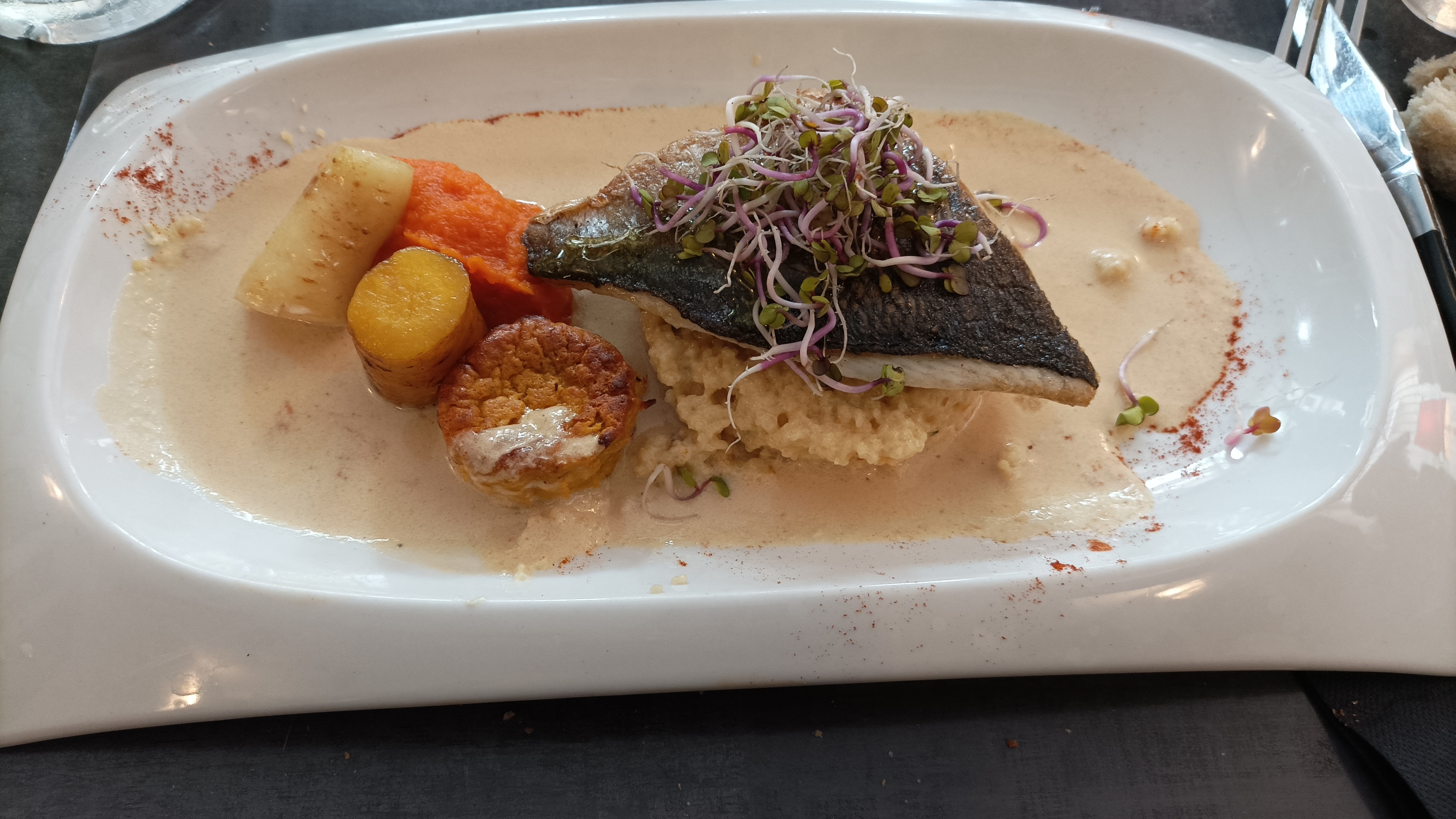 Plats succulents, nous avons pris un filet de maigre, parfait, et des chipirons à la plancha, super, ainsi que 2 crèmes de potirons, un régal! Le service chaleureux et souriant. En résumé une excellente étape à recommander.