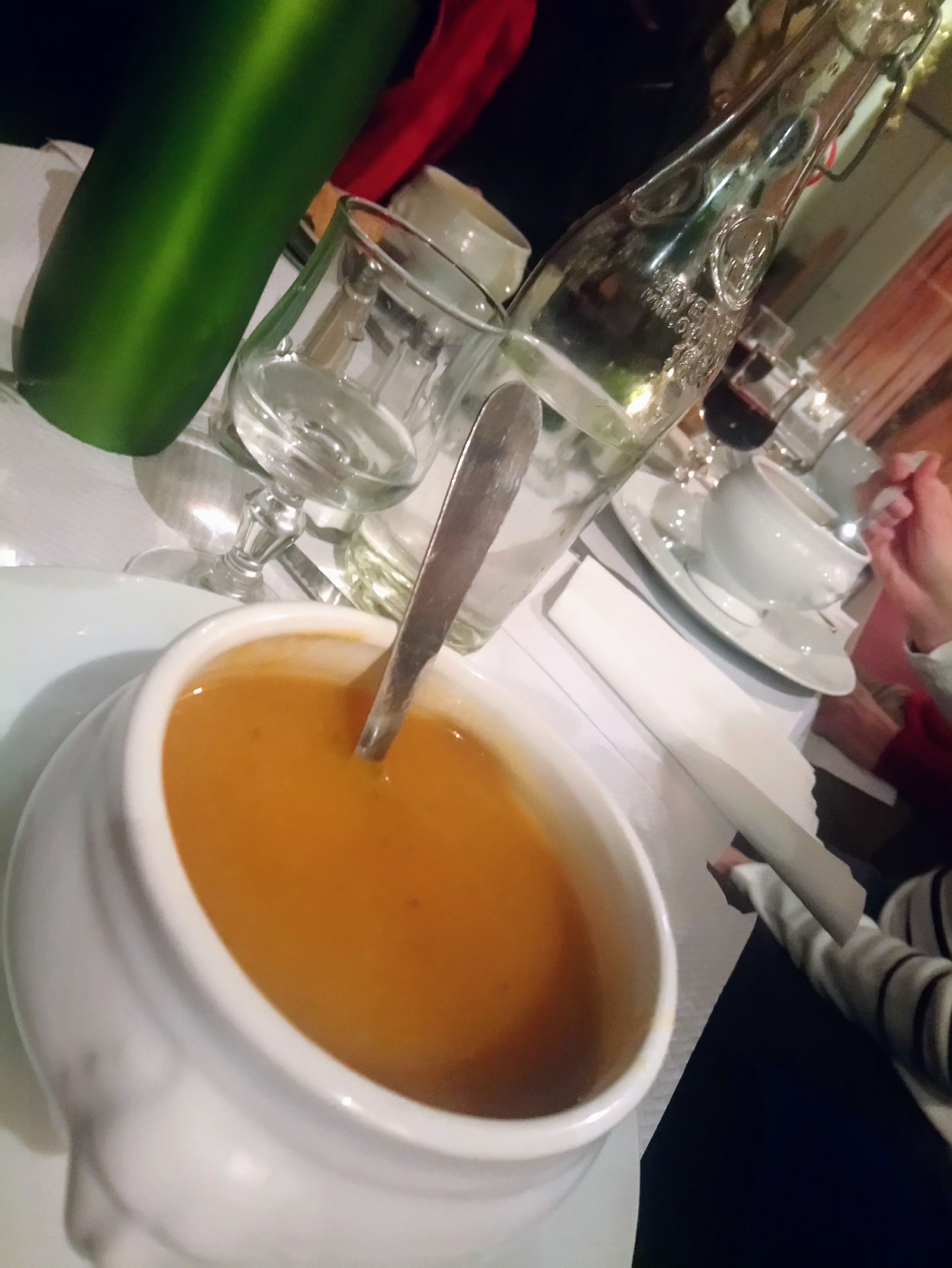 Je ne peux pas recommander une visite en hiver - l'endroit a un grand jardin d'hiver devant (certainement agréable par beau temps) mais seulement deux panneaux chauffants qui ne suffisent pas pour chauffer correctement le restaurant. J'ai eu de la chance que l'endroit soit vide et que je puisse m'asseoir juste à côté de l'un des deux radiateurs - sinon je serais parti… La nourriture était mitigée - une adorable soupe aux légumes faite maison et la mousse au chocolat était également très bonne. Le boef bourgignon recommandé par le chef (menu très riche en bœuf, presque impossible à éviter si le coq au vin est sorti) était de bon goût mais la viande était de très mauvaise qualité. C’est peut-être ce que fait grand-mère pour maintenir le prix bas (ce repas a ajouté 6 EUR aux 15 EUR par ailleurs incroyablement bas pour le repas à trois plats). Mais je paierais volontiers un peu plus pour une meilleure qualité. À l'exception d'un morceau de viande, le reste était composé à 50 % de graisse. Propriétaire super sympa, très bon marché. Mais à éviter en hiver.