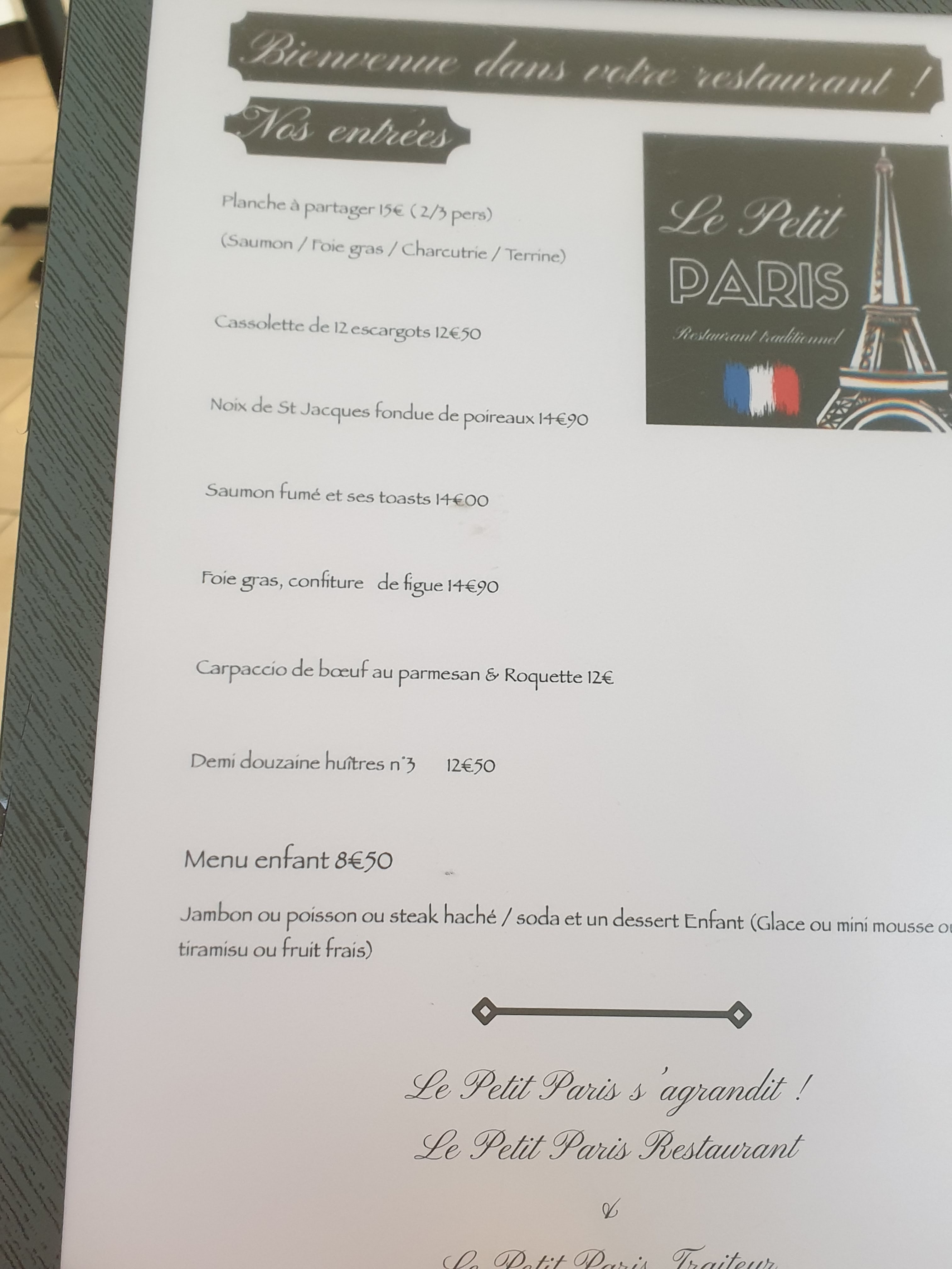 Petite sortie pour mon anniversaire, tous les restaurants étaient fermés donc nous avons tenté le petit Paris. Et bien, nous y retournerons ! Les plats étaient très bons et à un prix abordable surtout pour la qualité des produits. (Même le steack haché du menu enfant n'était pas surgelé) . Idem pour les desserts. Le cadre est agréable et le personnel très sympathique. Seul bémol : tous les plats ont l'air tellement bons qu'il est compliqué de choisir 😁