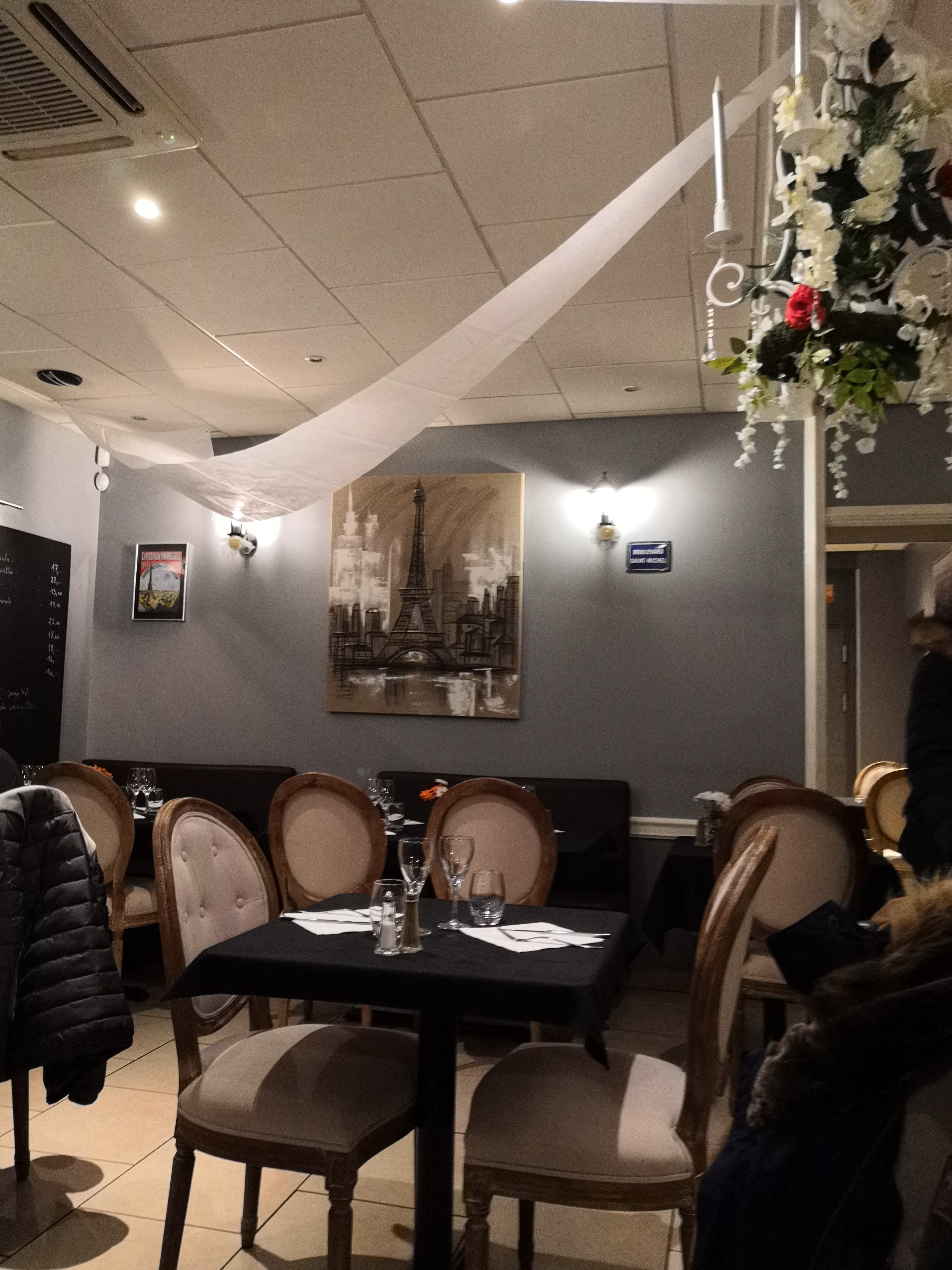 Nous avons été très bien accueilli et le patron nous a trouvé une table malgré que nous n'avions pas réserver. Nous avons très bien mangé et très confortablement, la carte est restreinte mais il y en a pour tous les gouts, avec du maison (important). Par contre je n'ai pas vu de menu enfant et ni d'enfant dans le restaurant... La décoration est très belle, avec plein d'objets qui rappellent Paris (carafe, verres, nappe, ...) Je recommande