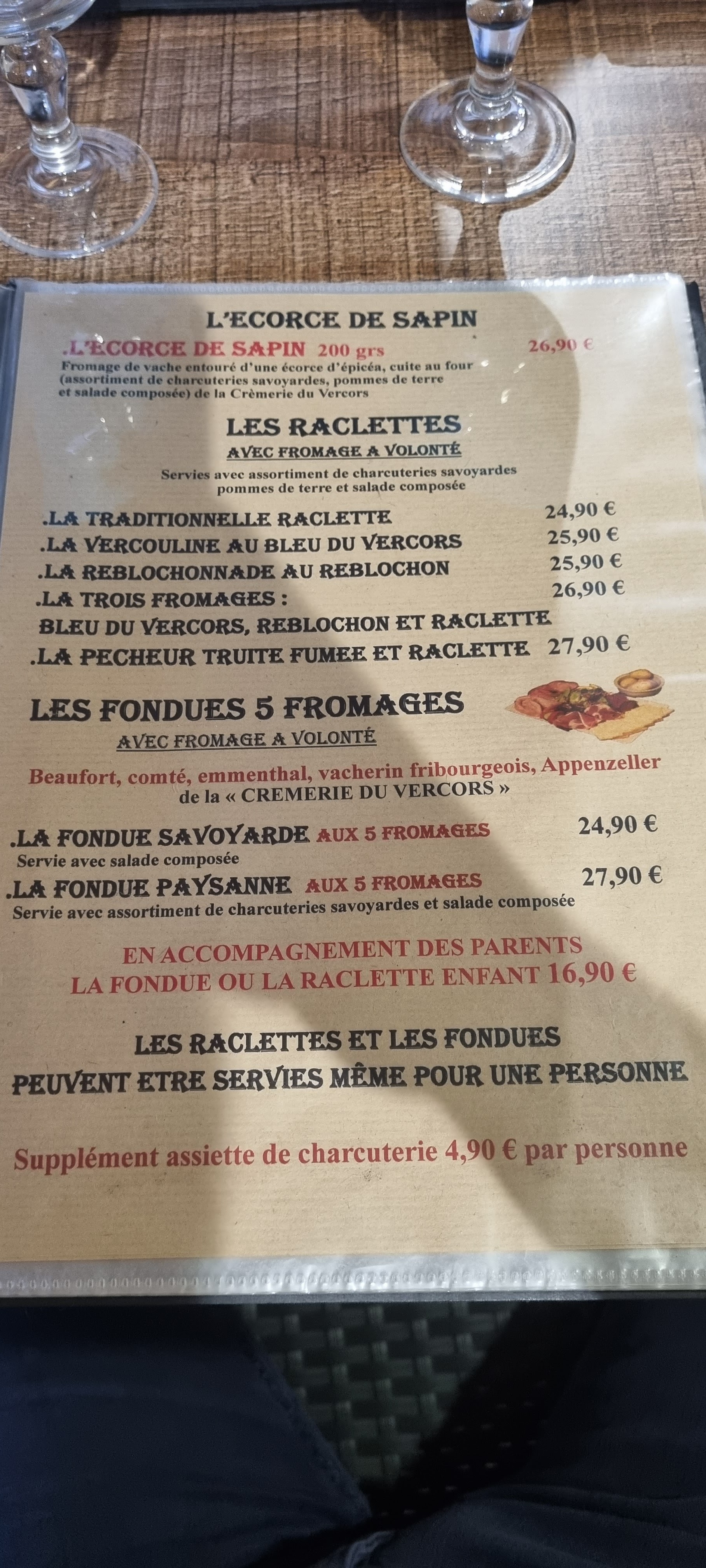 bon resto, fondue raclette a volonté ,bonne assiette de charcuterie, ambiance montagnarde. Attention Deux services le soir 19h00 21h00, 21h00 23h00,ne soyez pas en retard pour 19h00 autrement on vous dit de partir pour le deuxième service de 21h00 ,un peu déçu quand même ,pas le temps d apprécié d'être entre amis et de mangé tranquille la fondue !!!!!