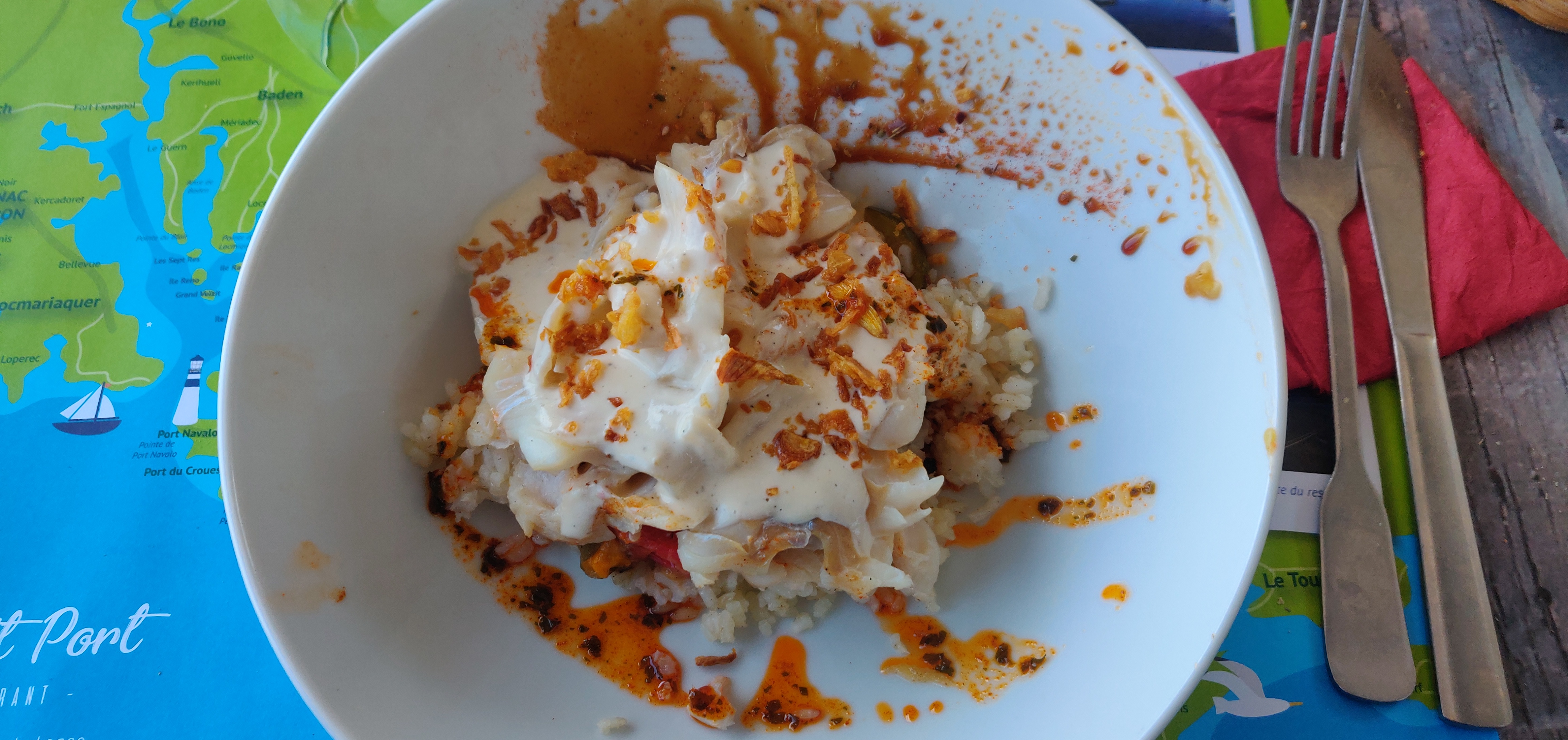 Du poisson et des crêpes. Toute l’ambiance bretonne dans un coin charmant du golfe. Je n’ai mis que deux étoiles pour la cuisine car sans être mauvais les plats ne sont pas extraordinaires : moules cuites à l’avance + louche de la sauce que vous avez prise à la dernière minute. Au lieu de cuire les moules à la demande comme devrait le faire un bon restaurant. La crêpe était épaisse. Pas mauvaise. Par contre le rhum qui devait l’imbiber étant absent au goût. Bref, on y va principalement pour le coup d’œil et une ambiance décontractée.