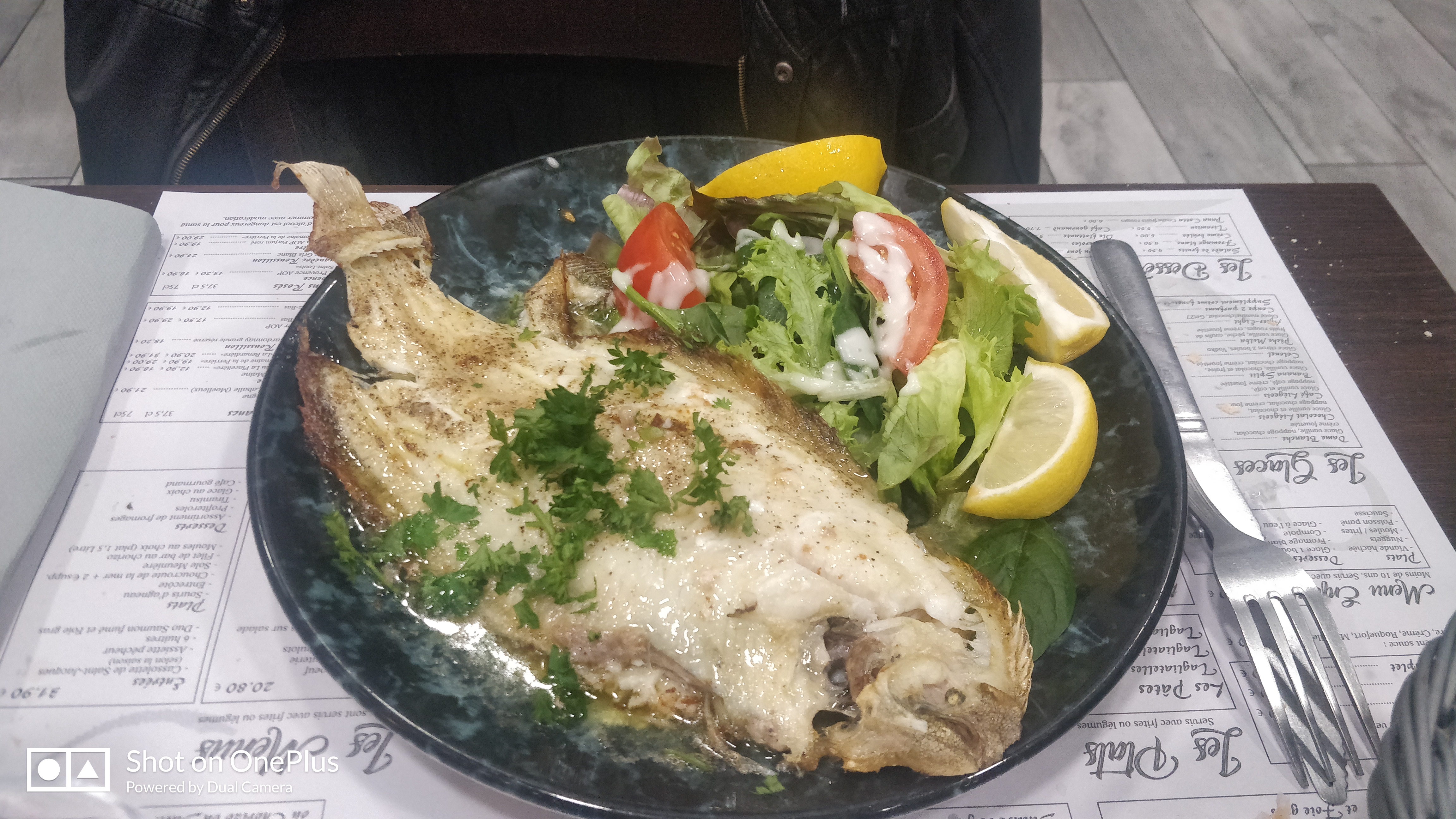 Menu à 30 euros En entrée, commande de duo de saumon fumé et foie gras. Plus de foie gras donc nous prenons tout de même l’entrée sans foie gras. En fait, le saumon n’est pas fumé mais mariné sans la précision du restaurateur. Après réclamation auprès du serveur car saumon non mangeable. Il nous apprend qu’il n’est pas fumé mais mariné, non précisé sur la carte. J’ai commandé une choucroute de la mer en plat principal … j’ai peur 😳