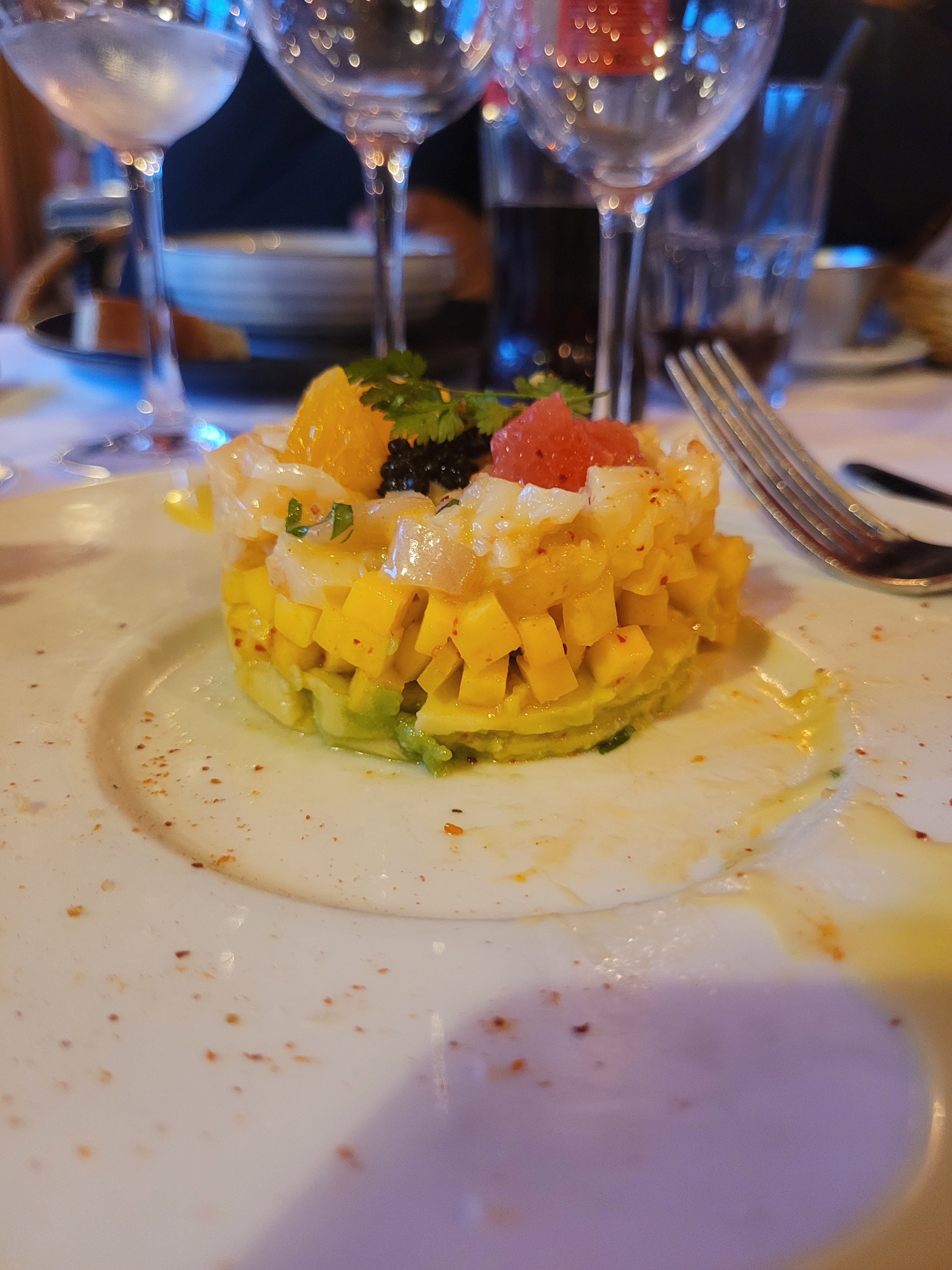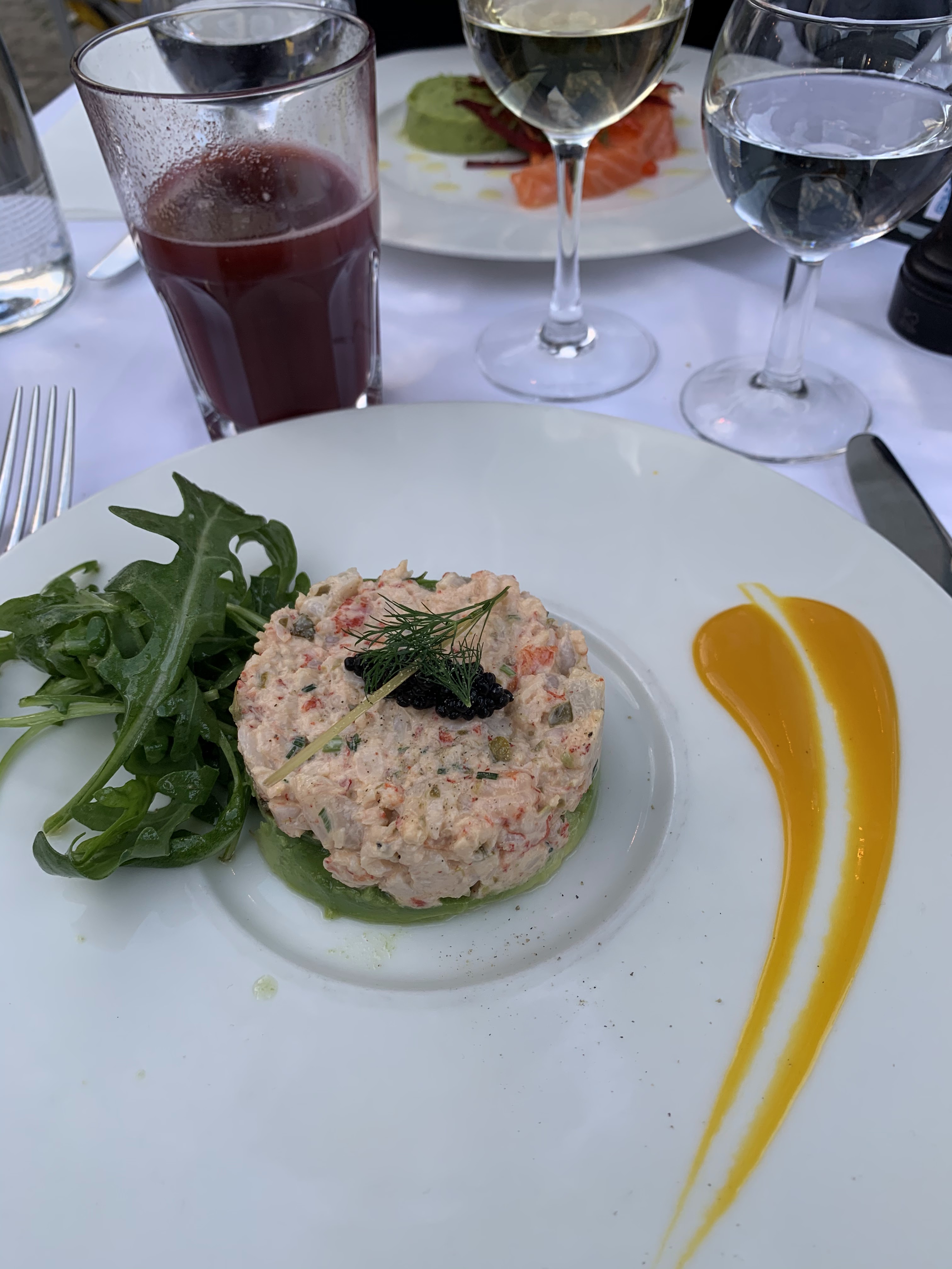 J’ai décidé de m’arrêter dans ce restaurant car il pleuvait Grand restaurant au bord de l’eau Près de Levallois , rien que côté d’eau il y a 18 tables Visiblement le quartier des affaires n’est pas loin Visiblement les prix sont élevés menu 25€ pour plat dessert ou entrée plat on n’est pas dans mon quartier ! J’ai choisi les écrevisses 🦞 avec les gambas 🍤, avocat 🥑 à l’ Yuzu c’est une entrée à 16€ , pas très copieuse mais vu ce que je mange c’est ok ! Ce sera mon repas! Le goût est léger, j’aurais aimé que le plat soit légèrement plus soutenu d’Yuzu Le beurre demi sel et le pain (tiède)sont vraiment bons Je dirai que c’est du seigle Le café gourmand a l’air sympathique Avec un pana cotte mangue Tartelette de fraise chantilly moelleux chocolat cannelé macaron
