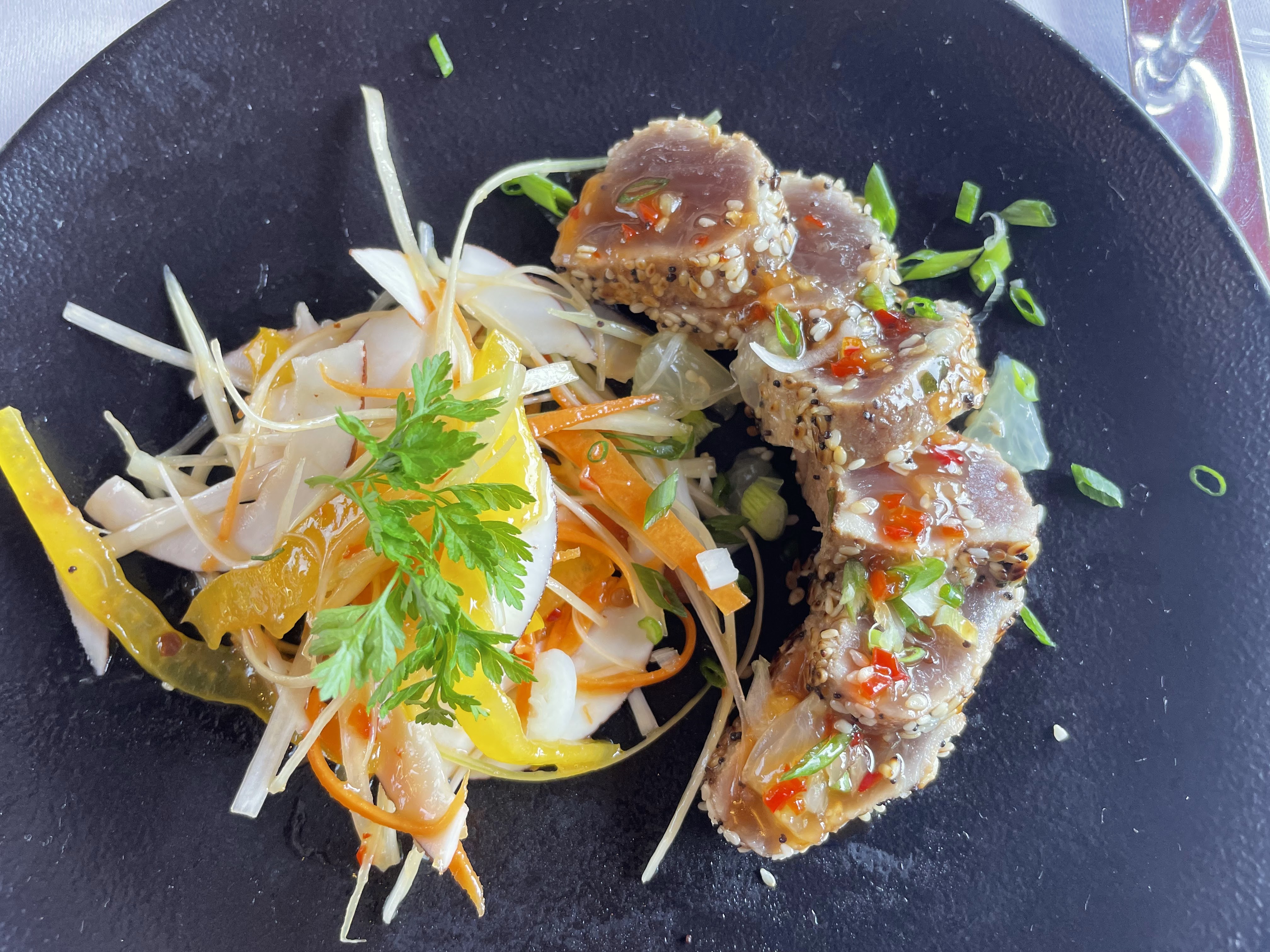 Calme, élégant, confortable avec une belle vue sur la rivière. Très bonne ambiance avec de la bonne nourriture. Les entrées avec du thon et du saumon étaient très fraîches et ils avaient une belle sélection de plats de poisson, y compris le bar que j'avais qui était alléchant.