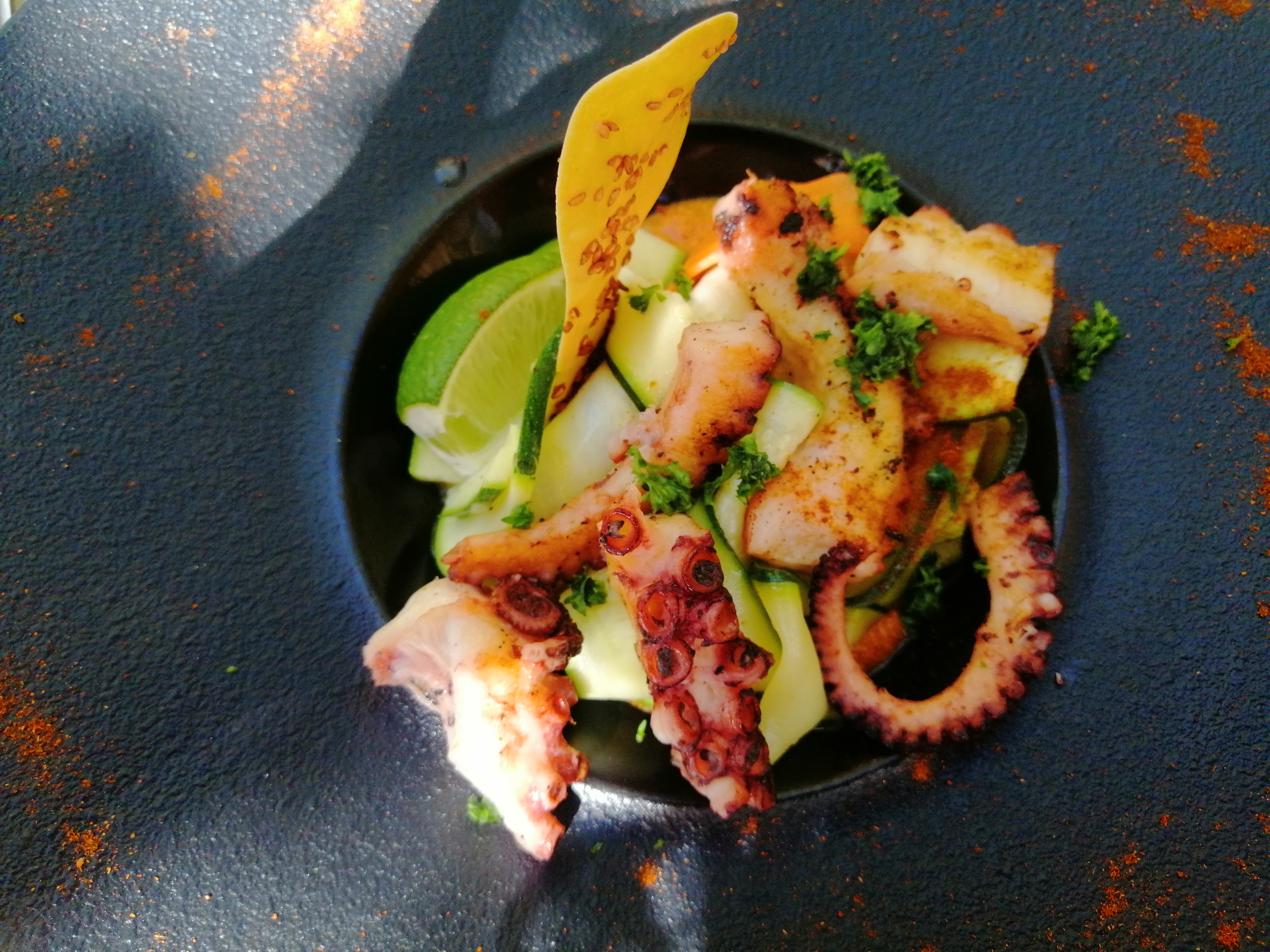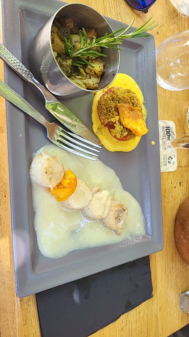 Entrée : poulpe à la plancha, plutôt bon et copieux, plat principal : filet de st pierre au four ( à micro-ondes, sans doute....) il ressemblait assez aux plats congelés que nous mangeons parfois, un poisson insipide dans une sauce assez flotte , agréable dessert, fait maison ?