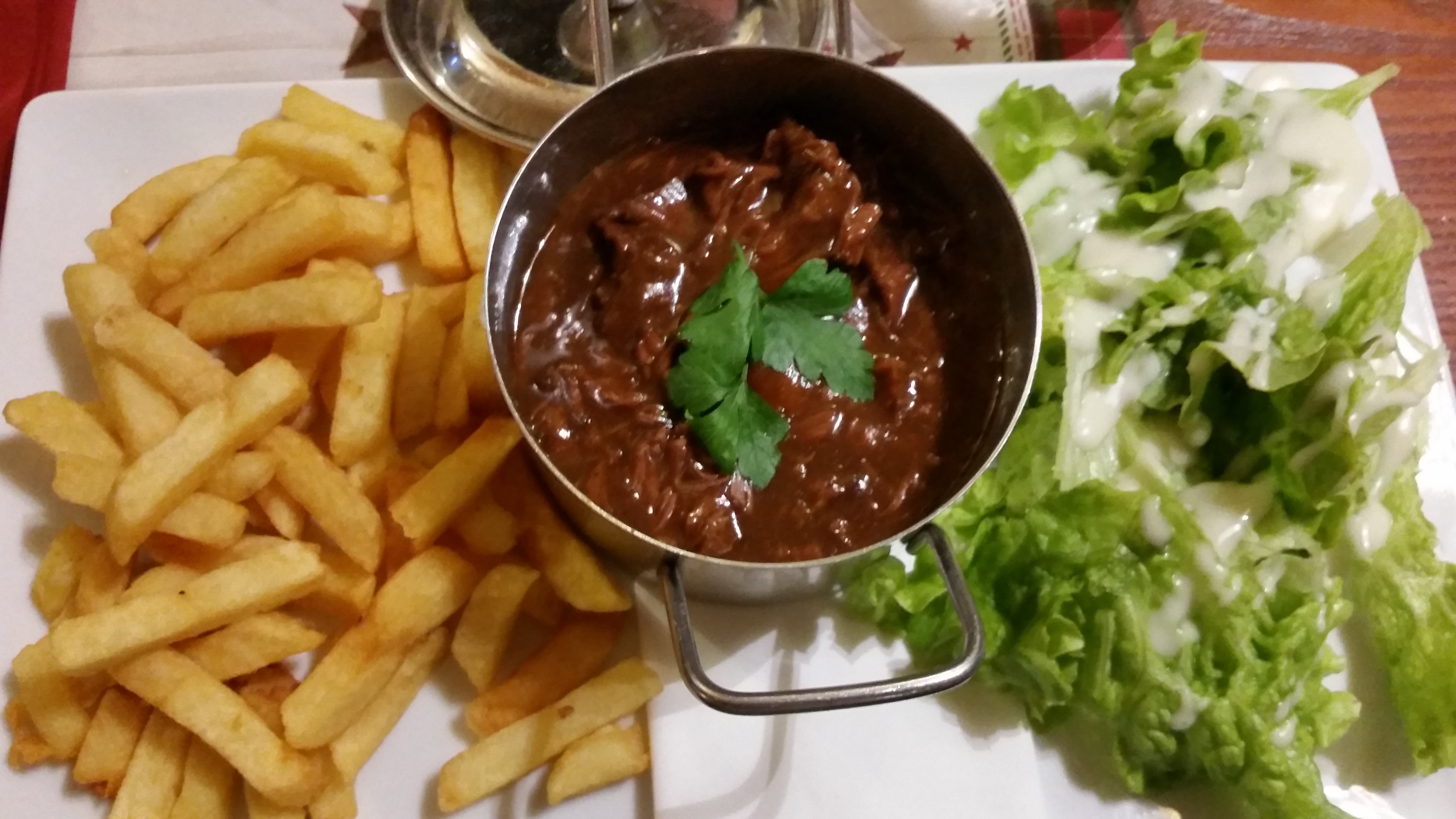 Portion de frites très petite, viande harchi grasse et sauce de la carbonnade sans aucune saveur (le pain d'épice ça ce met pas à la fin de la cuisson hein) bref sans intérêt.