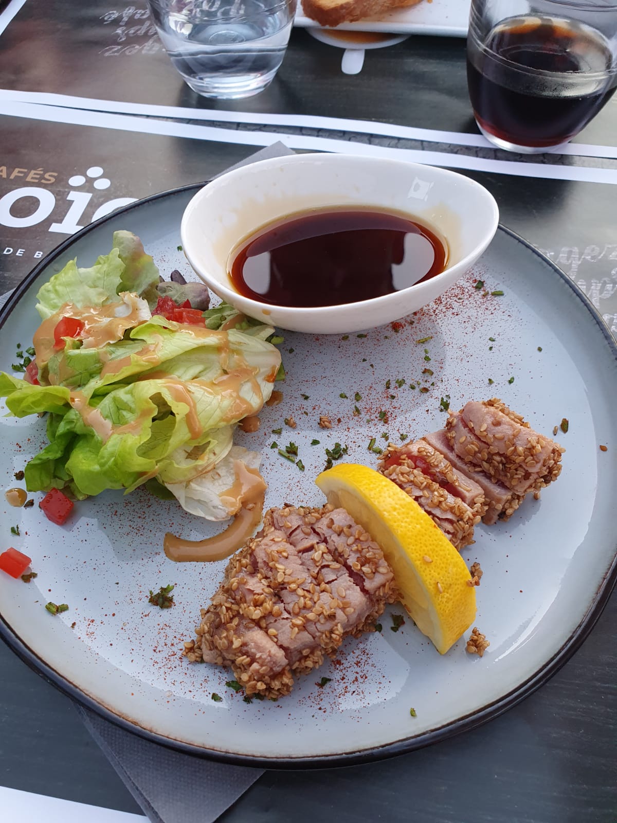 Beaucoup de monde en terrasse mais les distances entre les tables sont respectées ! Contrôle du pass sanitaire à l'entrée et c'est rassurant. Menu sympa avec du thon rouge en 3 façons, légumes un peu fadasse. Déjeuner sympa en terrasse même si le temps n'était pas tout à fait au rendez-vous