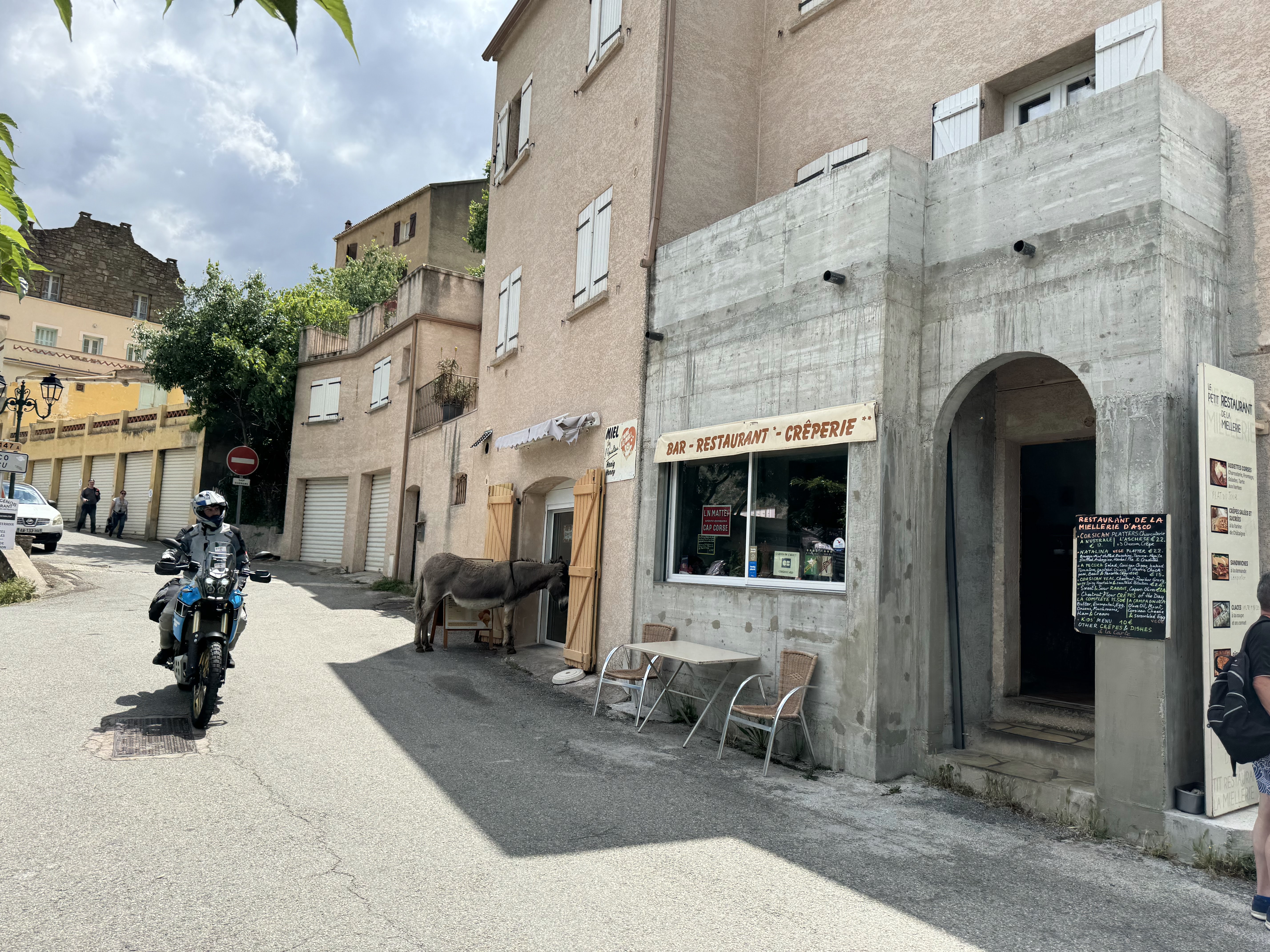 Après la randonnée jusqu'au Pont Génois d'Asco, nous avons mangé ici de délicieuses crêpes, sucrées et salées. Le restaurant à la gestion familiale propose de délicieux plats variés au menu. L'âne du village Ornelle nous a rendu visite.