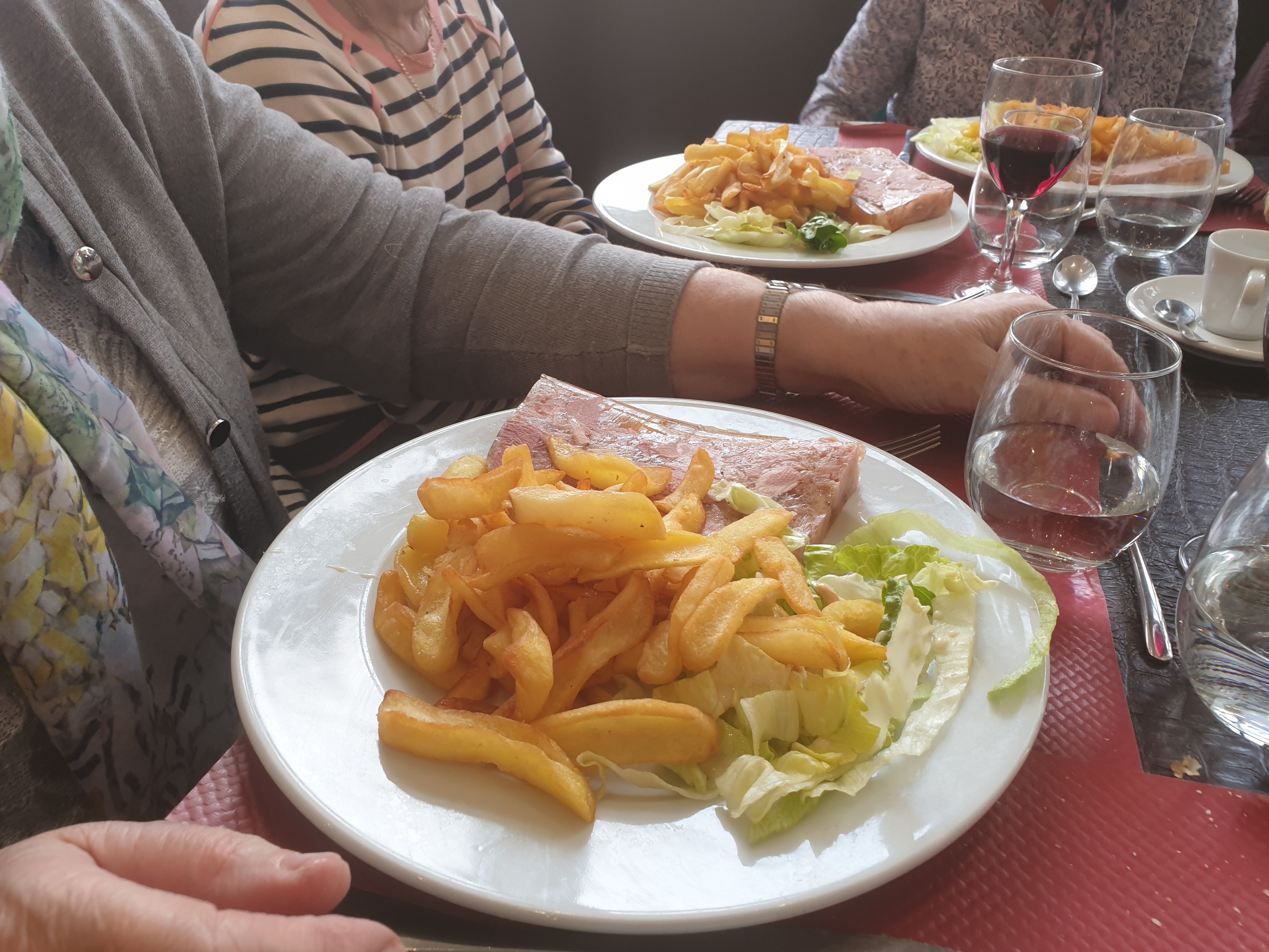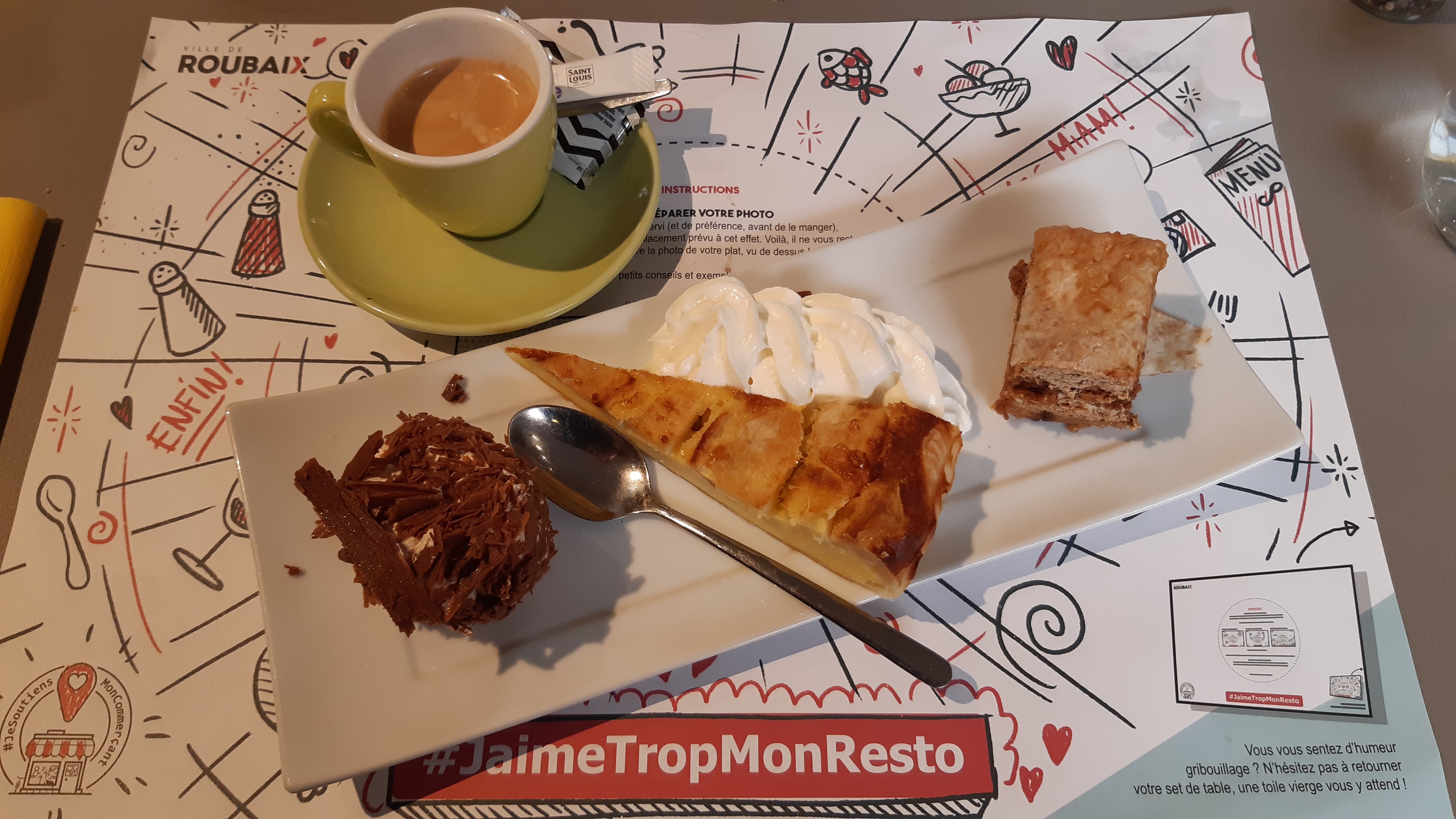Tarte au maroilles trop molle, potjewlesh en tranche avec trop de gelée (dommage que ce ne soit pas le vrai avec les viandes en morceaux), par contre très bonnes frites et le gâteau du dessert très bon, bon accueiil