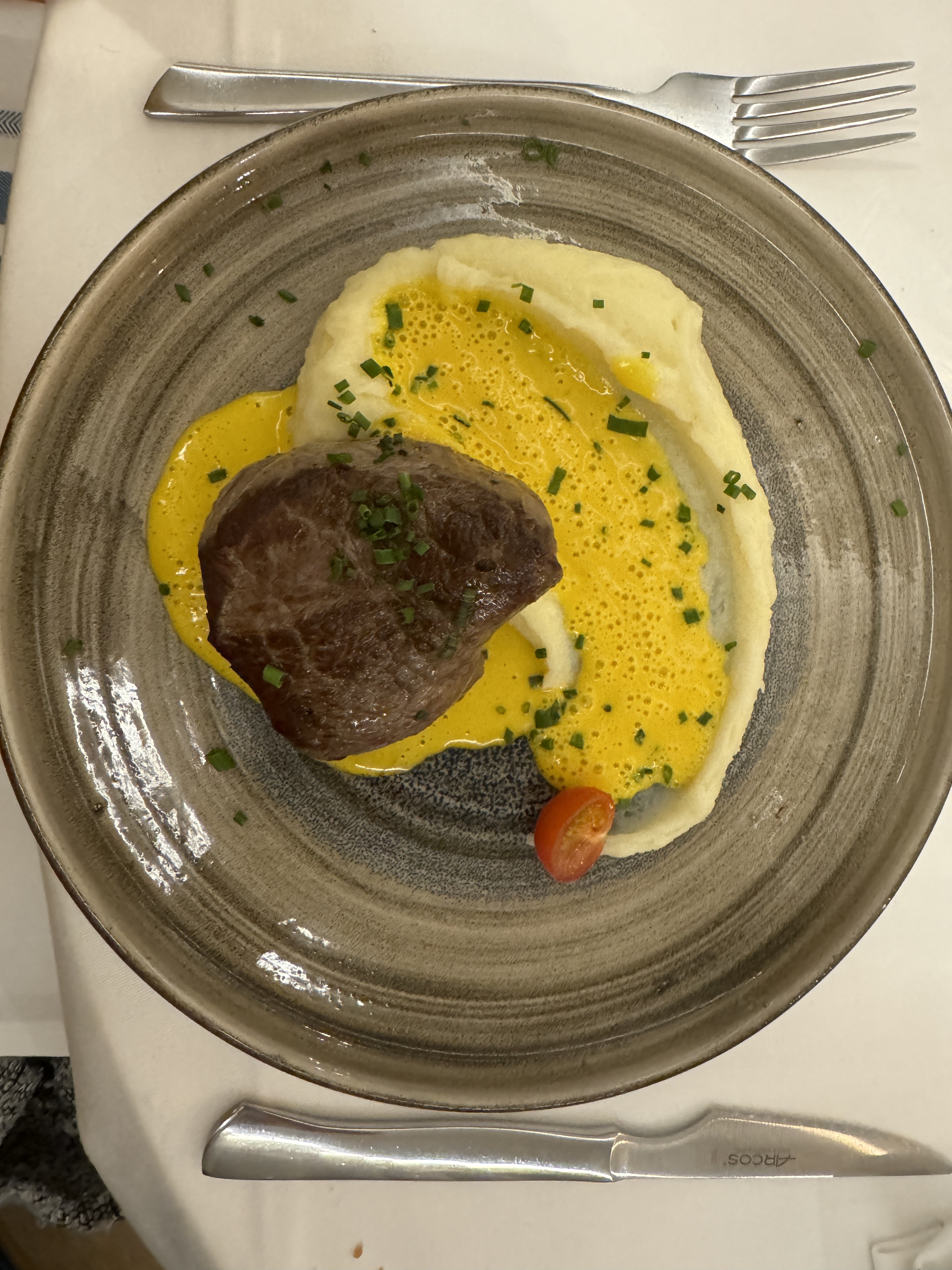 Bonne soirée dans un lieu agréable, un décor sobre et élégant, une bonne entrée sur une base de homard, la côte de porc ibérique quoique savoureuse aurait mérité une plus grande attention à la cuisson, le personnel est attentif et serviable. A refaire