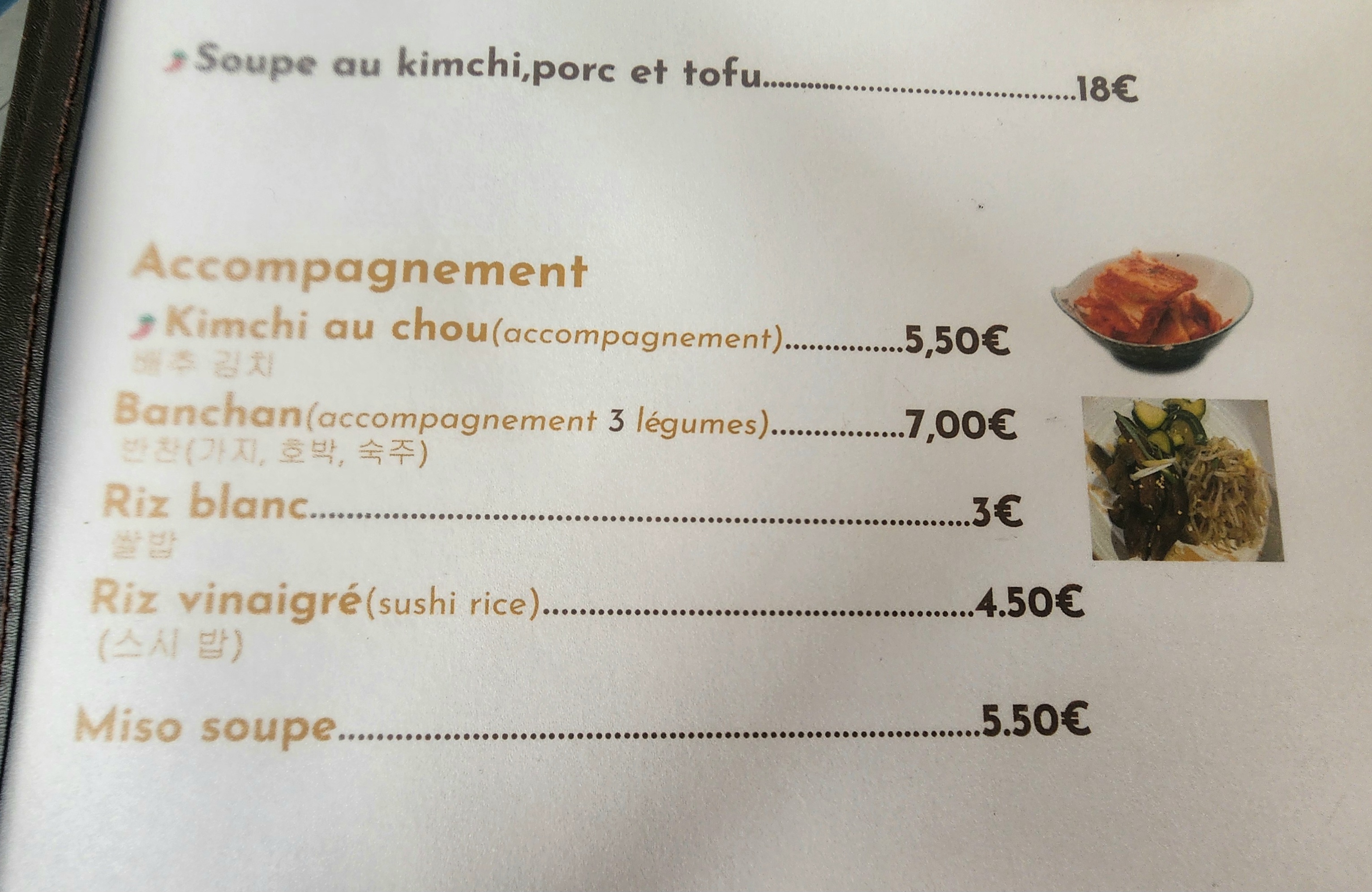Visite en mai 2024. Les plats d'accompagnement sont facturés séparément. Kimchi 5,50 euros. 3 accompagnements à 7 euros (fades, froids, légumes à l'ancienne). Le prix d'un bol de riz est de 3 euros séparément (pas de riz gluant, mais du riz inexplicablement bon marché). J'ai payé 52 euros pour le déjeuner (ragoût de kimchi, porc sauté et 1 bière), mais la portion était si petite que j'étais rassasié. Le porc sauté n'était pas épicé. Le ragoût de kimchi n'est pas si bon. Très bruyant juste à côté de la route. Le magasin est très petit