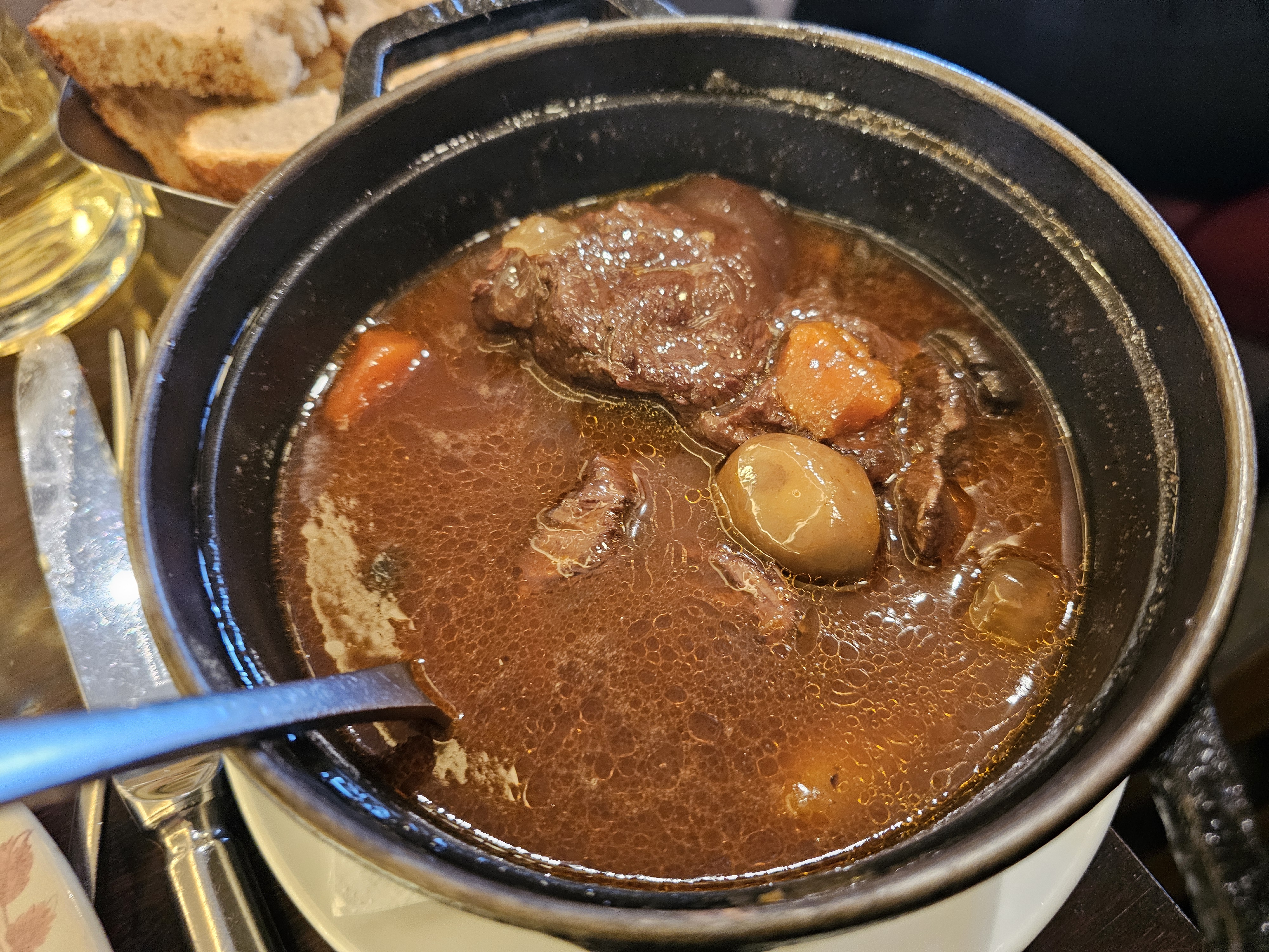 Un bourguignon qu'on peut déguster à la cuillère, vraiment goutu. Envie de saucer la marmite jusqu'au fond. Belle proposition de vin au verre. C'est certes un peu cher mais il faut garder de l'authenticité.