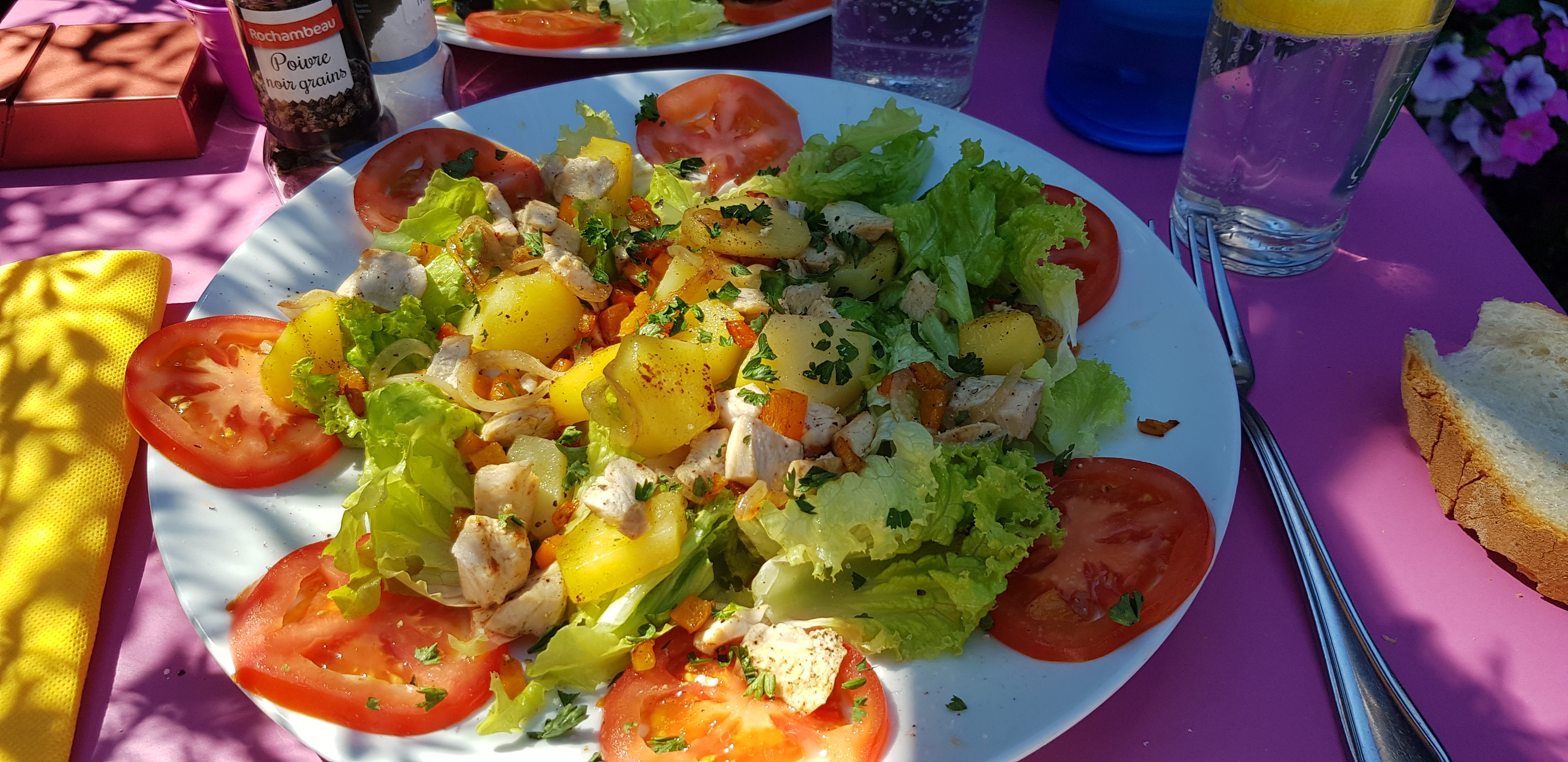 Nous nous Sommes arrêtés au hasard.. Et quelle bonne idée. Un acceuil tres gentil et sympathique. Nous avons commandé des salades...une au poulet et l autre italienne... Elles étaient délicieuse.... Bref je recommande.. D autant plus que le cadre est tres agréable Arretez vous