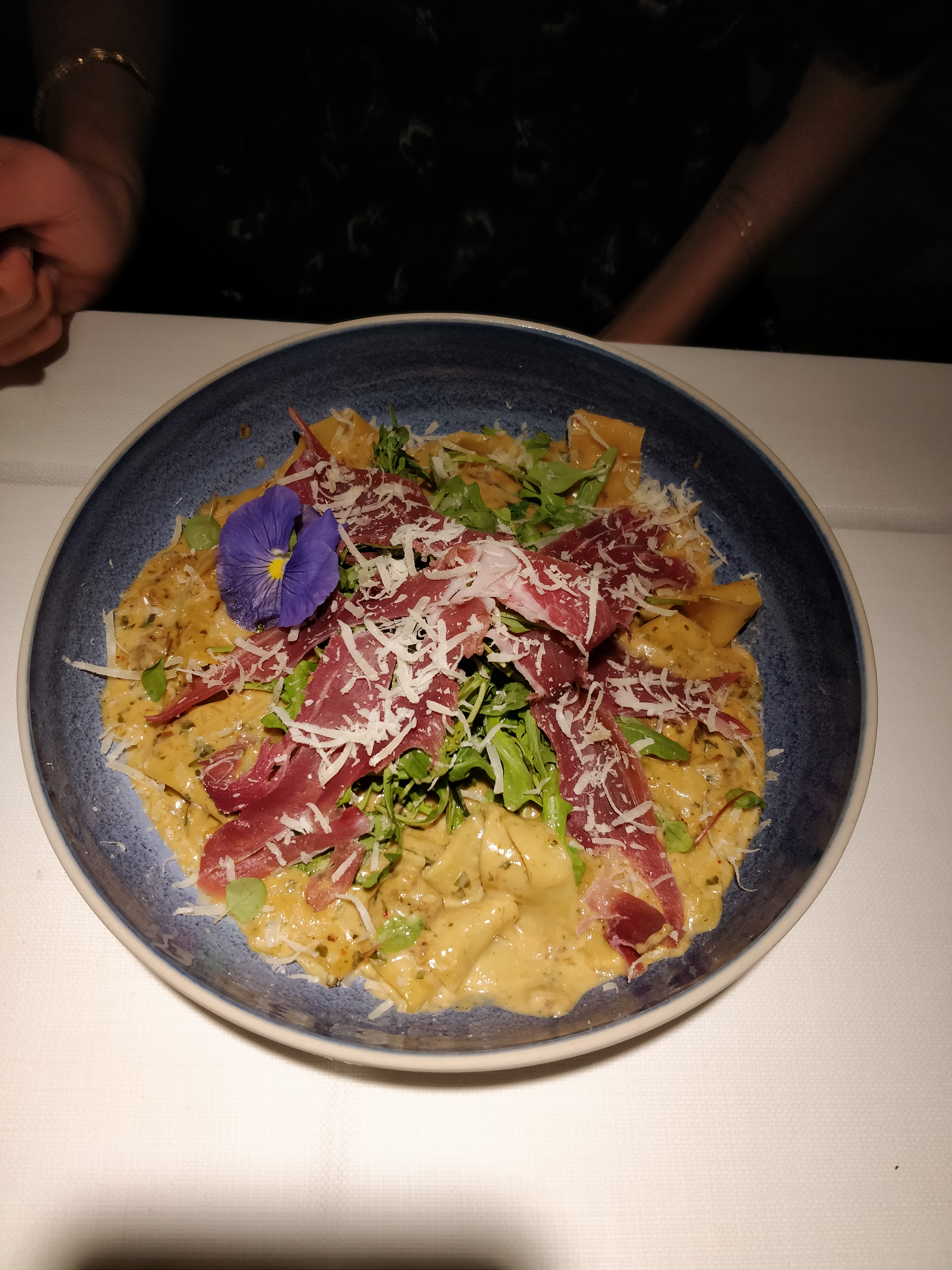Nous avons trouvé ce restaurant via Google Maps. Cela n'a pas déçu ! Vous pouvez vous asseoir à l'intérieur ou à l'extérieur. Très confortable ! Le serveur était très sympathique et parle anglais (enfin). Nous avons eu un apéritif (saumon avec souris au citron) et après cela nous avons partagé le buglittice (boules de fromage). Mon mari a pris le Veau Tigre et moi les Tortellini Gambas. Tout est fraîchement préparé et vous pouvez vraiment le goûter. Les frites aux truffes sont une recommandation. Merci beaucoup pour votre service charmant et votre nourriture parfaite!