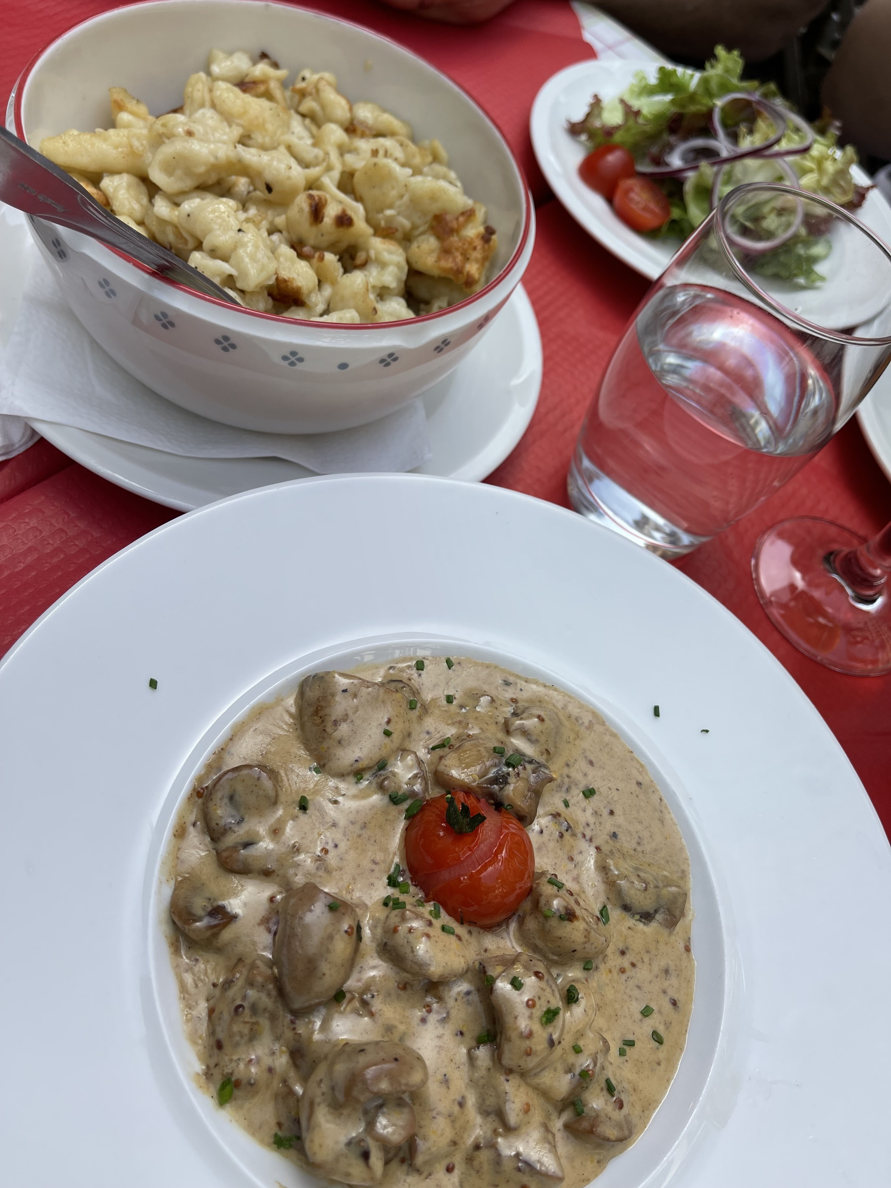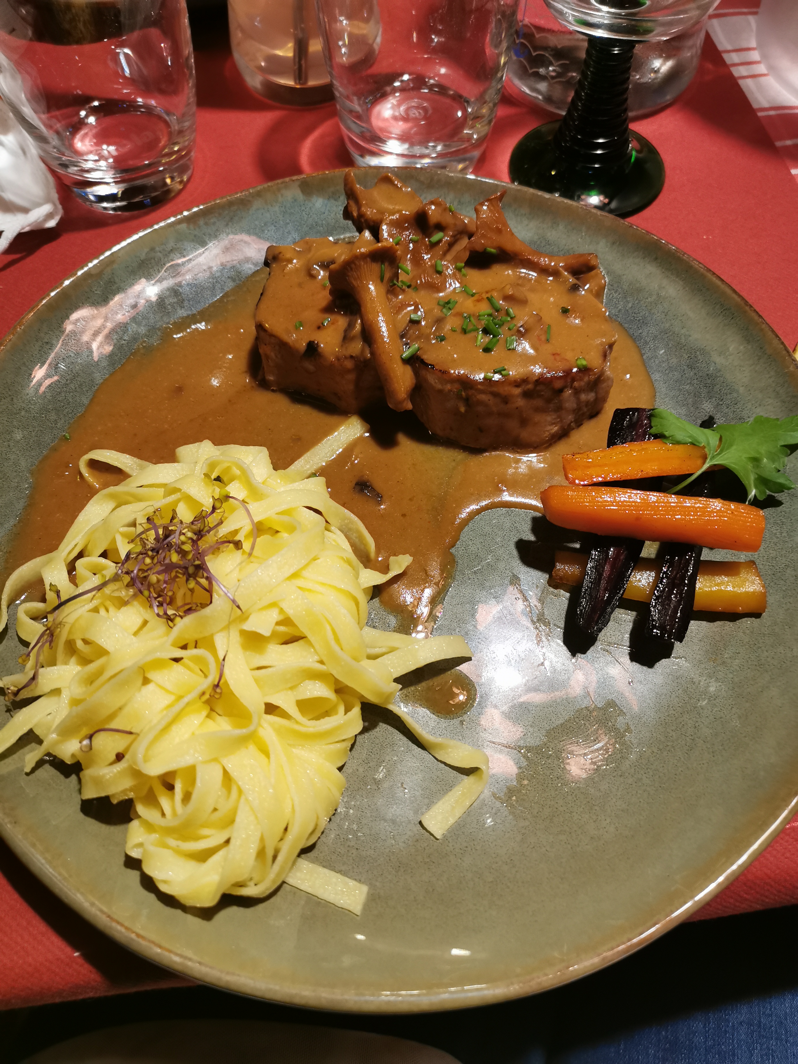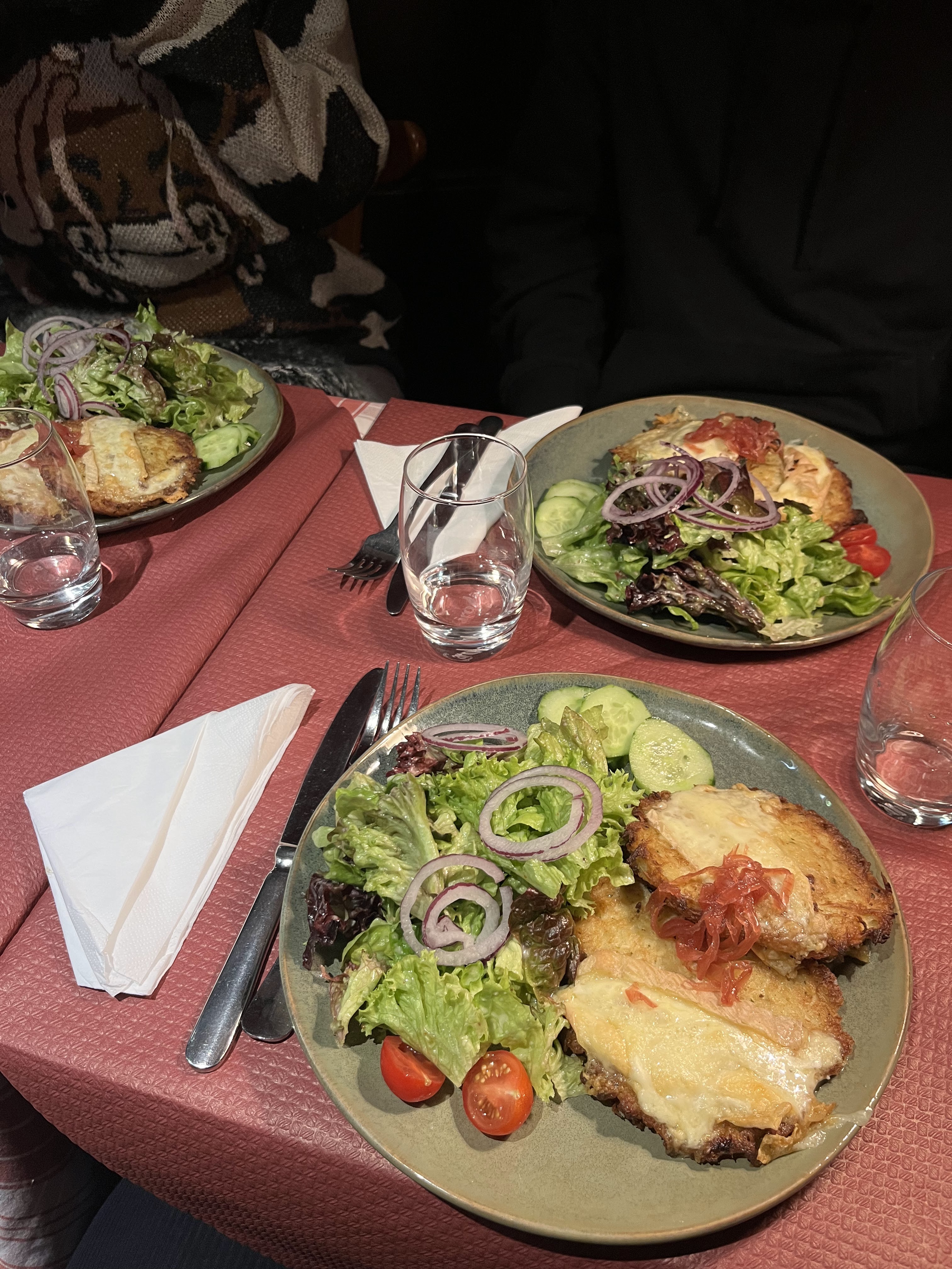 Ambiance à la chaîne, pinot noir servi direct du frigo. Qualité des repas corecte. Ambiance WC hommes- très intime.