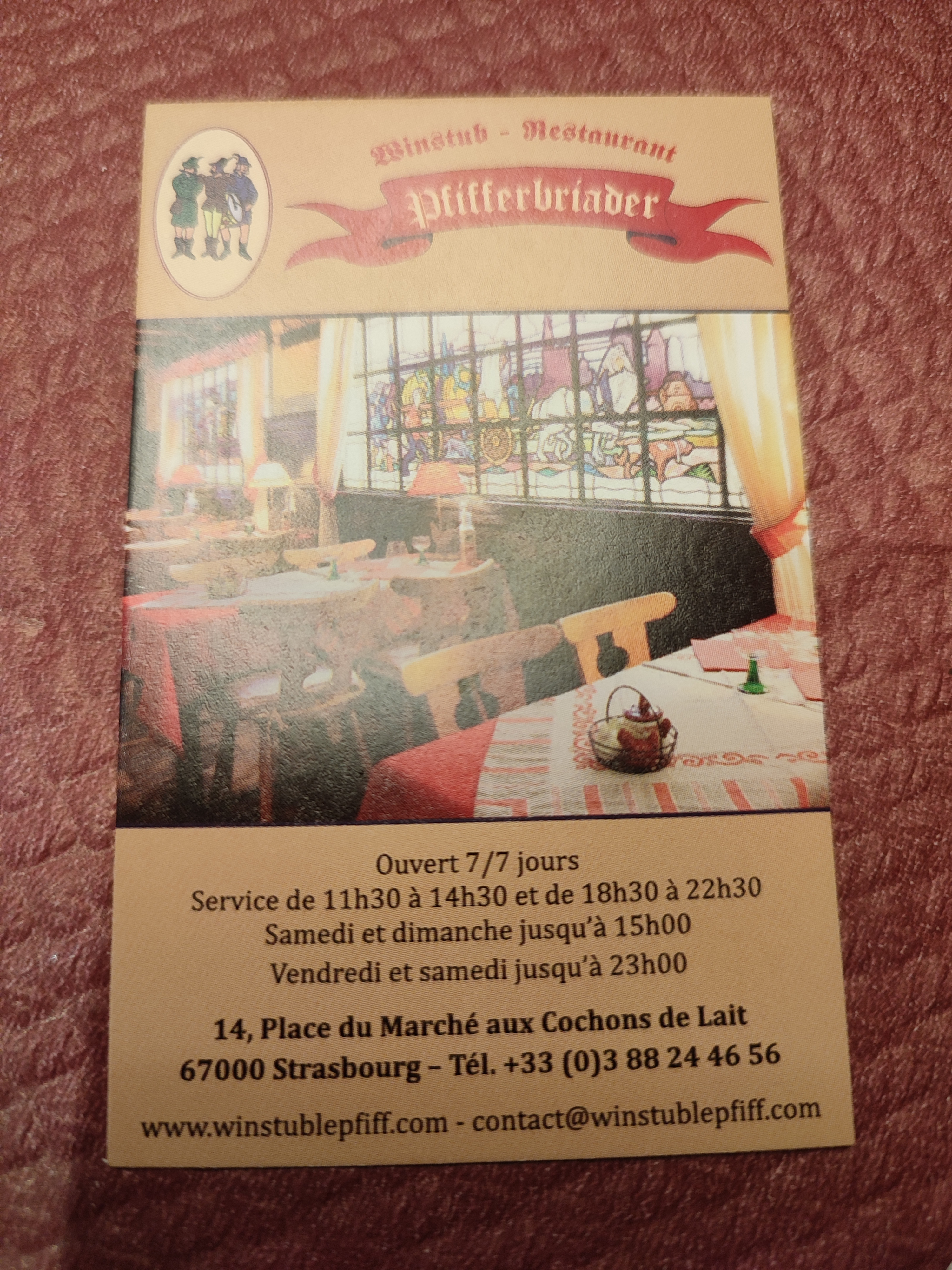 Voici toutes les informations sur le Restaurant Le Pfifferbriader qui ce trouve au 14 Pl. du Marché-aux-Cochons-de-Lait, 67000 Strasbourg (67). Sur cette fiche vous trouverez les photos, l'adresse, les horaires d'ouverture, le numero de téléphone et les avis clients.Vous pouvez églement rédiger un avis si vous le souhaitez en bas de page.