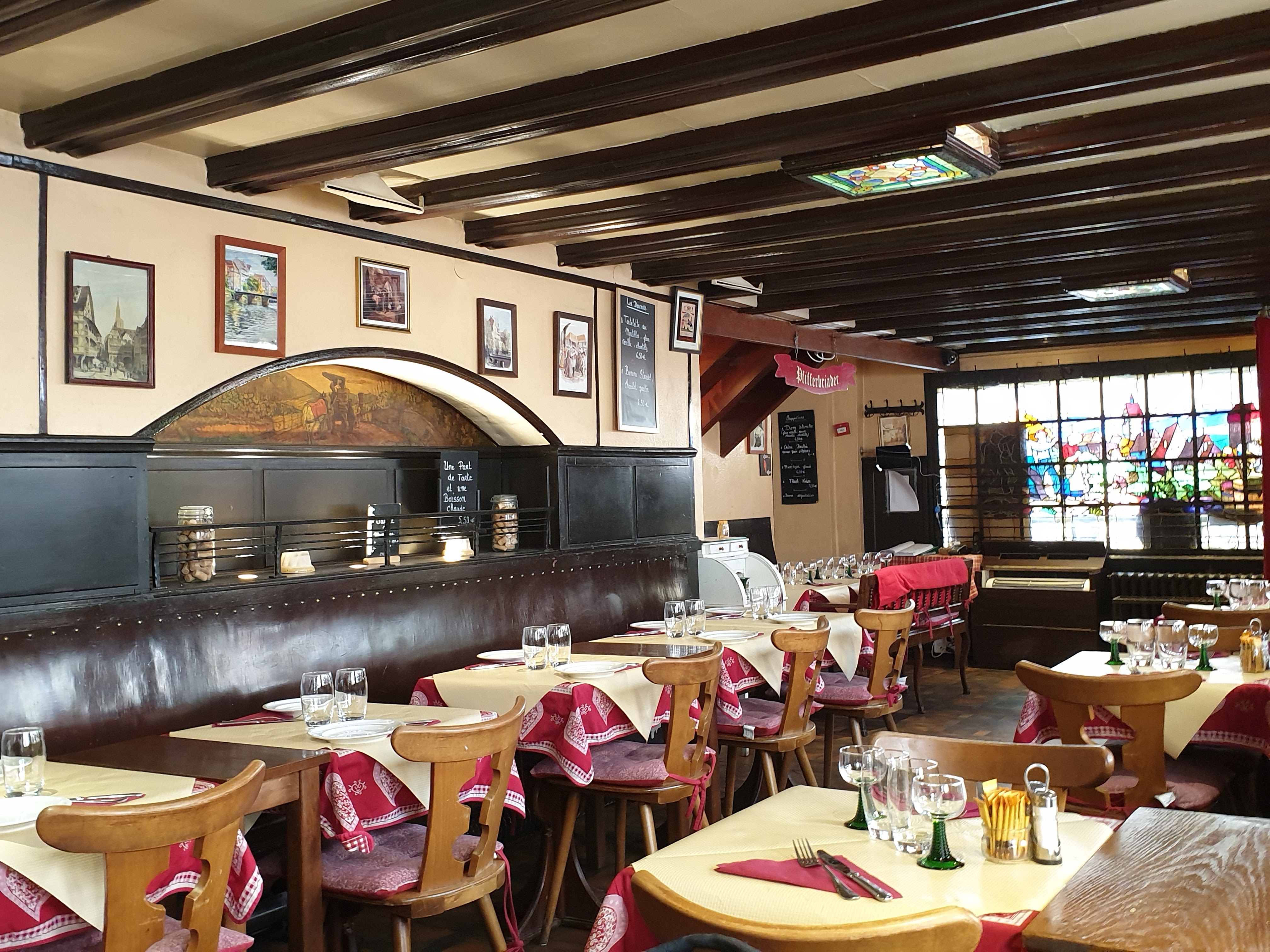 Alsacien amoureux de la cuisine de sa région, quelle déception de constater la qualité des plats dans ce restaurant : les spätzle trop cuits (durs comme s'ils étaient frits), la sauce du coq au vin fade, sans doute épaissie à la farine, les cuisses de grenouille au seul goût de beurre, sans assaisonnement, le cordon bleu sec, dur, et avare en munster. Seule la tarte flambée prise en entrée rattrape vaguement un repas qui a peut-être pâti d'une période de rush pendant le week-end pascal. Personnel sympathique mais visiblement peu au fait de ce qui est servi dans le restaurant puisque la réponse à notre unique question s'est avérée fausse. Le cadre est très agréable.
