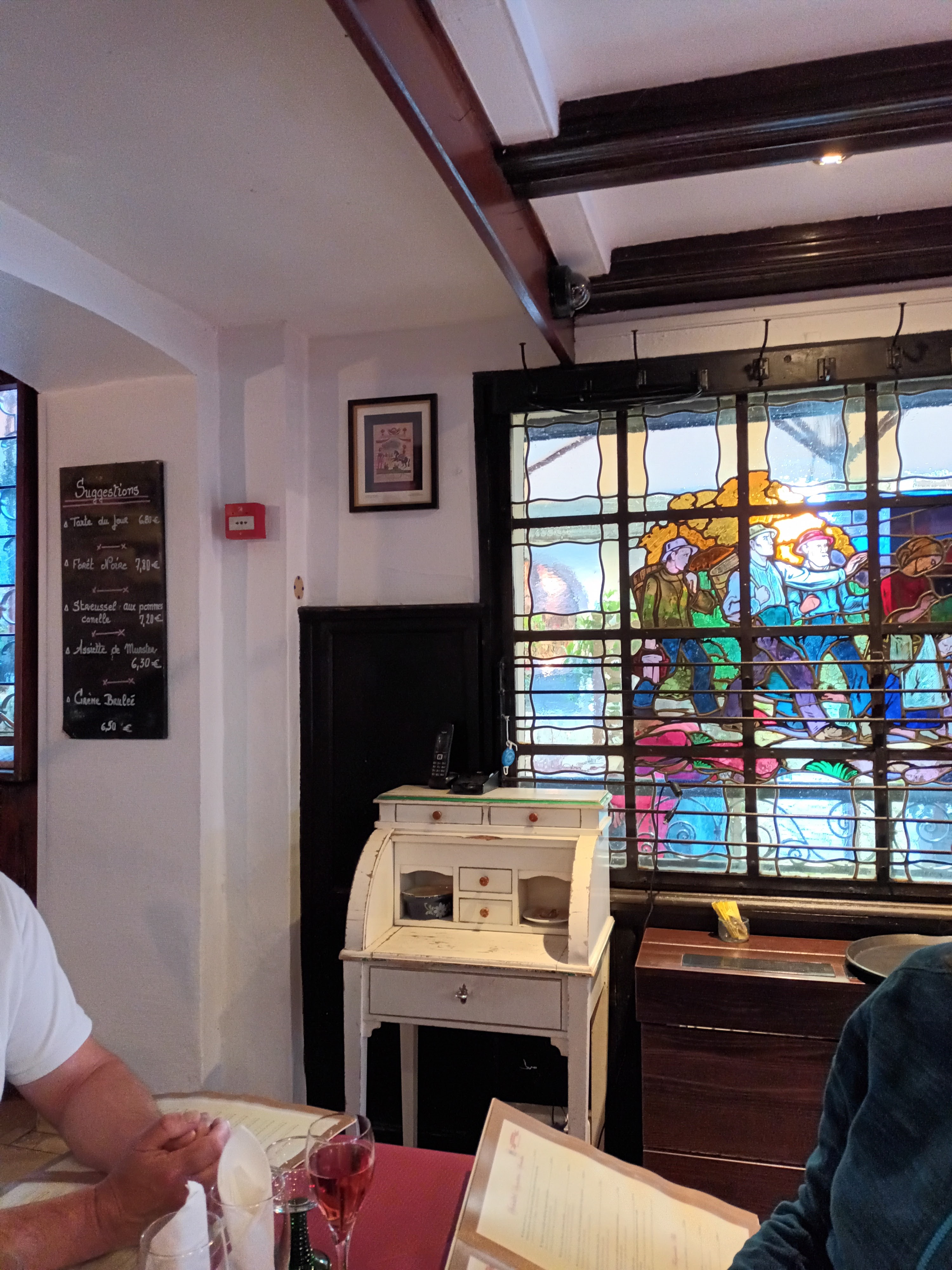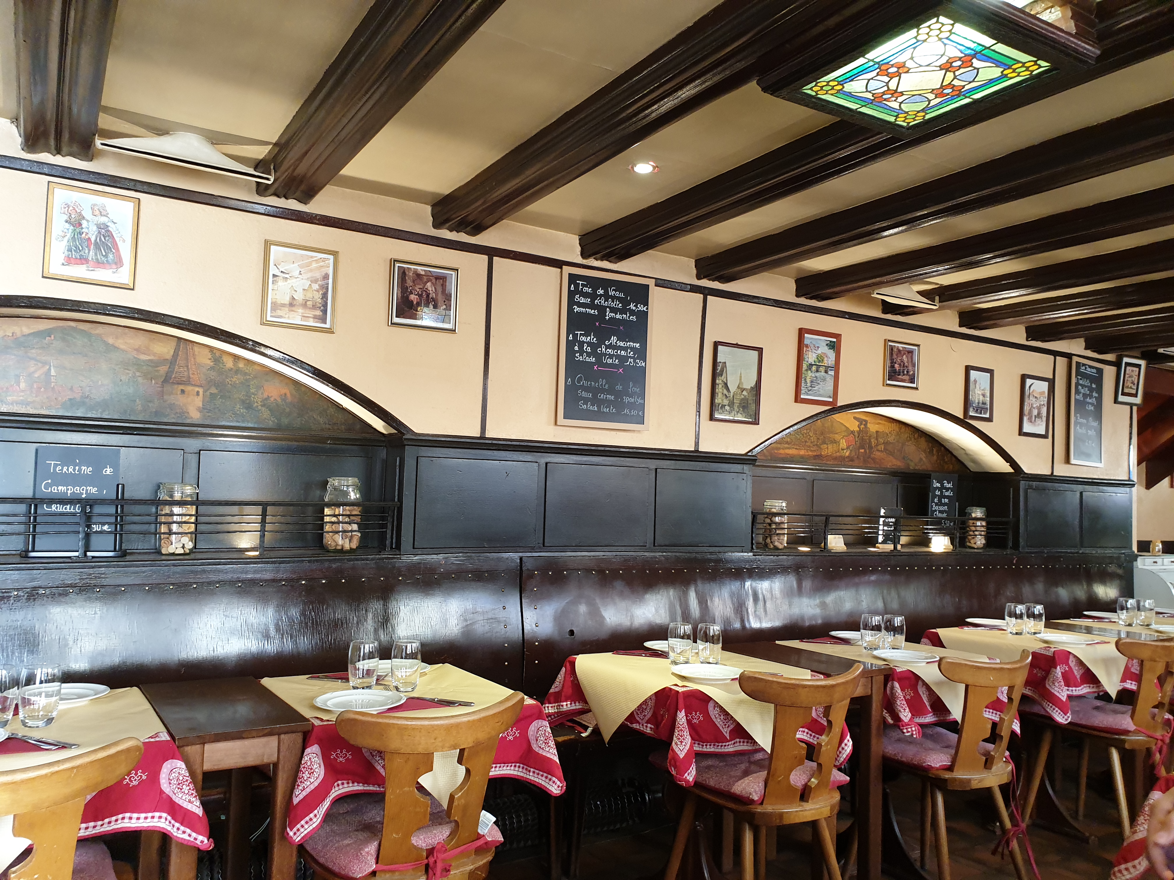 Assez sympa au calme malgré le passage. Petit resto qui ne fait pas aussi touristique que certains voisins. Service très rapide et aimable. On peut manger à petit prix une tarte flam ou prendre 1 menu entrée plat dessert pour 30 euros hors boisson qui est complet. Les galettes de pommes de terre au munster sont très bonnes. La crème brûlée du moment au pain d epice est parfumée comme il le faut