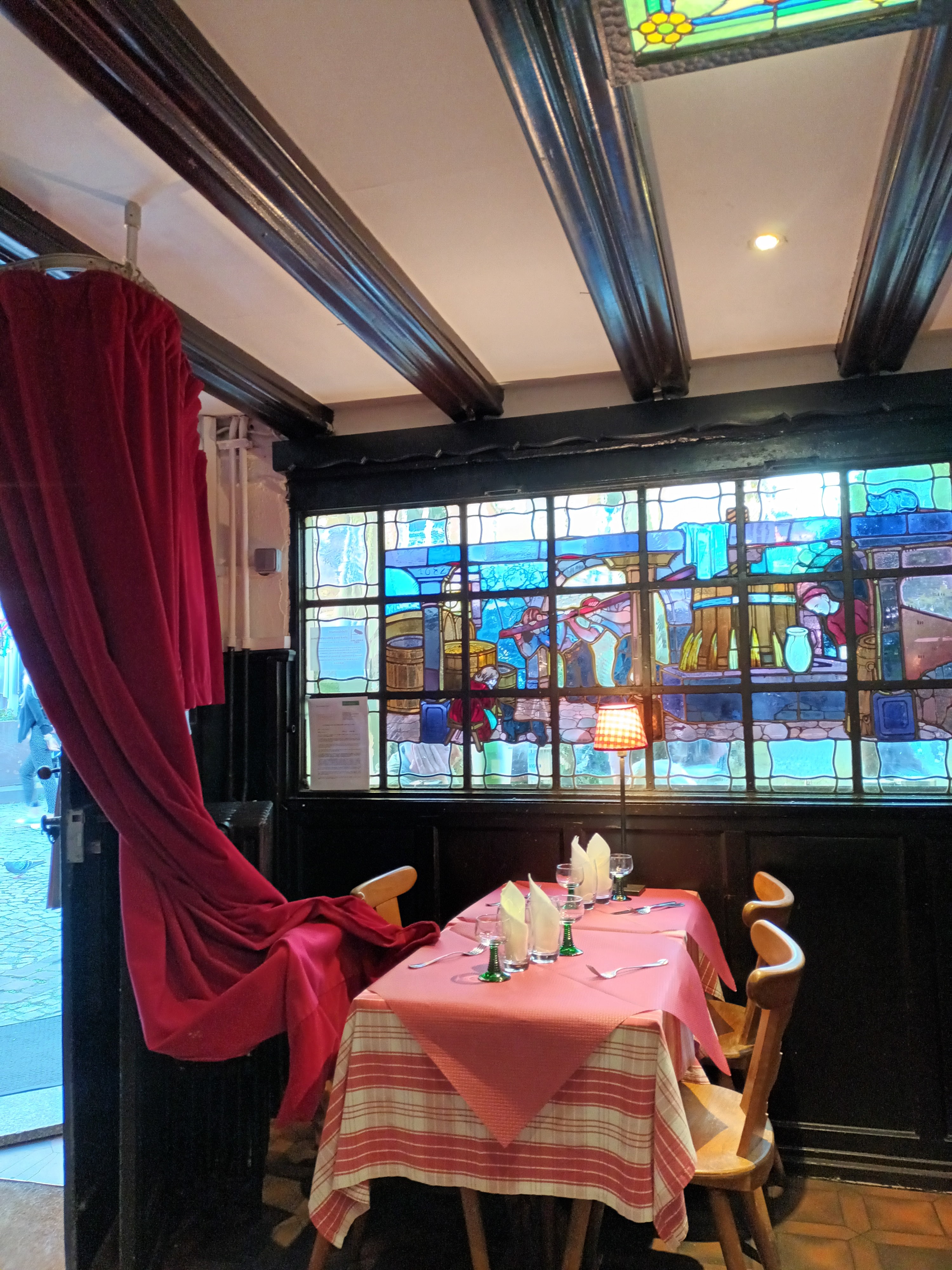 Des plats traditionnels nombreux et de très bonne qualité . Ce n'est pas un attrape touristes. Les serveurs sont très gentils. Vitraux, ambiance moyen âge, surtout à l'etage Photo prise depuis le resto.