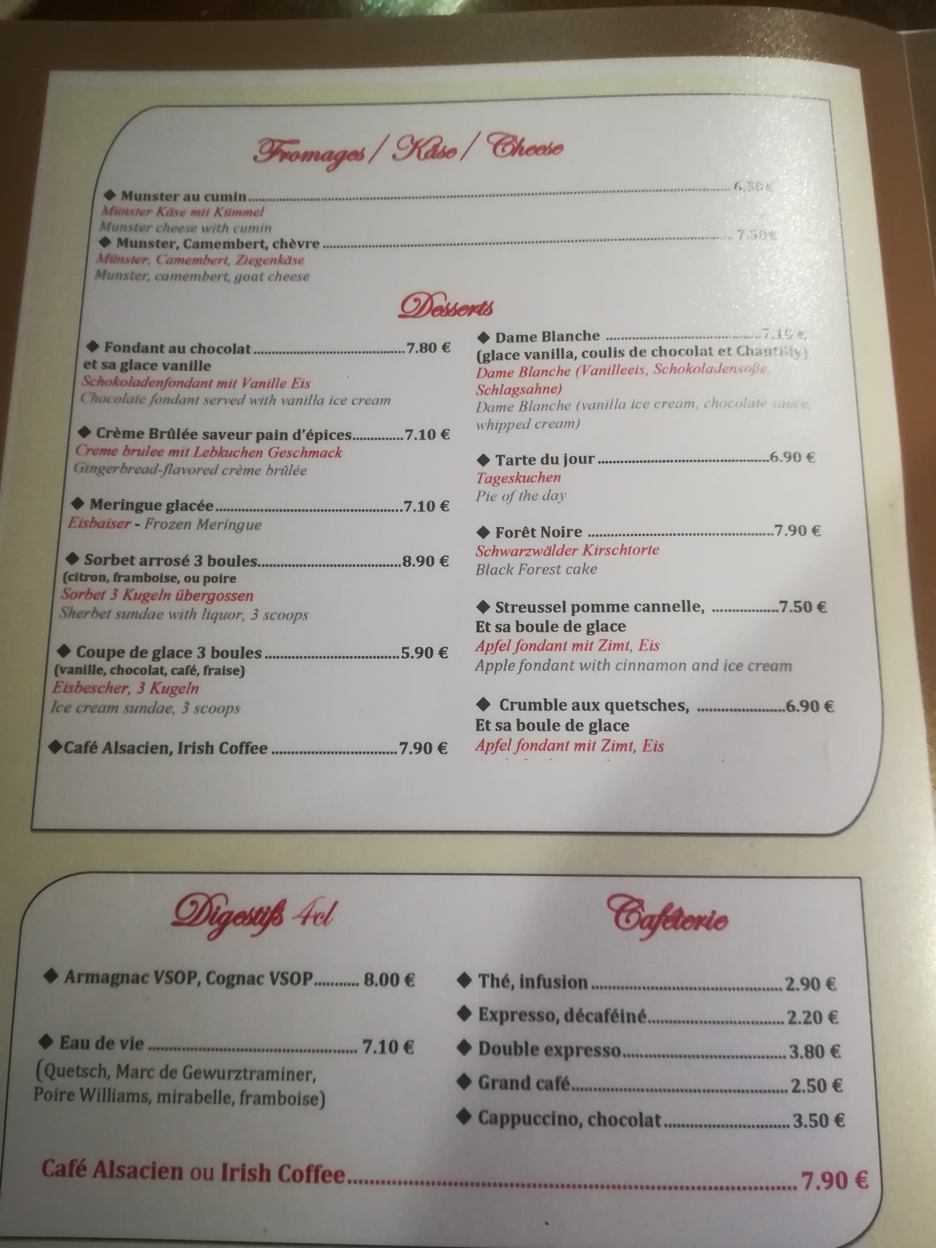 Très déçu, le gratiné au munster sur deux rosties c'est enfaite une petite tranche de munster sur chaque rosties .... Trop chère pour ce que c'est Volaille trop cuite etc Je recommande pas