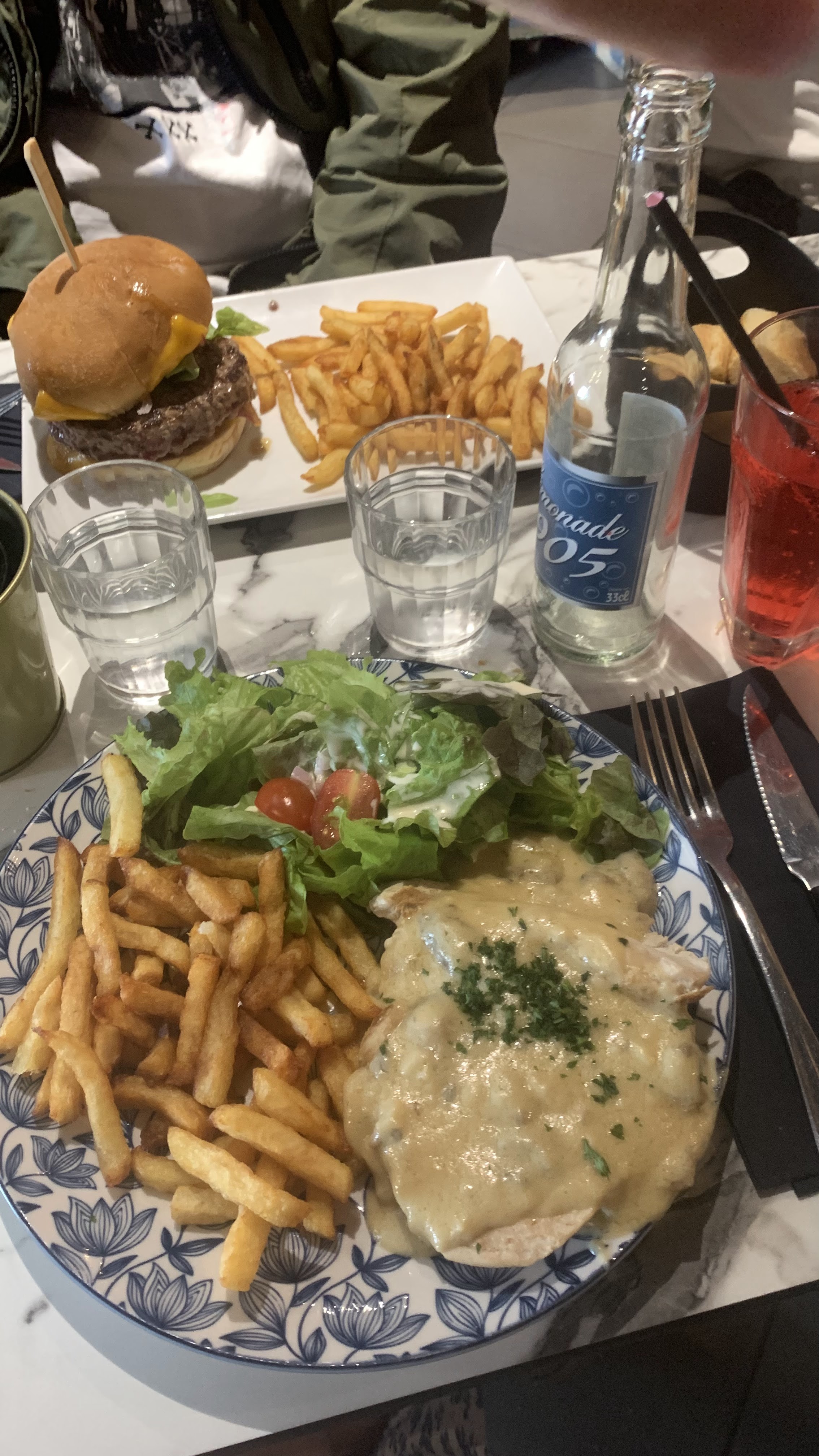 Malheureusement pour une note de 4,2 sur Google… je ne m’attendais pas à être servis différemment des autres. Facturation des sauces sans avoir été écrit sur l’addition et ni avoir été prévenu. La nourriture était bien, cependant l’escalope normande n’avait pas de goût, les frites sont dures comme des briques 😳, les prix et la boisson ?? Plus cher qu’à Paris 👀. Seule positif le Burger était pas mal.