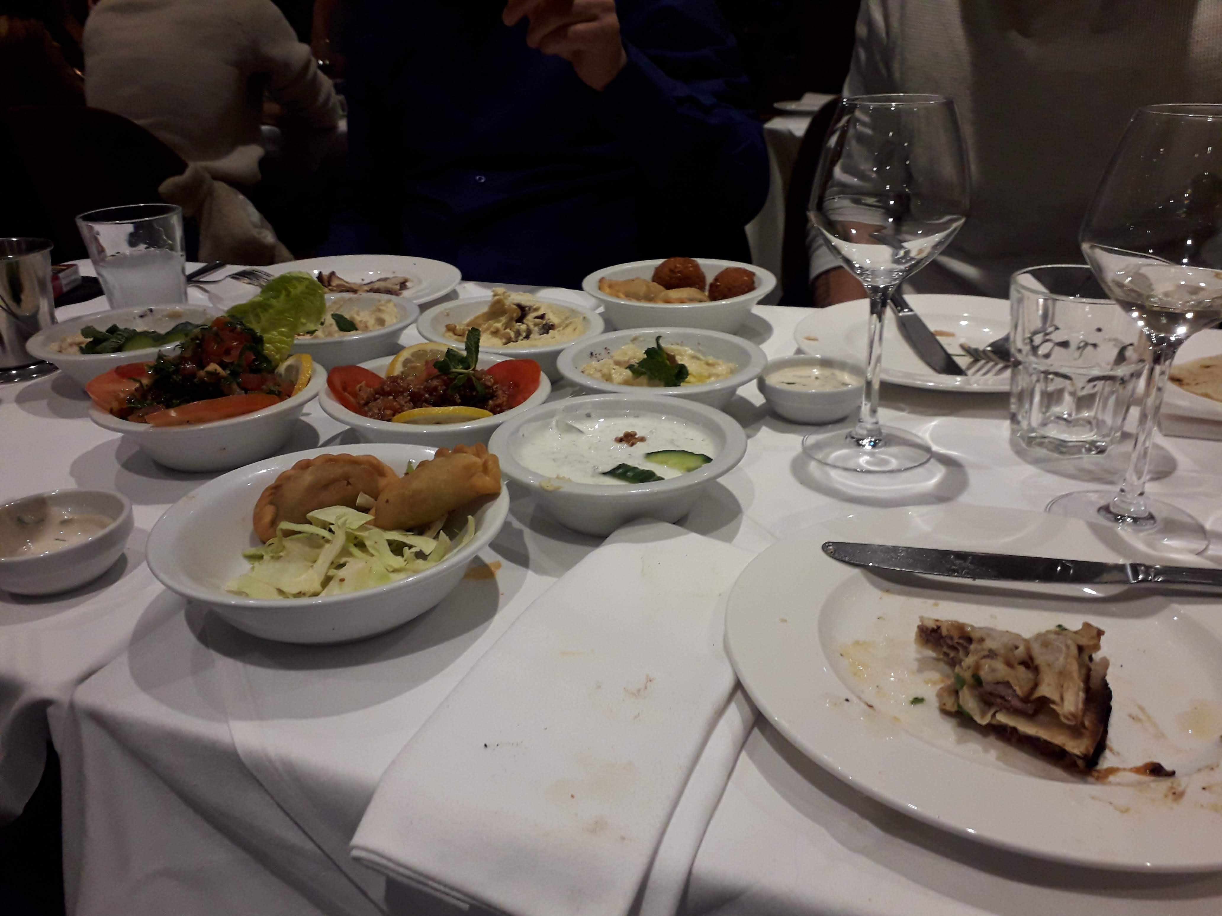 Serveurs agréables, plats bien présentés et copieux, nous avons pris le menu à 45, avec dix mezzés en entrée, un plat principal composé de brochettes, accompagnées de riz puis dessert. Un tout petit moins : pas de cuillères de service. Menu un peu cher mais globalement satisfaits