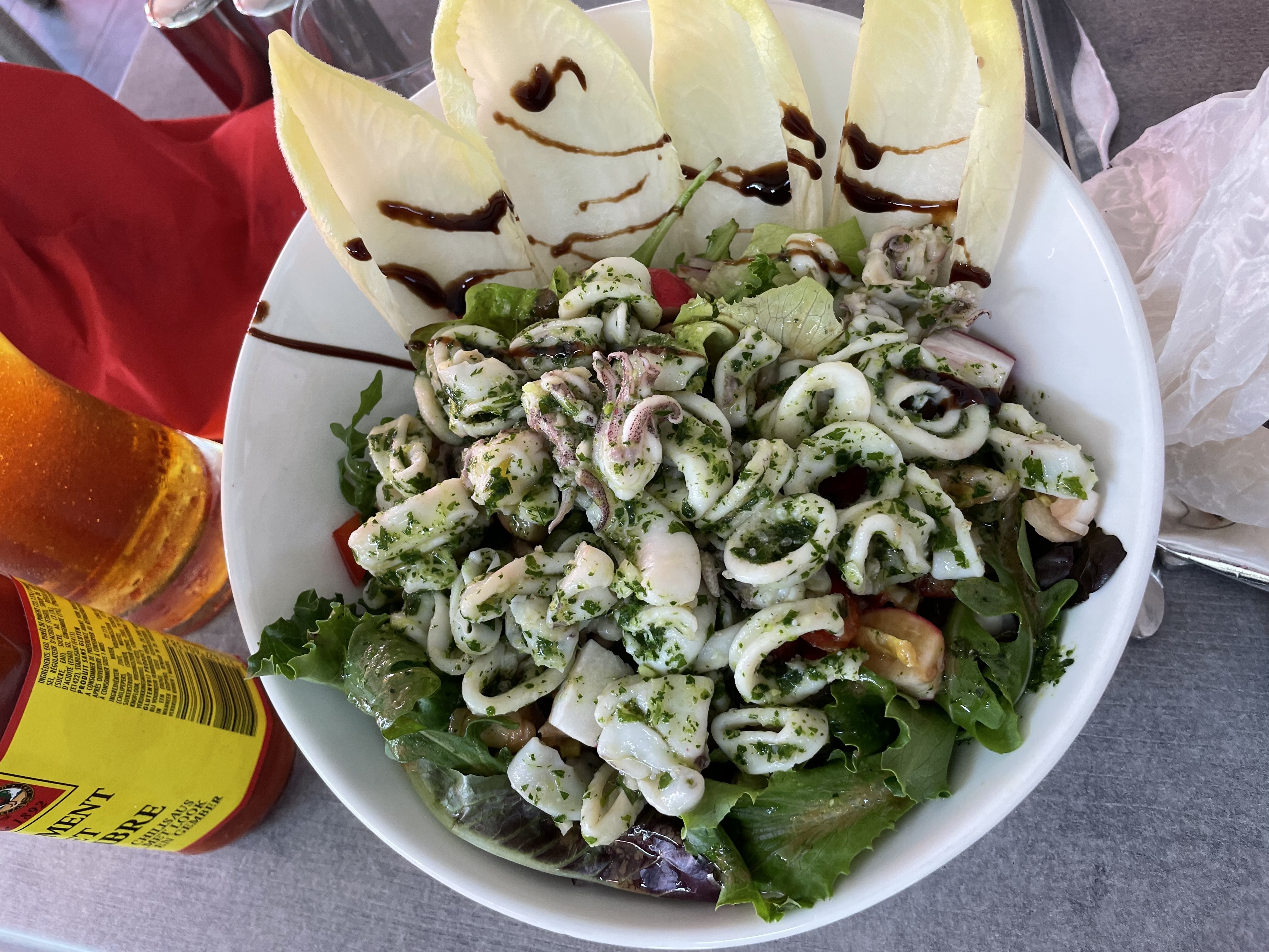Très agréable terrasse, qui se trouve sur le quai du port, personnel accueillant, bonne salade avec un petit dessert au top, un petit limocello pour finir, au top
