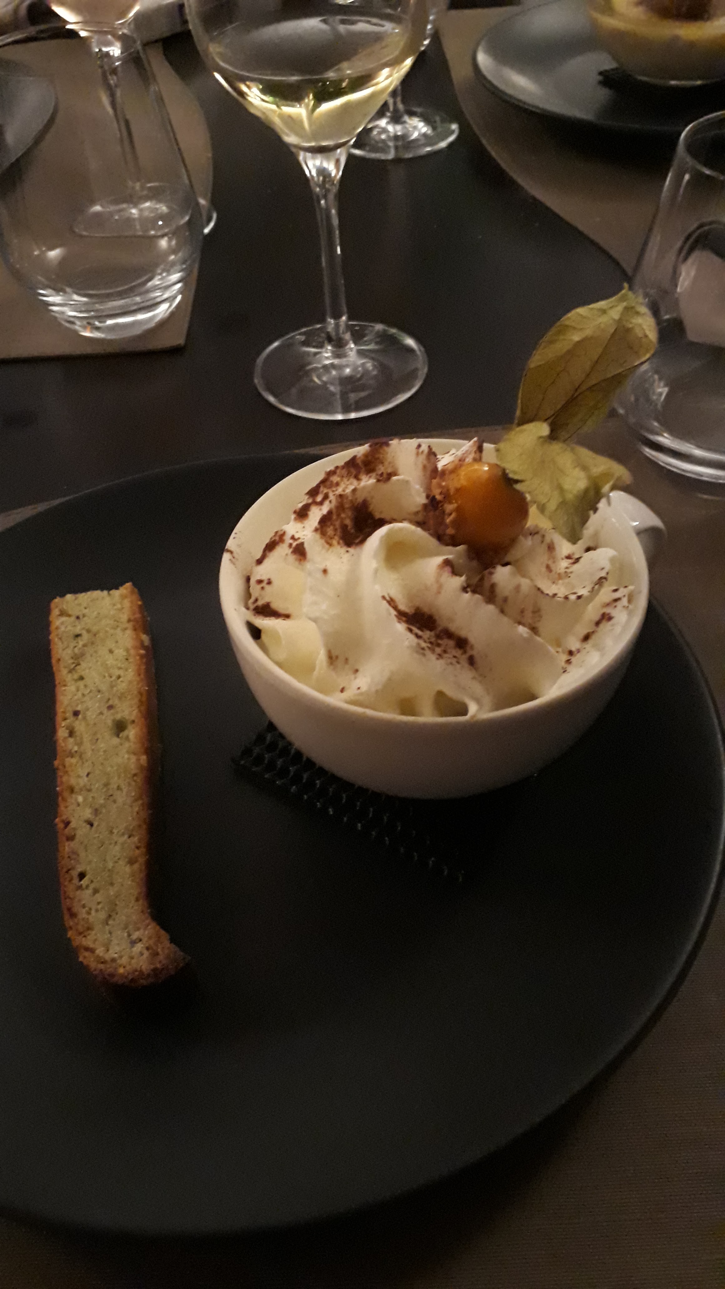 J'ai passé une agréable soirée au Physalis. L'ambiance tamisé des lumières extérieures et le calme du restaurant étais très agréable. Le service étais PARFAIT ! C'est un restaurant chic avec beaucoup de charme. Le repas étais divin. Le dessert, une crème brûlée à la framboise, une vraie petite douceur délicieuse où on demande cas se resservir. Merci au Physalis pour cette belle soirée. Nous reviendrons.