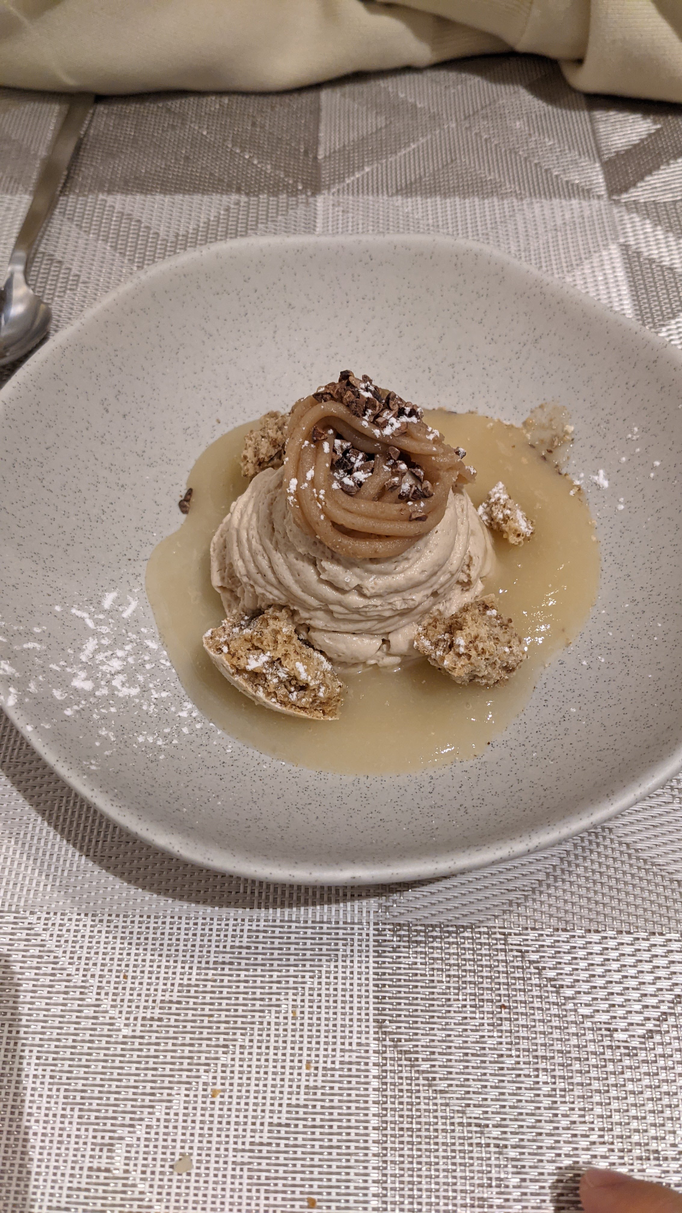 Absolument délicieux du début à la fin. L'atmosphère et le service étaient cordiaux mais vraiment chaleureux et accueillants. Bien que chaque plat soit parfaitement élaboré et délicieux au-delà de toute mesure, je dois mentionner les noix de Saint Jacques et la poire et châtaigne du Mont Blanc comme des expériences tout simplement transcendantes.