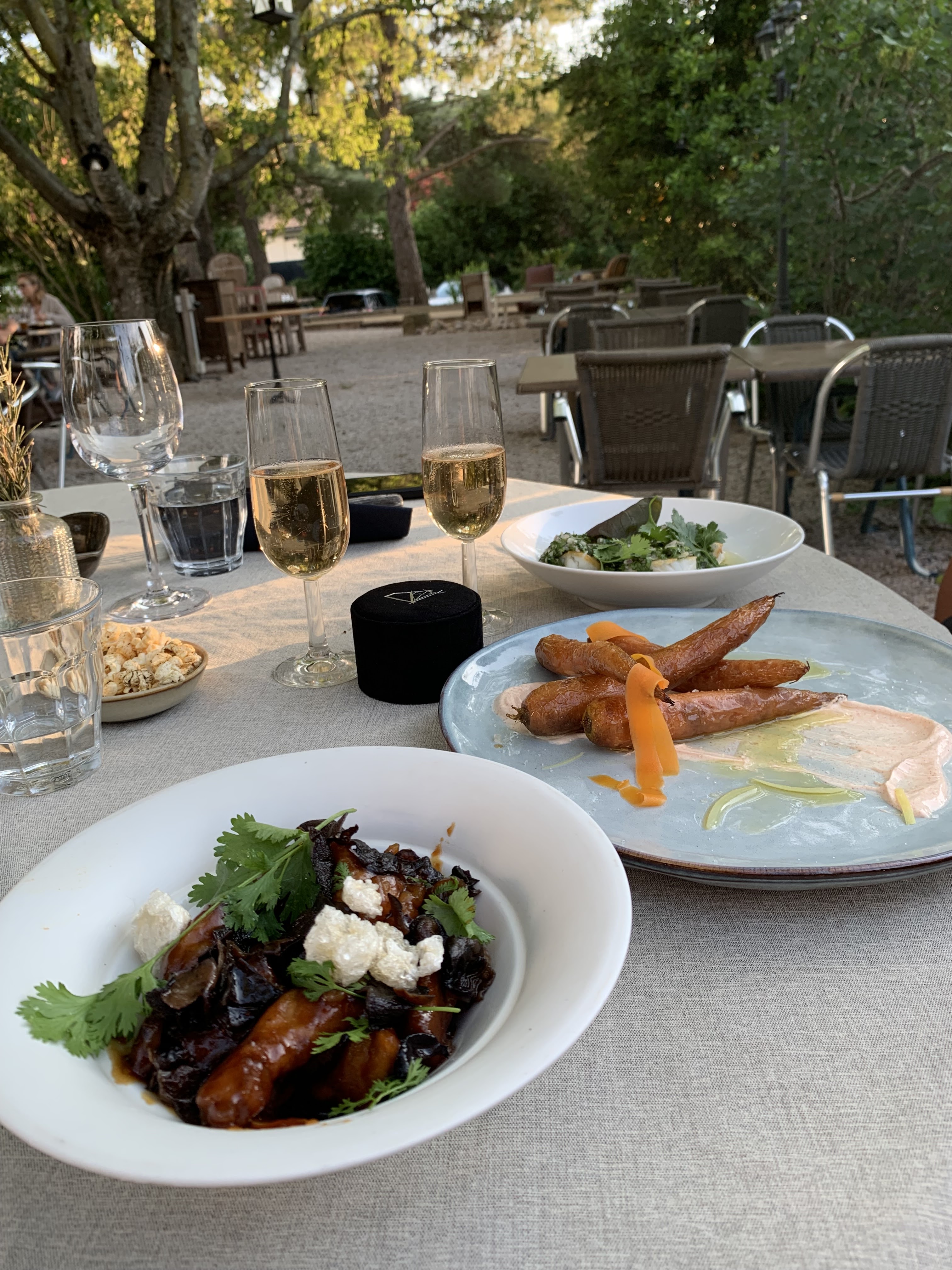 J'y suis allé le 5 juillet 2013 pour le déjeuner, venant d'arriver sans réservation. C'était excellent. Il y avait beaucoup de monde mais ils m'ont trouvé une table sur la grande terrasse sous le Micocoulier. La nourriture, le vin et le service étaient très bons. J'ai adoré la philosophie « La France rustique rencontre l'Asie » - une rupture bienvenue avec l'obsession de la France pour une cuisine gastronomique lourde et démodée. Je visite et vis en France depuis plus de 30 ans et c'est l'un des plats les plus innovants et les plus agréables que j'ai mangé depuis longtemps. Bravo