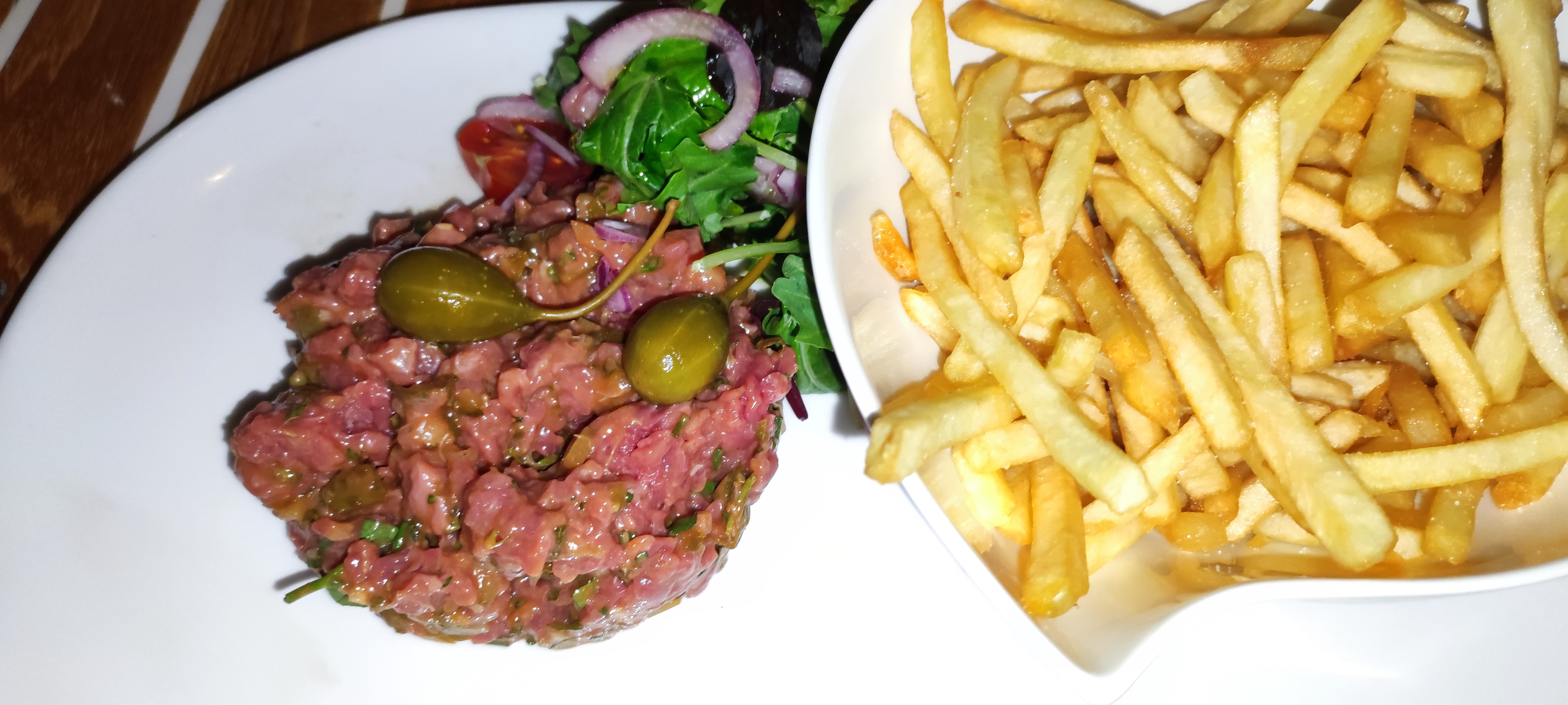 Cuisine pas trop mal, cadre sympa, service assez désorganisé... et serveuse aimable comme une porte de prison (heureusement serveur plus agréable). J'ai commandé un tartare de bœuf pas mauvais, mais ma grande erreur fut de demander du tabasco. La bouteille visiblement âgée et jamais fermée arrive, j'hésite, je prends quand même... et bien voilà 24h plus tard malade. Cramer la réputation du restaurant pour la fainéantise de gestion des condiments, ma foi, c'est étrange.