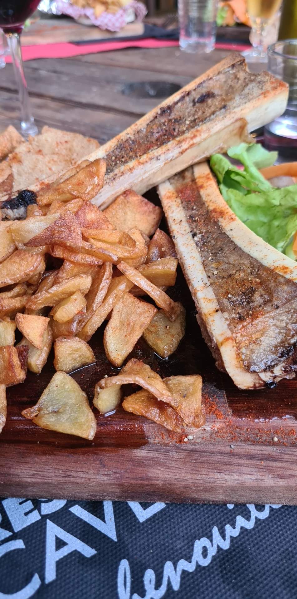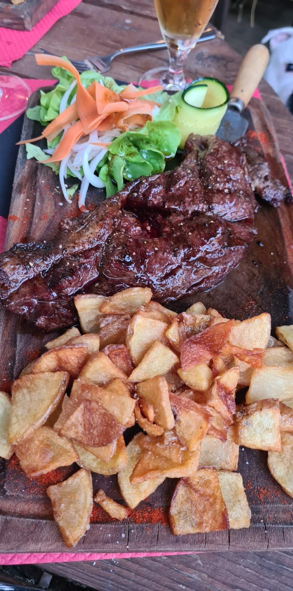 Entrecôte et côte de bœuf succulentes... Tout est cuit sur un barbecue chauffé au pieds de vigne. Le Service est très bien et le vin est très bon.