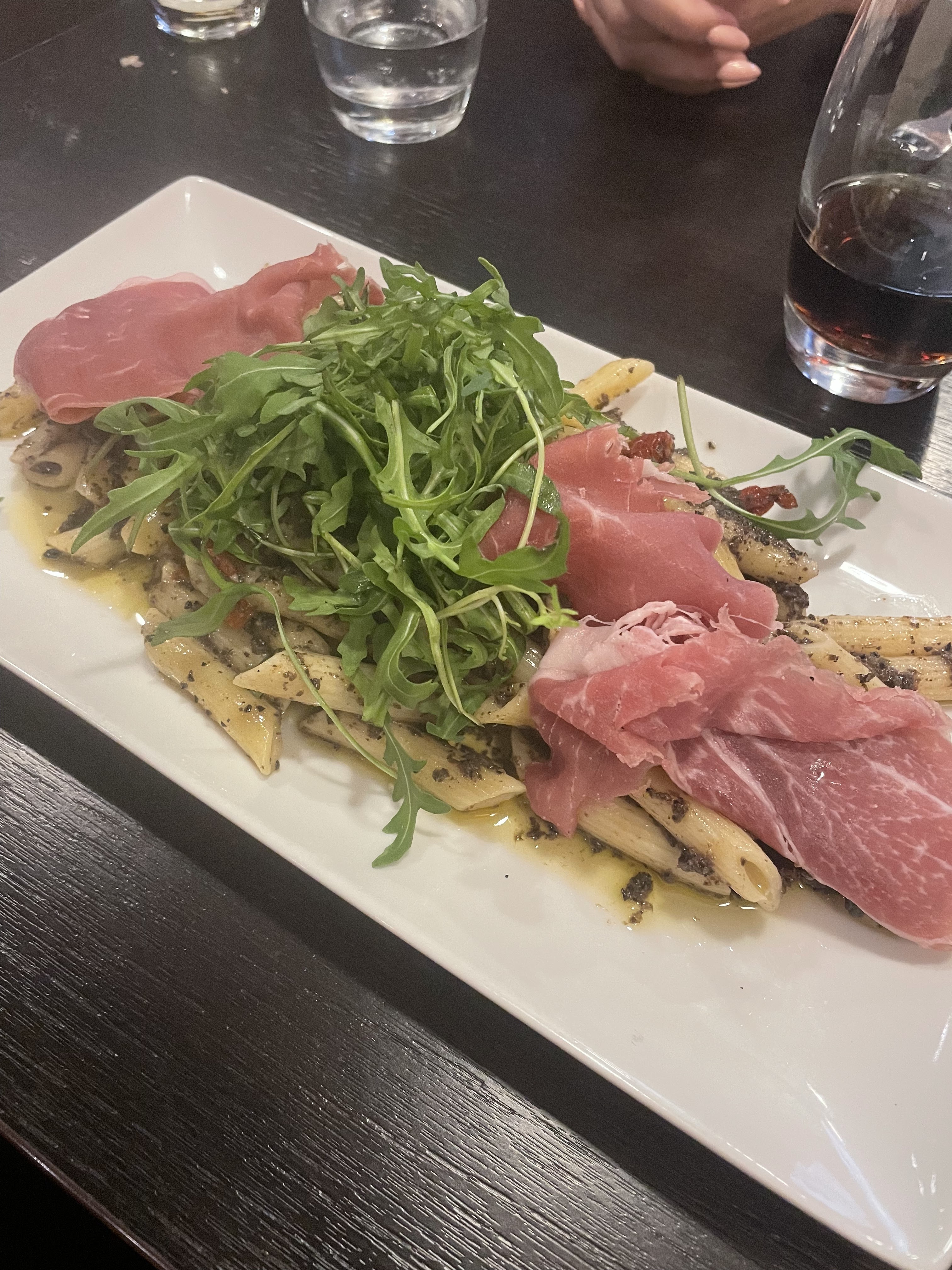 Je suis venu en Mai dernier avec des amis. J'ai pris en entrée la bruschetta du chef qui était composé de parmesan tapenade d'olives noire et de jambon de parme avec de la roquette et de la vinaigrette c'était excellent première fois que je goûtais une bruschetta et je suis pas déçu. En plat j'avais pris Penne à la Tapenade d’olive noire , roquette et Jambon de Parme qui était aussi très bon. Franchement pas de u de ce restaurant qui m'a été recommandé par Google. Je le recommande