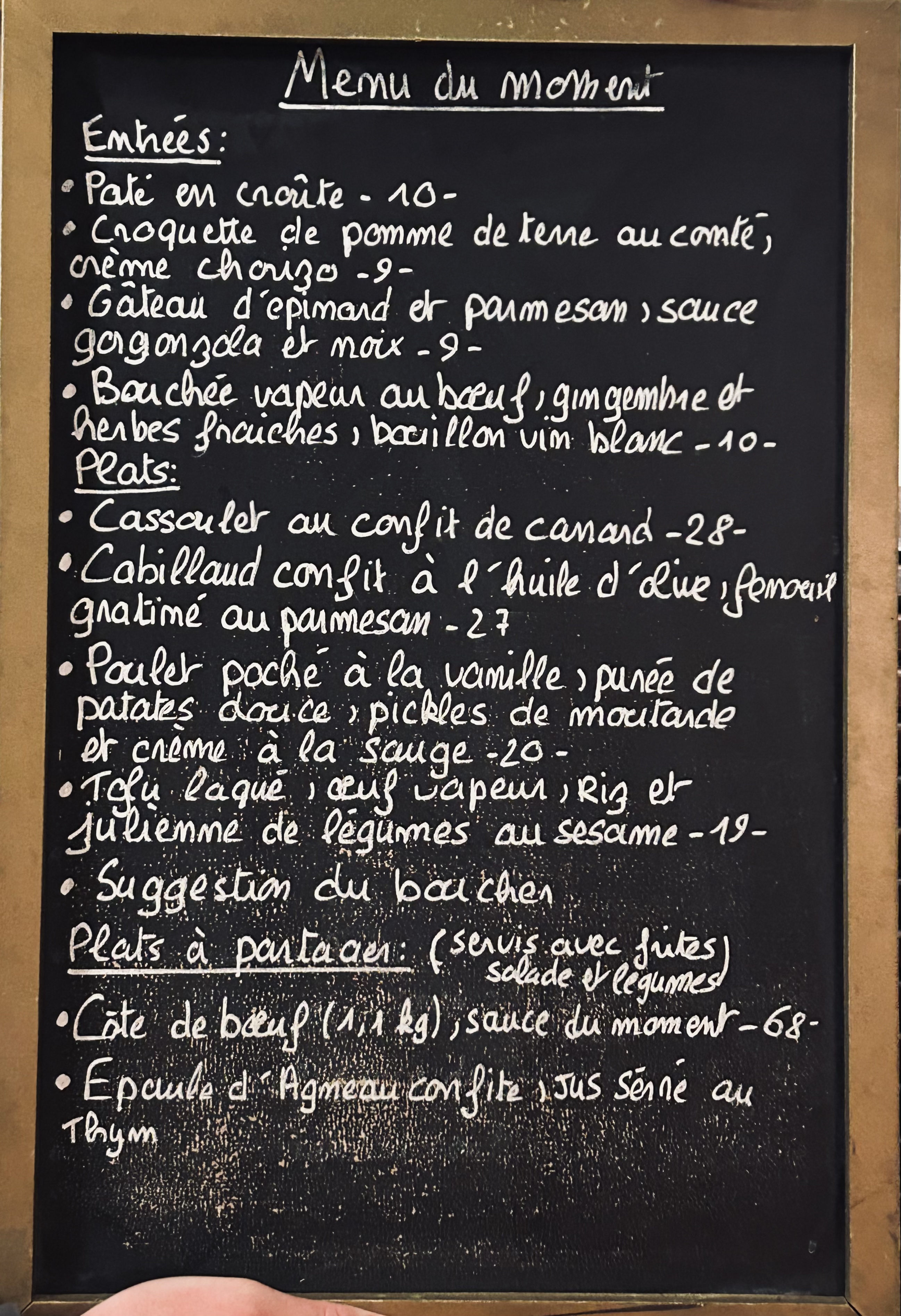 Excellent :) Un souri d'agneau redoutable, des frites maisons délicieuses et tout pleins d'autre plats riche en saveur et originalités selon les arrivages et les envie du (des) cuisto. Accueil charmant. Budget 30/40 euro par personne très bon rapport qualité prix. On ce régale!