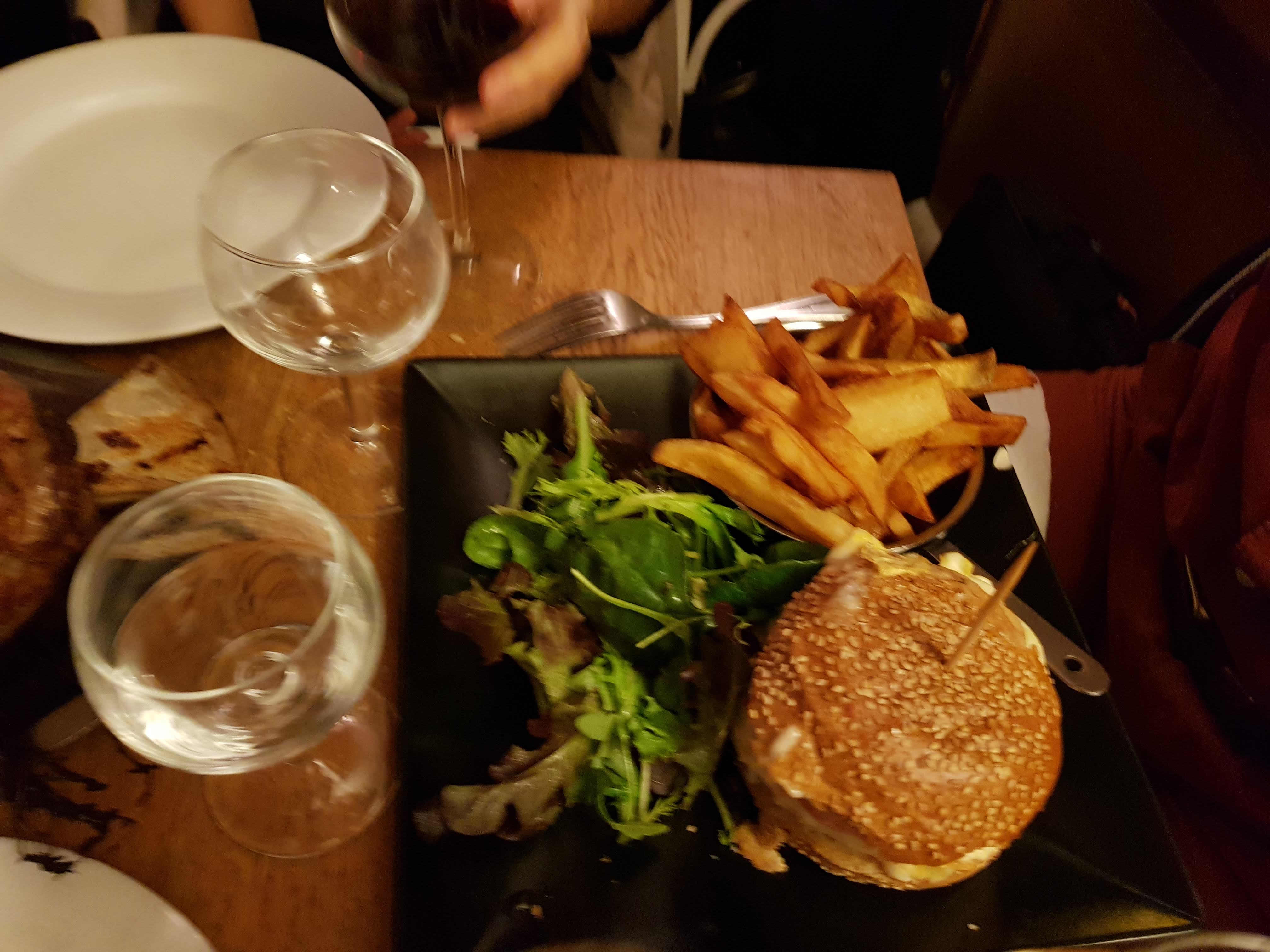 Date : 17/04/2019 Occasion : Dîner entre potes Super adresse ! Lorsque je suis arrivé (en avance, comme à mon habitude), la salle était presque remplie et des gens dînaient tranquillement sous l'éclairage doux de la salle. De l'extérieur, l'adresse respire le chaleureux et la devanture bleue conforte cette impression, tout comme le bois de l'intérieur, un plaisir pour les yeux. La carte est intelligemment constituée : végétarien, carniste, à partager, à picorer etc. Les produits sont frais, le goût y est intense et l'accompagnement par le vin est judicieux. Après une entrée partagée (une burrata), j'ai opté pour une épaule d'agneau à partager tendis que mes amis ont pris tout deux des burgers (quelle originalité). L'épaule nous est arrivée crépitante du four, les morceaux d'agneaux se défaisaient d'eux-même et la pièce, imposante, humait diablement bon. Mes amis ont goûter et apprécié la pièce, accompagnée de frites. Il ne manquait qu'un peu de salade pour équilibrer le tout ! En dessert, nous avons pris un tiramisù qui nous avons tous partagé, fort goûteux. Je recommande cette adresse et j'y retournerai sûrement, l'endroit y est si paisible et si agréable qu'on y resterai des heures à déguster du vin durant les chaudes soirées d'été. Bon app' ! Inst. : Anlayvgirard