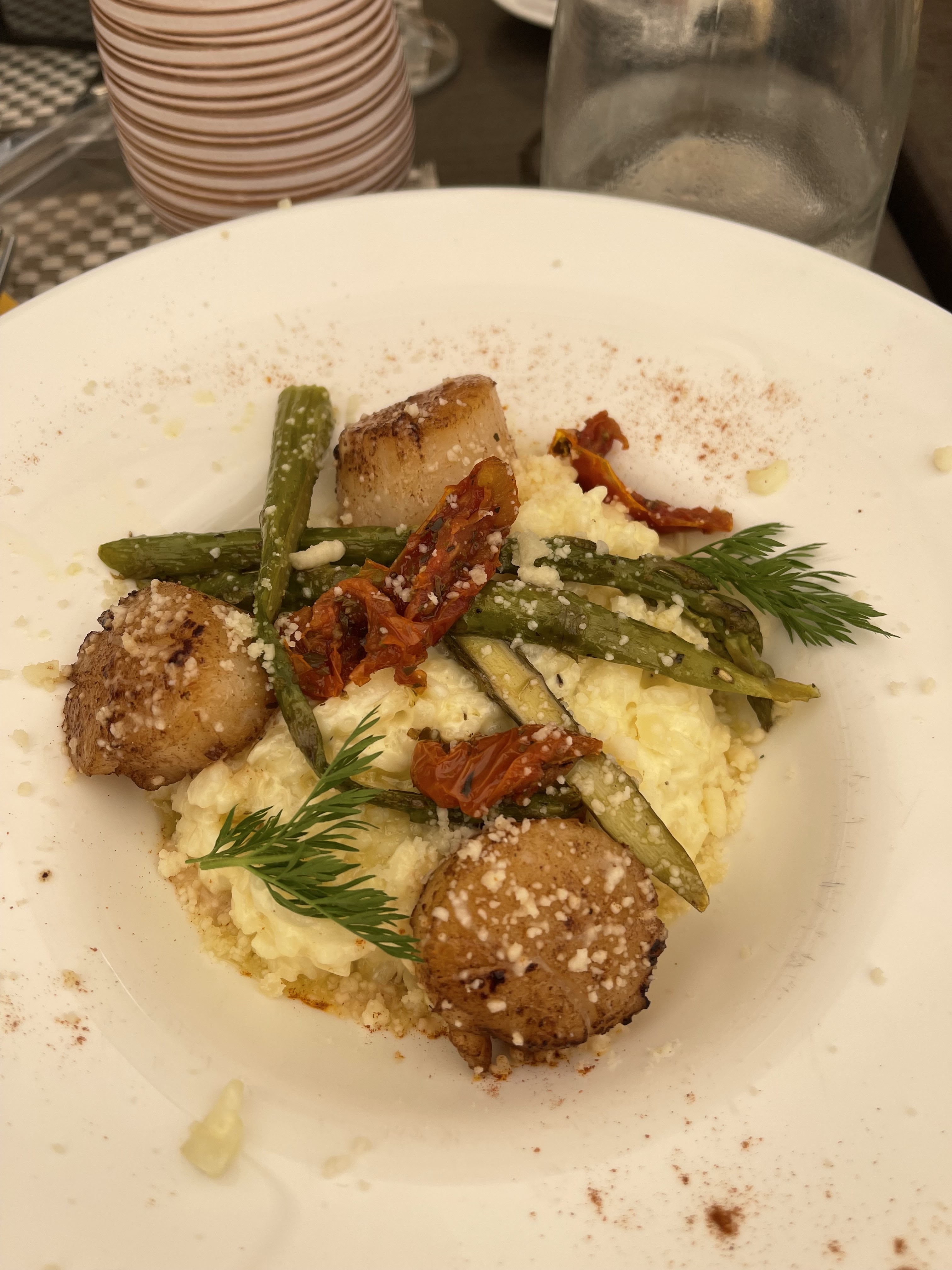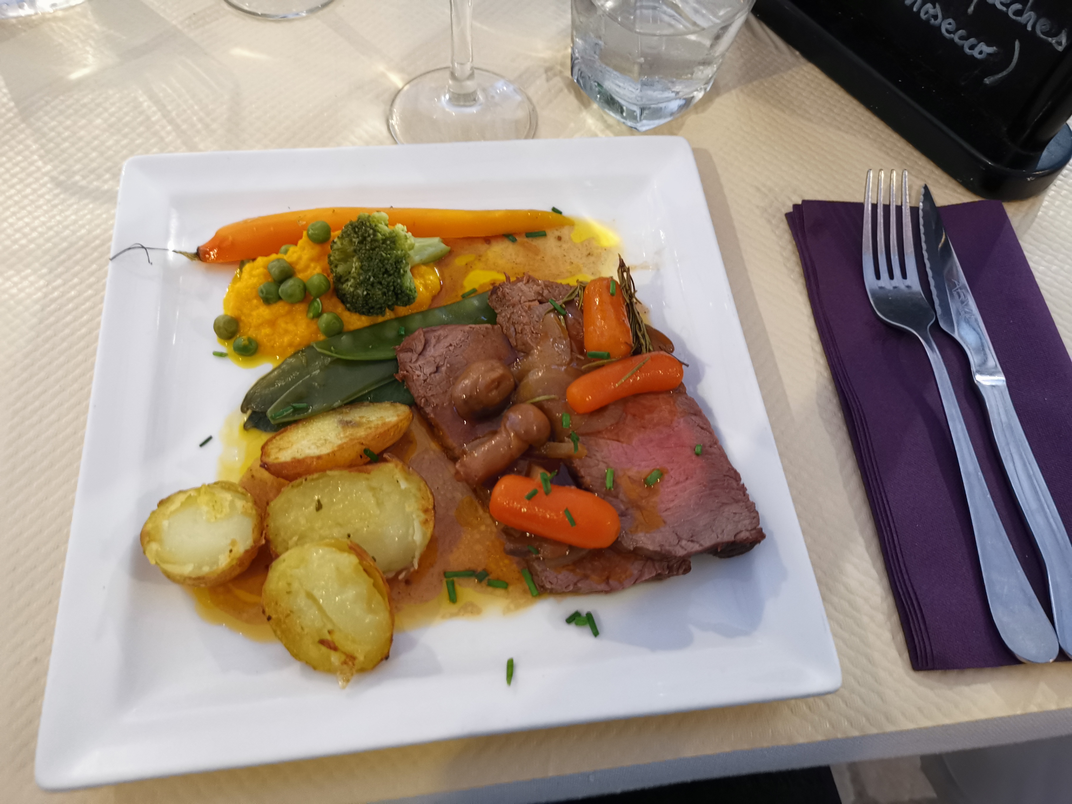 Tellement agréable d'avoir un restaurant avec une carte française bien équilibrée dans une mer de pizzas et de burgers. Personnel attentif et sympathique (je prenais pour mère et fils). Les tables étaient joliment dressées et le menu offrait beaucoup de choses. Ma femme et moi-même avons mangé des fleurs de courgettes farcies au crabe et au lieu noir. J'ai ensuite eu la Bavette de Aloyau, joliment cuisinée avec une sauce au vin rouge et au poivre. Ma femme a pris un risotto de veau qu'elle a beaucoup apprécié. Recommandé.
