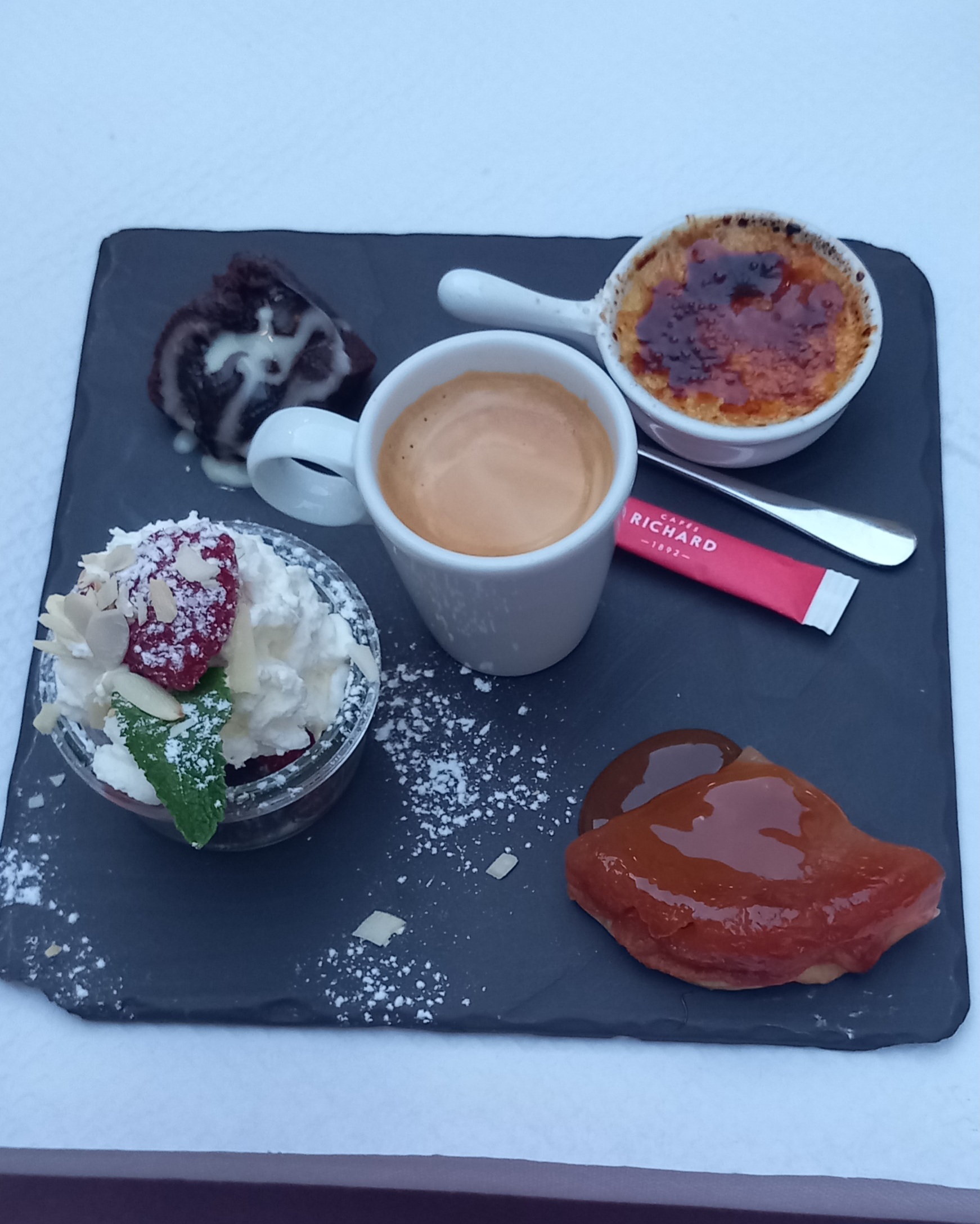 J'aime Le Pigeonnier. Je n’y suis allé que deux fois, mais les deux fois, la nourriture était bonne, le service sympathique et ponctuel, et l’ambiance agréable (cela signifie que nous avons mangé dehors sur l’une des jolies petites places de Vence). Lors de ma récente visite, mon entrée était constituée de fleurs de courgettes farcies à la mousse de crabe – ce qui est peu inhabituel – et en dessert, j'ai eu le café gourmand, toujours fiable et agréable (voir photos). Nous reviendrons!