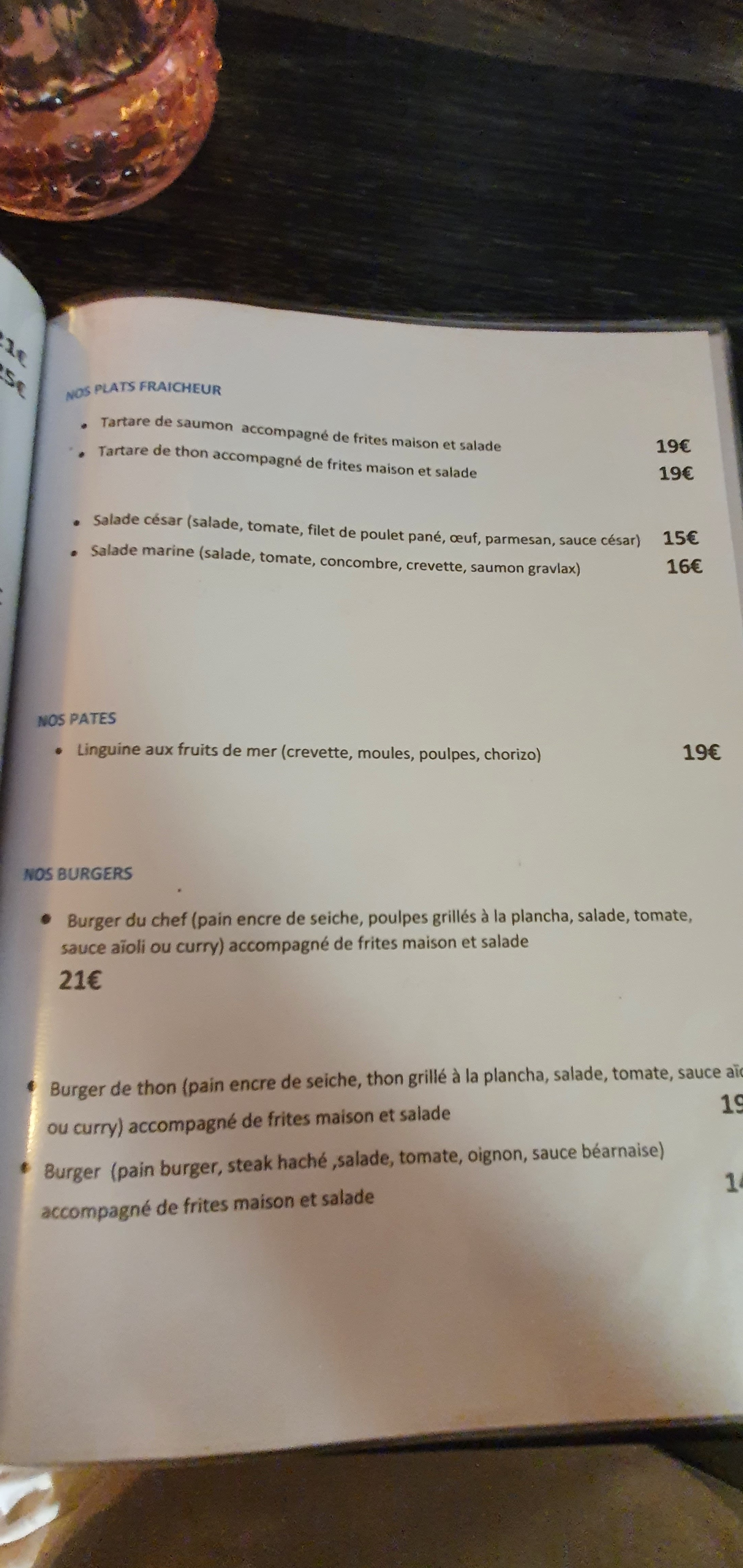Dîner hier Cuisine excellente On avait oublié notre commande un peu déçue j'ai pas pu prendre de dessert du coup Bar à jeux à côté très bruyant 😟😟 Évitez la terrasse à partir de 21h00 Sinon à l'intérieur calme et propre Un peu cher 66€ pour 2 sans dessert et sans entrée mais cuisine excellente 🤩