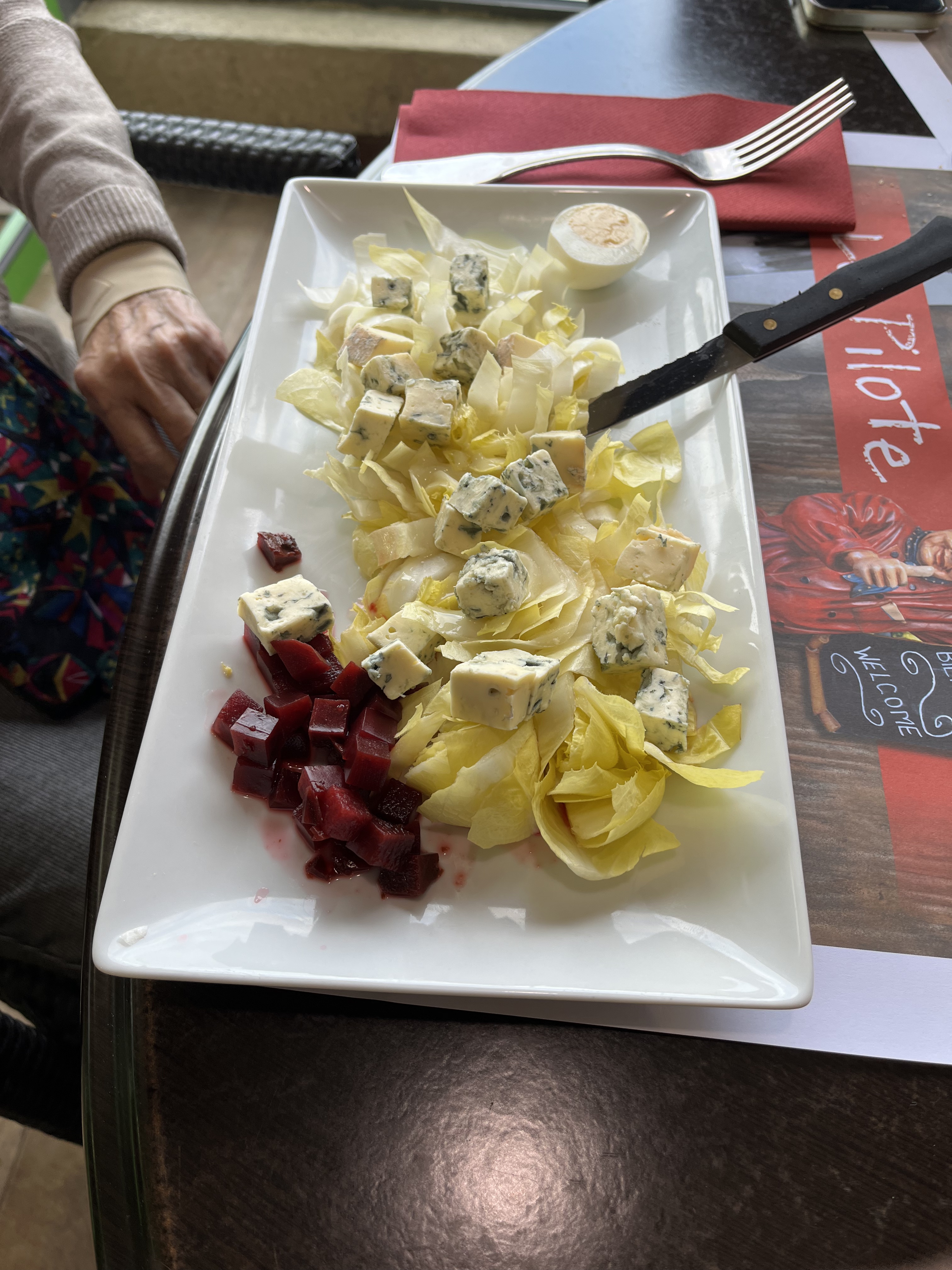 Pas terrible et cher plat pas assaisonner fade haricots verts pas cui et accompagner d une andouille et tout sa juste poser dans l assiette sens sauce rien juste un bout de pain prix 16 e a se prix la je fait la même assiette chez moi et pour moins cher déçu