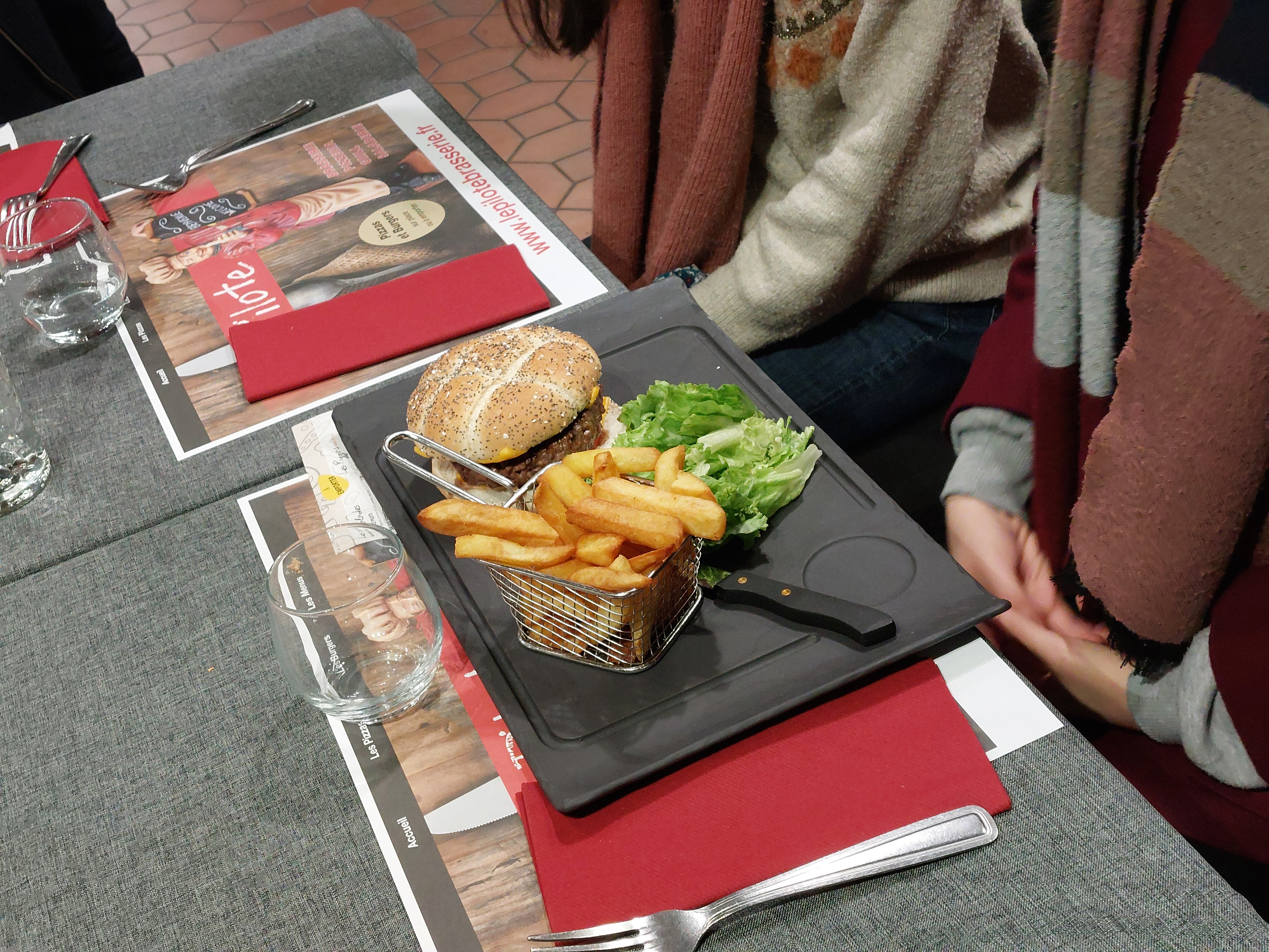 En terrasse aujourd'hui table 60 Les salades sont copieuse et excellentes Mon fils n'a pas pu finir son hamburger maison je l'ai aidé : trop bon . Très bonne équipe excellent service . Bref je recommande.