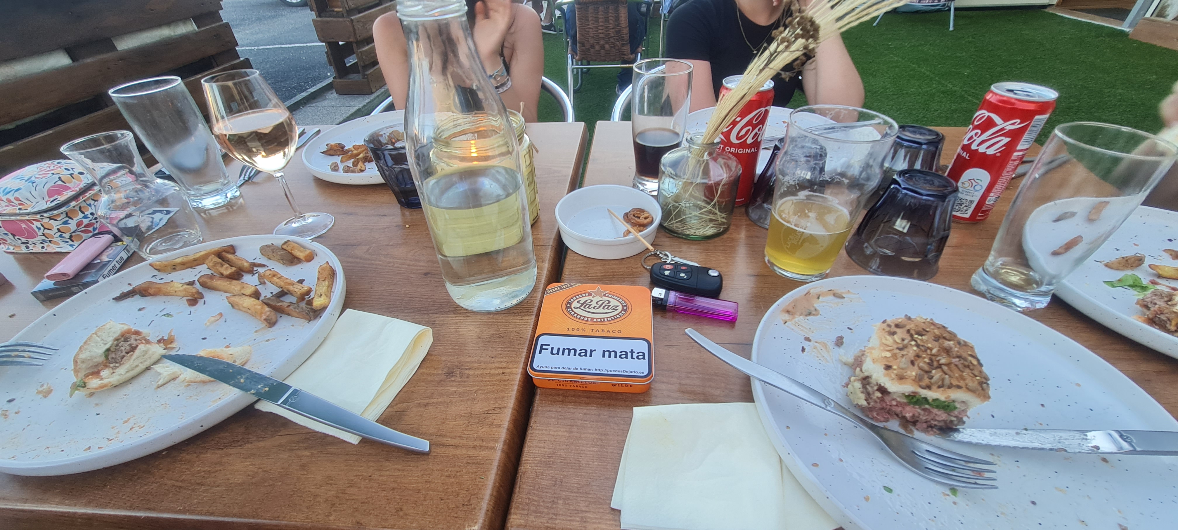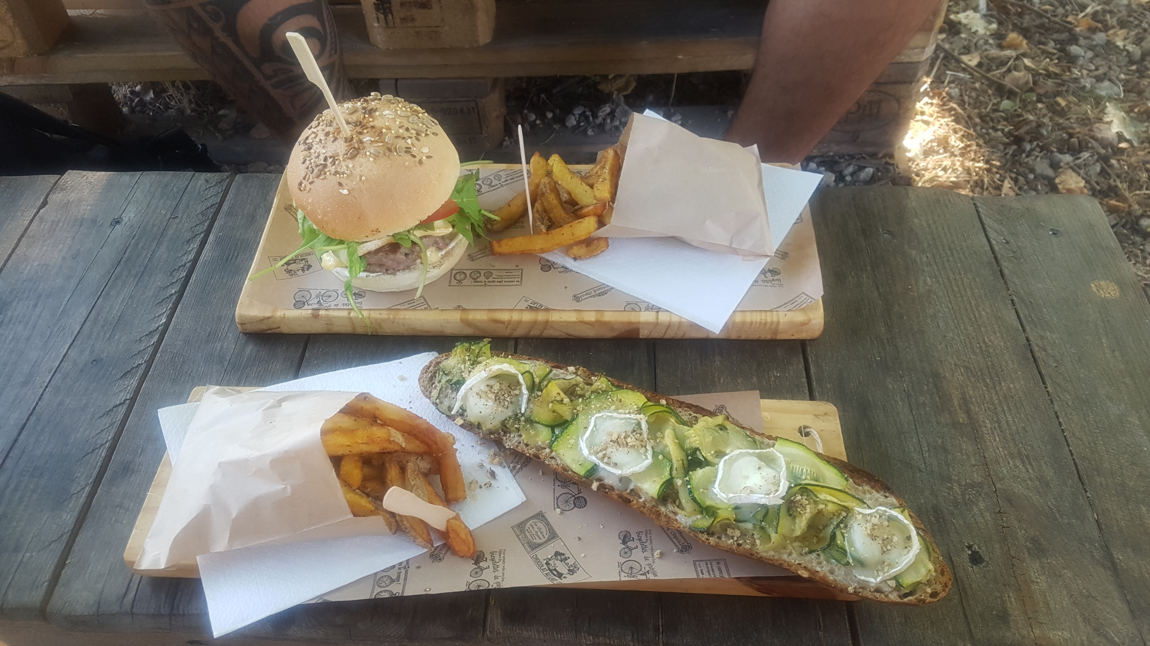 Délicieux burgers, bien installés, à l'ombre au milieu des pins.