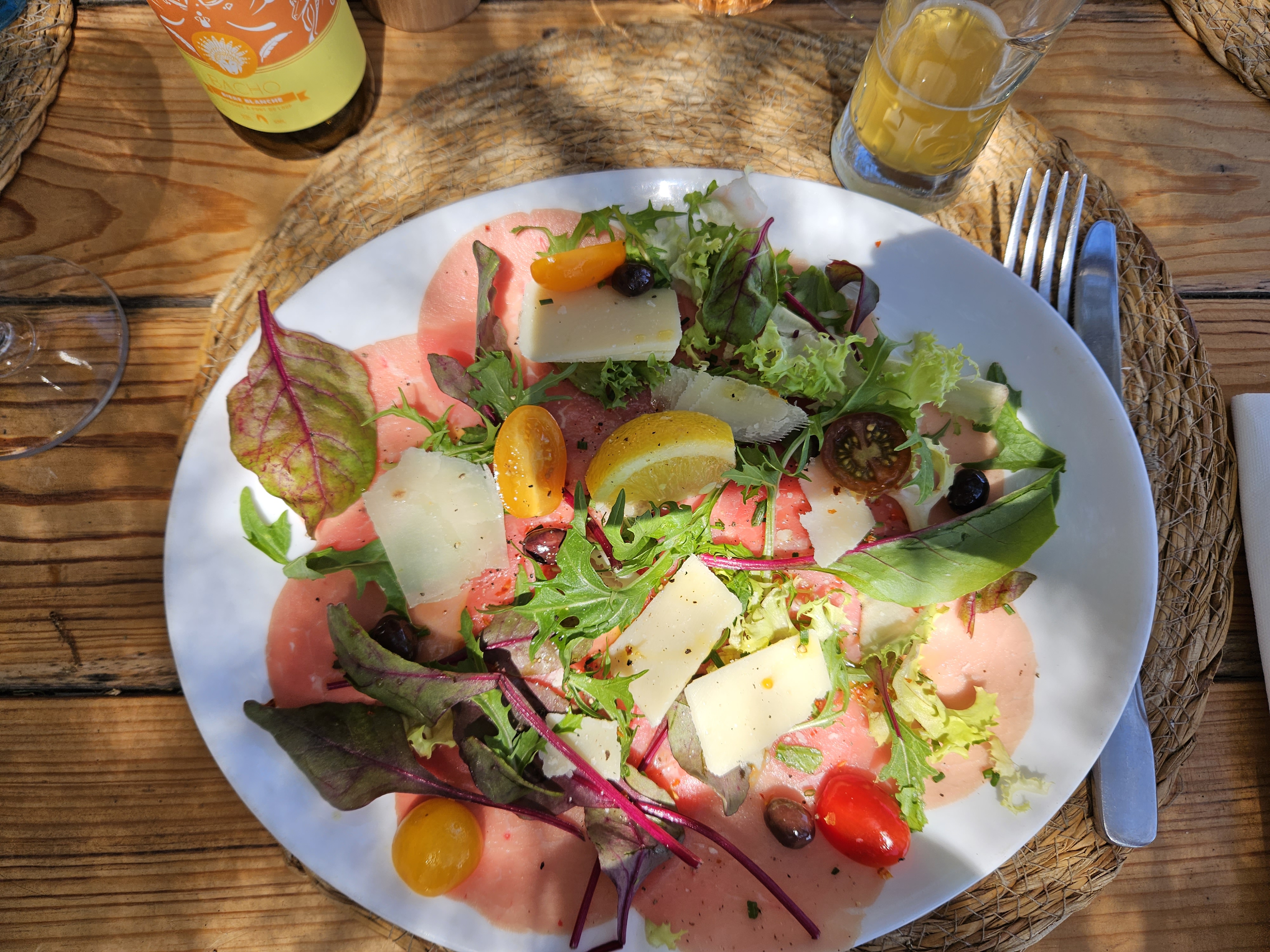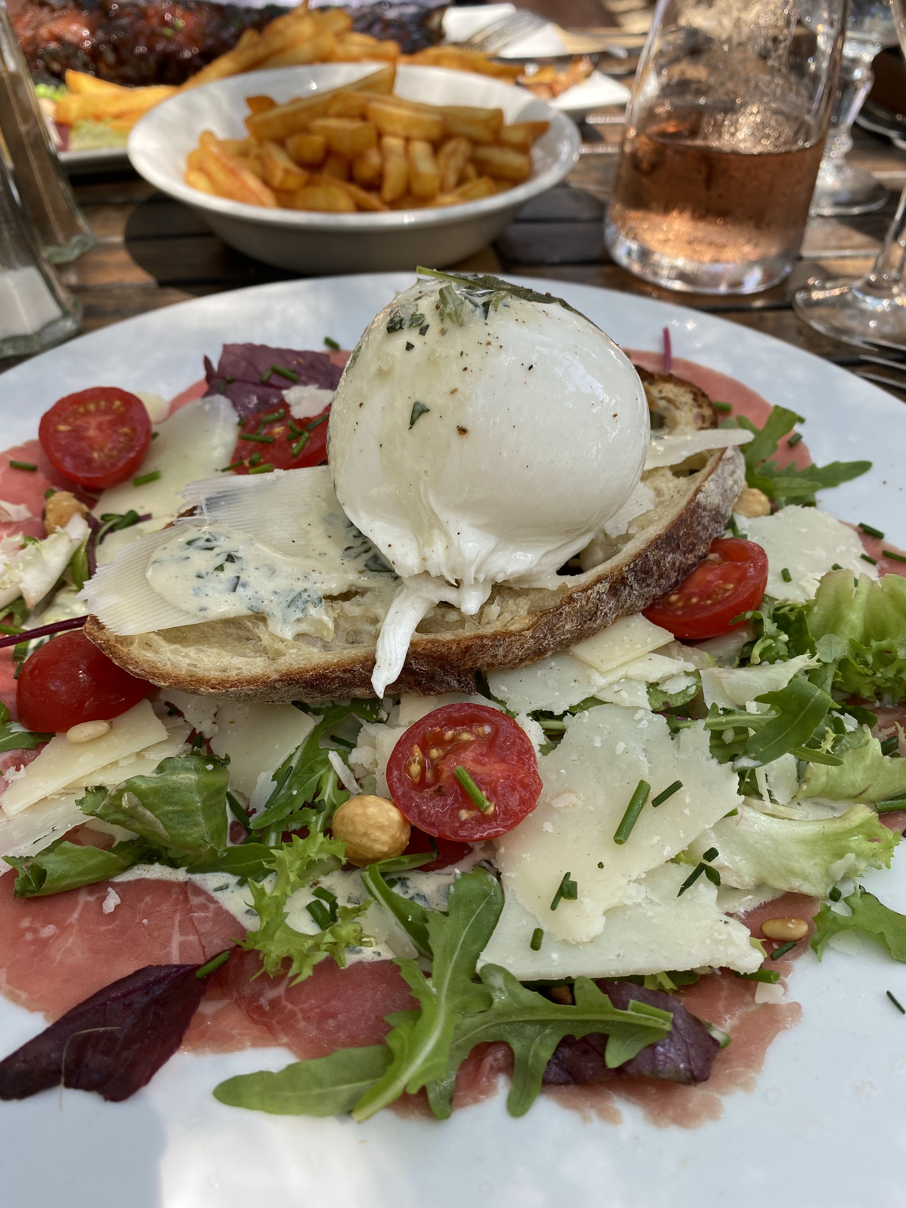 Magnifique spot en bord de plage, vue sur Saint Tropez. La viande est frite sur le grill, les côtes levées sont le produit phare en ce qui me concerne. Délicieux carpaccio à la burrata et poivrons grillés à la burrata.