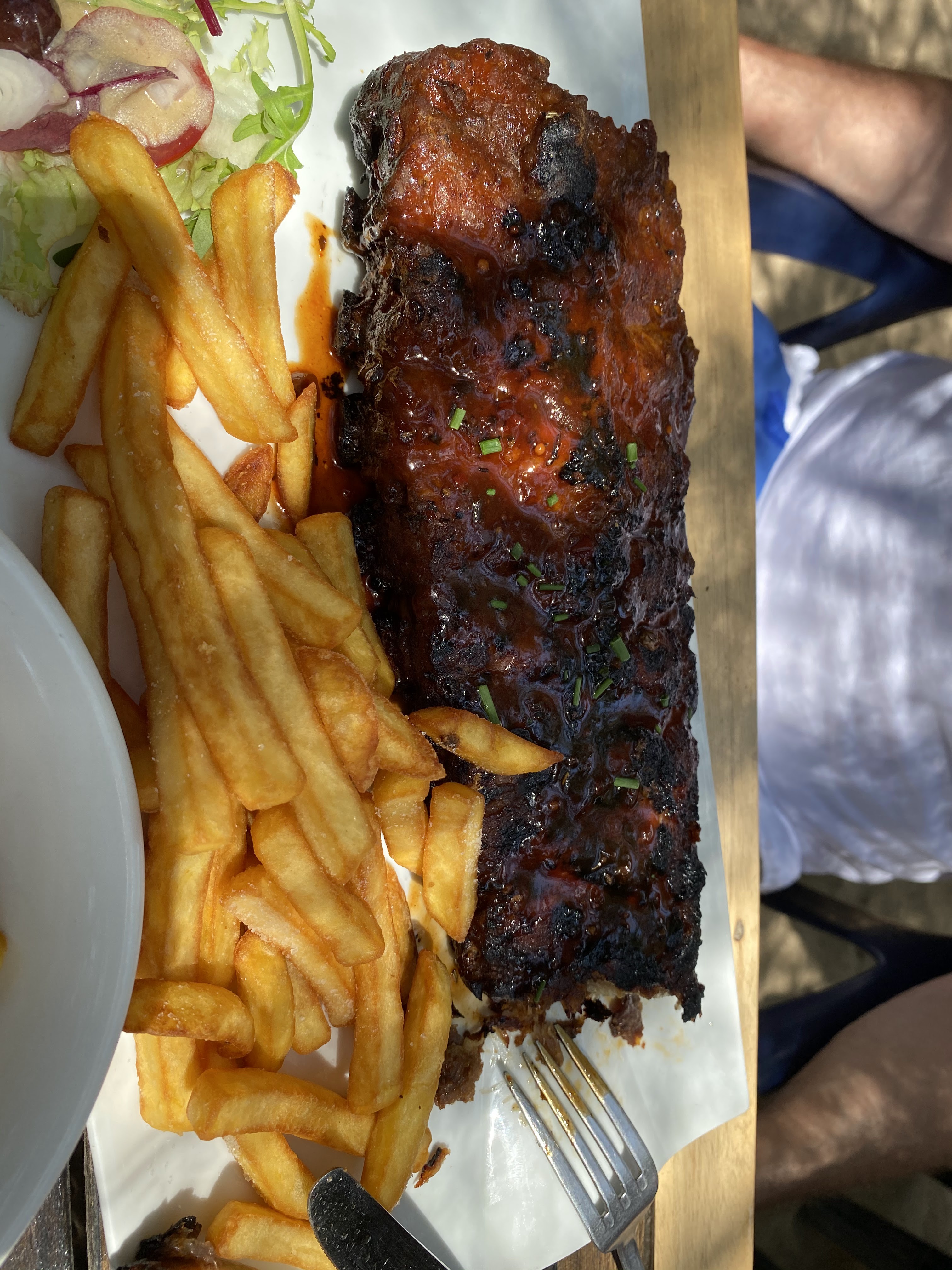 Situation très agréable sous les tamaris ribs délicieux et copieux donc bien