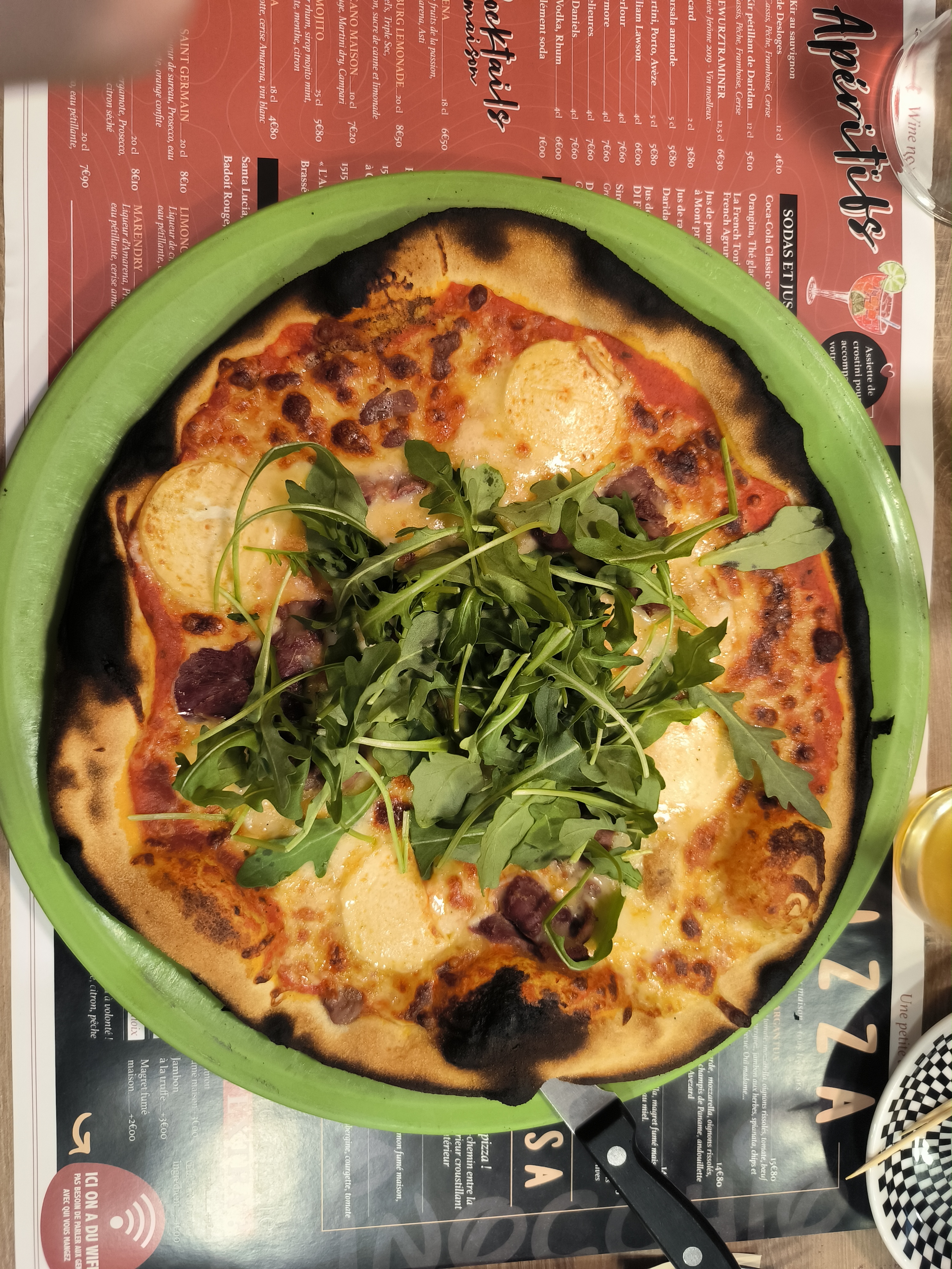 La pâte à pizza n’est pas terrible, trop fine, pas de rebord moelleux autour, on est loin des pizzas napolitaines, plus proche de la romaine mais c trop fin . Les ingrédients sont bons , par contre il y a 3 pizzas italiennes sur 12 pizzas proposées, le reste c’est des mixes de cuisine française sur une pizza, gésiers, canard, rillons, pommes de terres, crème moutarde…. Je suis pas fan de ses mixes, j’aime l’Italie et ses recettes de pizzas.