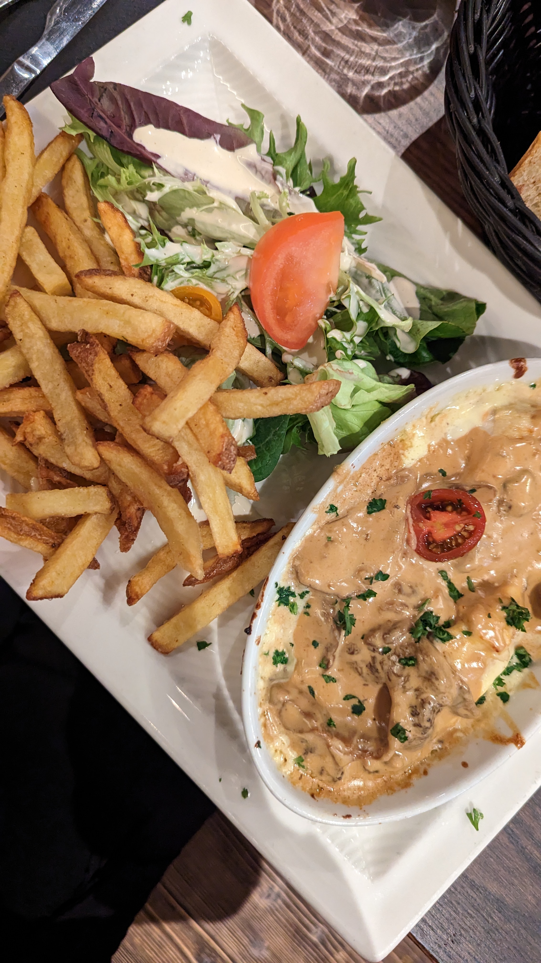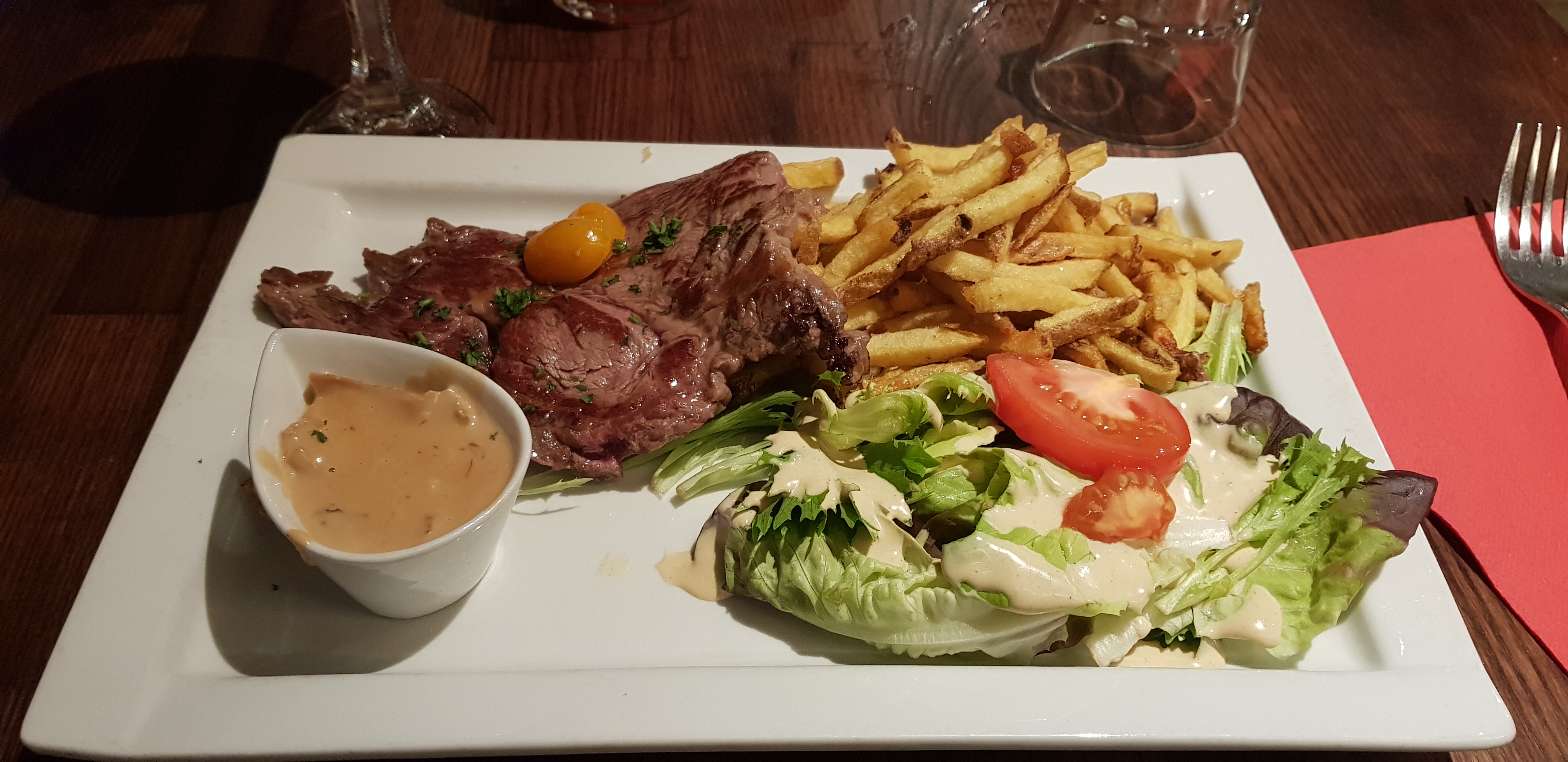 Excellent, délicieux, sauf le dessert qui était un fondant au chocolat mais en fait un moelleux car trop cuit pour un fondant.