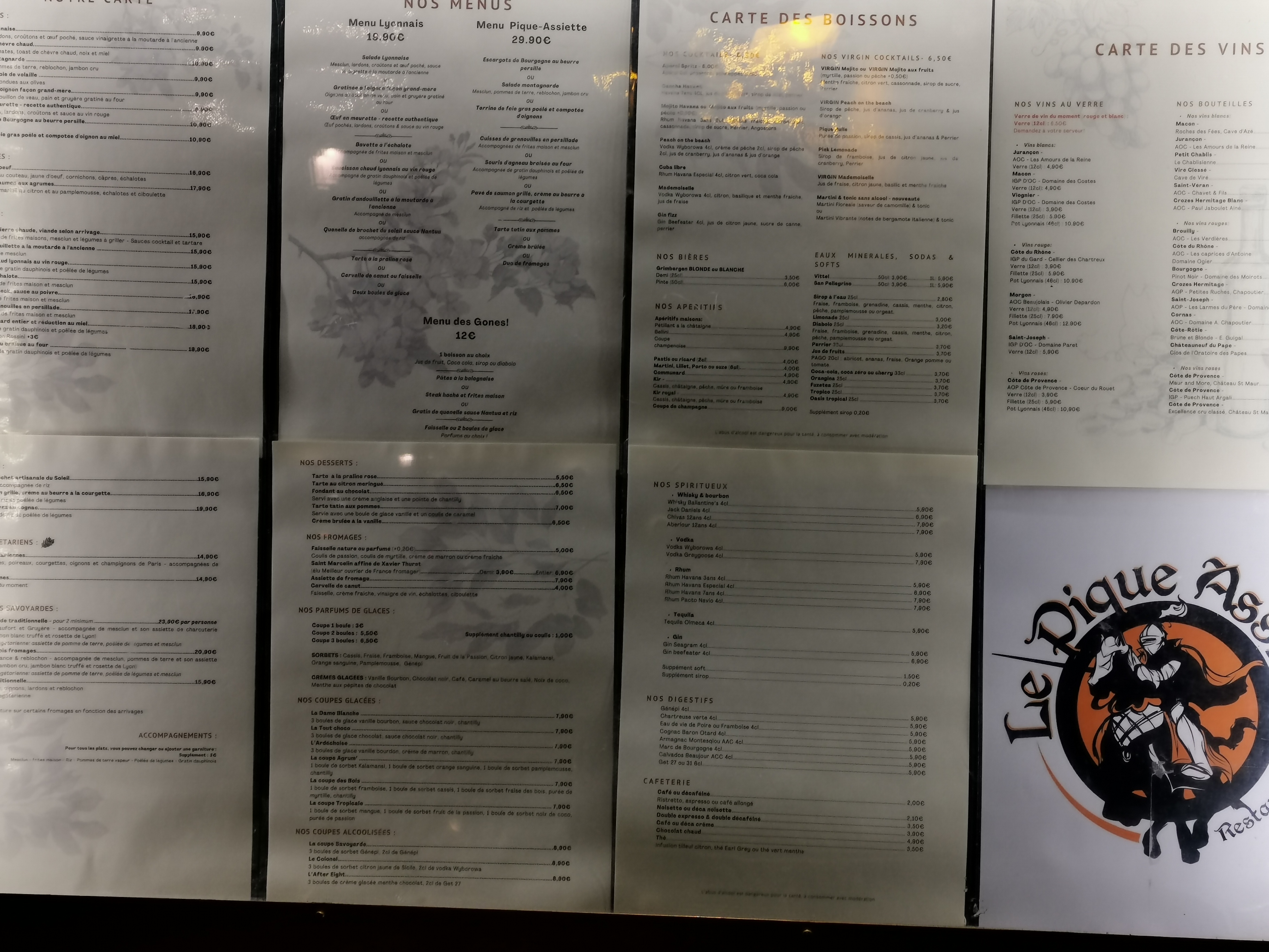 Nous avons diné au pique assiettes ce soir l'expérience était décevante. Le repas était correct mais ne faisait pas honneur à la cuisine Lyonnaise. Le service lui était plus que déplorable, le but des serveurs était clairement de libérer la table pour le second service. Les apéritifs ont été servis en même temps que les entrées. Les assiettes débarrassées avant que nous ayons finis les plats et les verres de vin retirés de la table sans que la bouteille ne soit terminée. Nous comprenons bien que les serveurs ont des directives pour nous pousser à partir et qu'ils n'en sont pas responsables mais la communication et la bonne humeur n'était pas non plus au rendez-vous