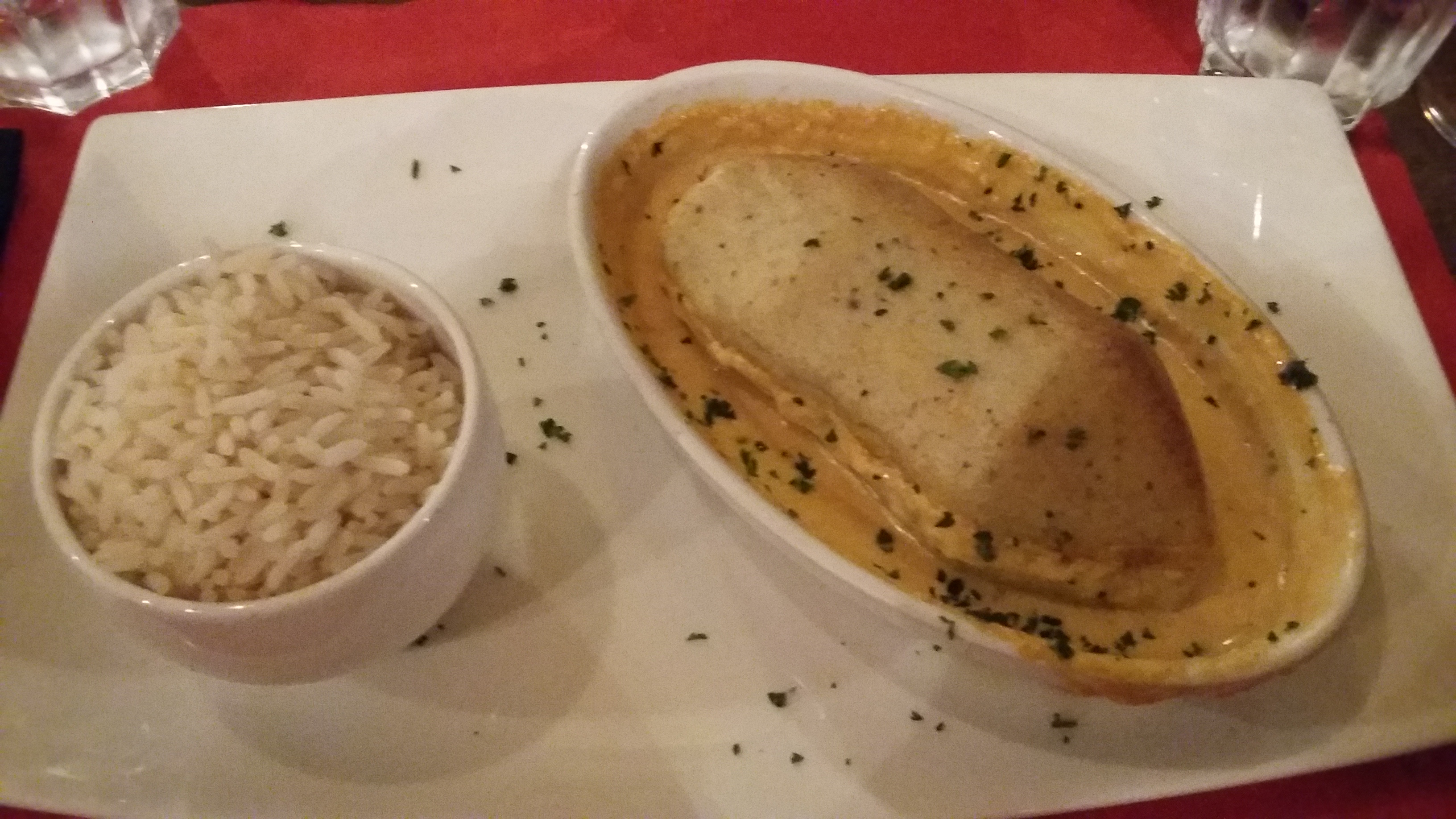 La quenelle était bonne, bonne sauce Le riz un peu trop basique à mon goût Bonne tarte au citron